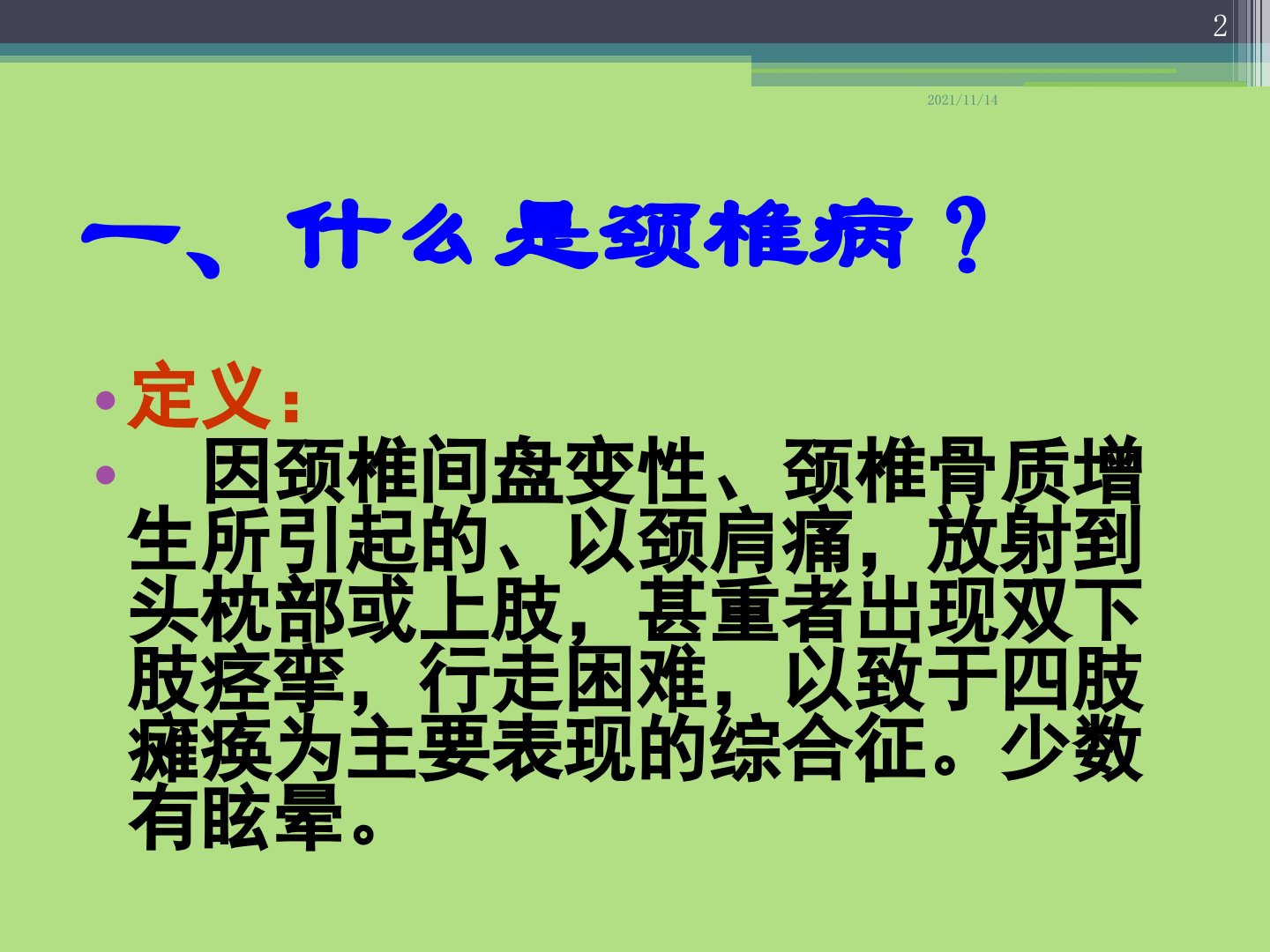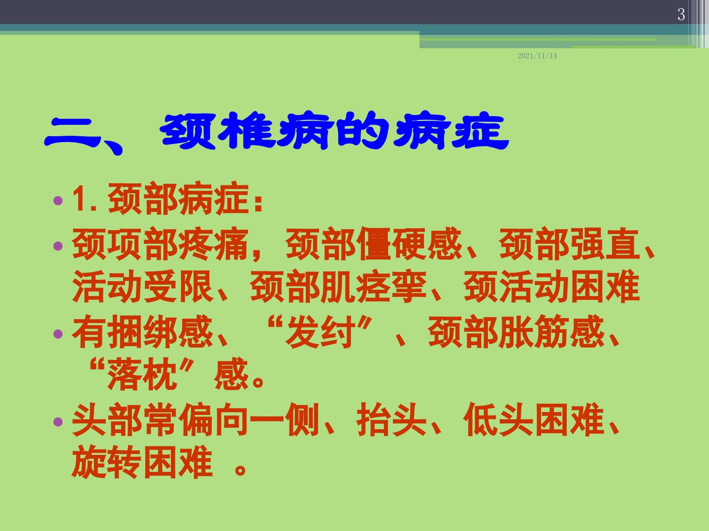 摘要颈椎病是因颈椎间盘变性、骨质增生引发的综合征主要表现包括颈肩痛、四肢瘫痪等少数有眩晕。病症多样包括颈部、上肢、下肢病症以及眼部、头部、记忆力、内脏等方面的异常。其病因主要有劳损、头颈部外伤、不良姿势、慢性感染、风寒湿因素、颈椎构造的发育不良等。检查包括活动度检测、部位按压、动脉扭曲试验及影像学检查。临床分型多样各型表现不同脊髓型颈椎病最为严重椎动脉型颈椎病可致供血不足。脊髓损伤定位诊断明确不同间隙损伤症状有别。鉴别诊断方面需与肌萎缩性侧索硬化、多发性硬化、椎管内肿瘤、脊髓空洞、冠状动脉供血不全等区分。治疗上注意休息、改变用枕习惯、热敷、锻炼等医疗体操、牵引等方法也有应用但存在不恰当牵引、盲目按摩复位、不注意颈椎生理弯曲恢复、轻视预防等误区。预防需注意睡姿、避免急性损伤、防风寒潮湿、治疗局部感染、改正不良姿势等。选择枕头时高度、软硬、填充物等都要合适。