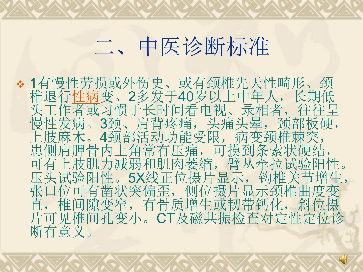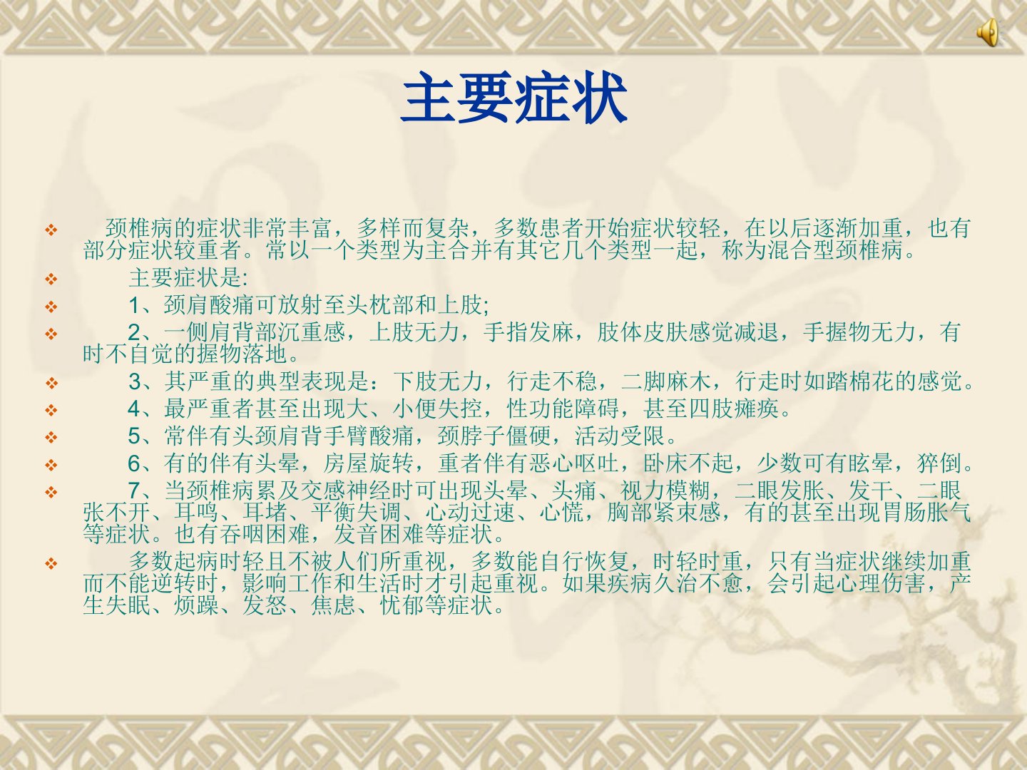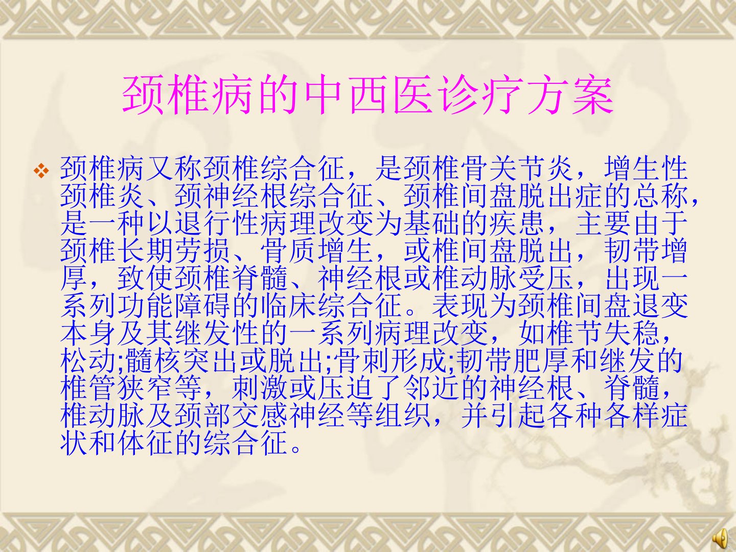 颈椎病又称颈椎综合征是一种以退行性病理改变为基础的疾患主要由于颈椎长期劳损等原因致使颈椎脊髓、神经根或椎动脉受压出现功能障碍。其症状丰富多样常以一个类型为主合并其他类型即混合型颈椎病包括颈肩酸痛、肢体无力发麻、行走不稳、大小便失控甚至四肢瘫痪等还会伴有头晕、恶心、眩晕猝倒、耳鸣、平衡失调等症状。颈椎病多发于40岁以上中年人诊断时需结合症状、体征和影像学检查并与相似症状疾病相鉴别。治疗包括口服药物、牵引、理疗、中医疗法、贴剂和手术等多种方式。神经根型和椎动脉型颈椎病可采用不同中药方剂治疗。食疗方面推荐川芎白芷炖鱼头、天麻炖鱼头、葛根煲猪脊骨等。药物包括消炎镇痛、营养神经、血管扩张剂等。颈椎病患者需合理搭配饮食对症进食同时戒烟酒避免过冷过热、油腻和辛辣刺激食物。