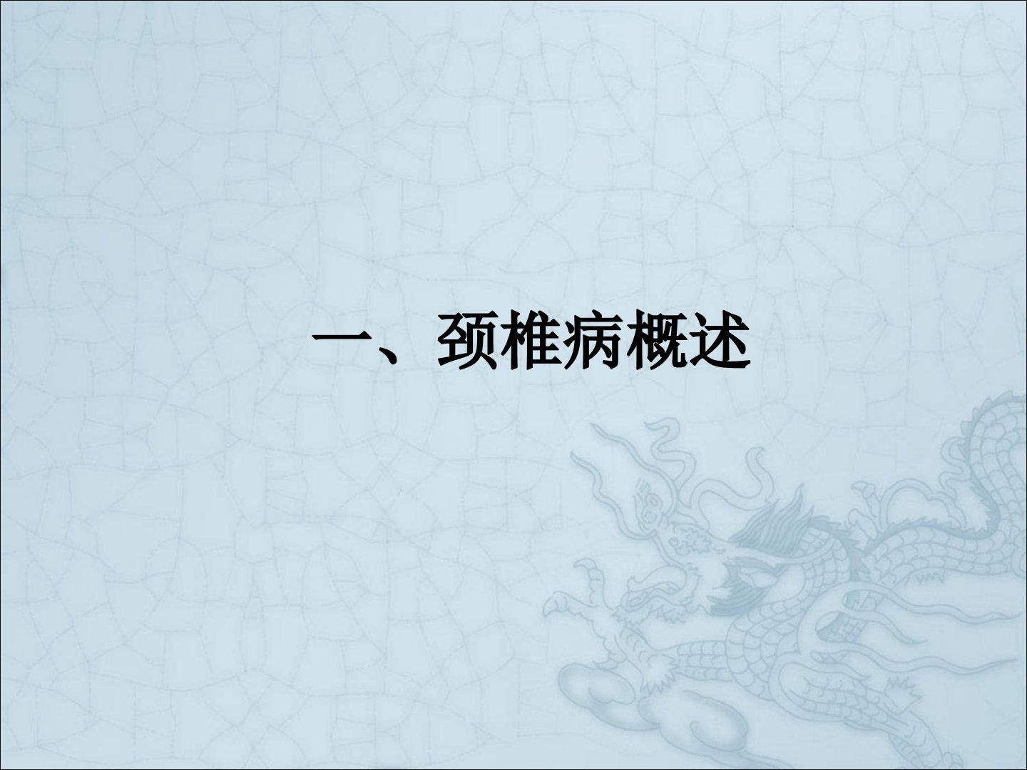 颈椎病的治疗与预防幻灯片摘要一、颈椎病概述颈椎病由颈椎间盘退行性变、骨质增生等刺激或压迫神经根、脊髓等引起。发病率约1020中老年龄段高发伏案工作者发病率最高好发部位依次为颈56、颈67、颈7胸1。二、病因1退行性变:随年龄增长颈椎间盘及整体退变是主因。2慢性劳损:睡眠不良体位、工作姿势不当、不适当锻炼。3头颈部外伤:半数病例与外伤有关。4咽喉部炎症:易诱发症状或加重病情。5发育性椎管狭窄:椎管狭小者易发病。三、分型分为神经根型、脊髓型、椎动脉型、交感型、食管压迫型、颈型、混合型。四、治疗包括康复治疗、健康教育、非手术治疗、微创手术、手术治疗等。五、预防1防外伤:严防急性头、颈、肩部外伤。2纠姿势:纠正不良姿势合理用枕。3办公室预防:保持正确坐姿不时活动颈肩部工作12小时活动颈部抬头望远睡眠注意姿势避免损伤、防寒防湿、预防感染。六、保健介绍六式颈椎保健操包括前俯后仰、举臂转身、左右旋转、提肩缩颈、左右摆动、波浪屈伸等动作。此外还可进行头部运动防治颈椎病关键是要坚持。同时介绍了预防颈椎病自我按摩操。