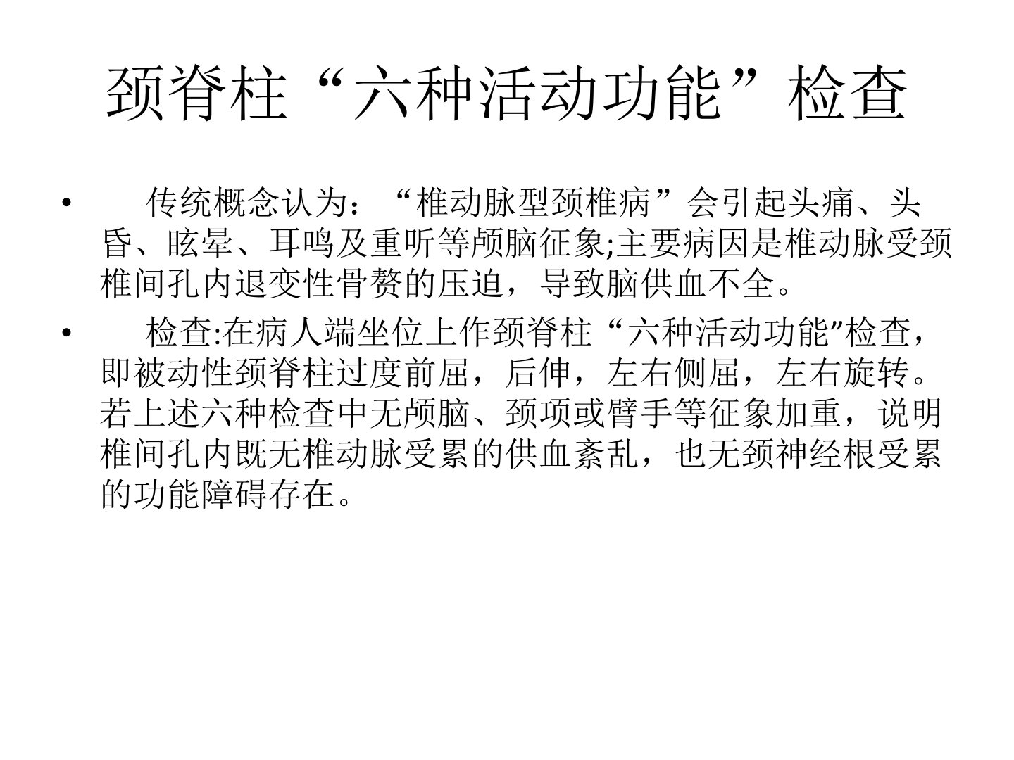 颈椎病诊断程序及功能锻炼摘要传统认为“椎动脉型颈椎病”主要因椎动脉受颈椎间孔内退变性骨赘压迫导致脑供血不全引发头痛等颅脑征象。诊断时可让病人端坐作颈脊柱“六种活动功能”检查即被动性颈脊柱过度前屈后伸、左右侧屈、左右旋转若无征象加重则说明不存在椎间孔内椎动脉受累、颈神经根受累问题。此检查还能判断软组织损害病变部位如肩背、枕后等部位疼痛及牵涉痛对应不同肌肉肌止病变。诊疗方面推拿不同部位可使相应颅脑、颈部、肩臂手征象缓解或消失。对于胸锁乳突肌、枕下肌群、斜角肌等肌肉损害各有特定临床表现如胸锁乳突肌损害有枕骨型头痛、视野模糊等症状治疗包括自我拉伸、起点强刺激推拿提捏主动运动、针斜刺等;枕下肌群损害可做推拿、注射治疗;斜角肌损害可进行拉伸推拿、斜刺、局部注射、银质针治疗。此外还介绍了易化牵伸技术(PNF)顺序、自我牵伸原则以及颈肩部斜方肌上部、胸锁乳突肌、枕下肌群、肩胛提肌、斜角肌等肌肉的仰卧位、坐位自我牵伸方法。