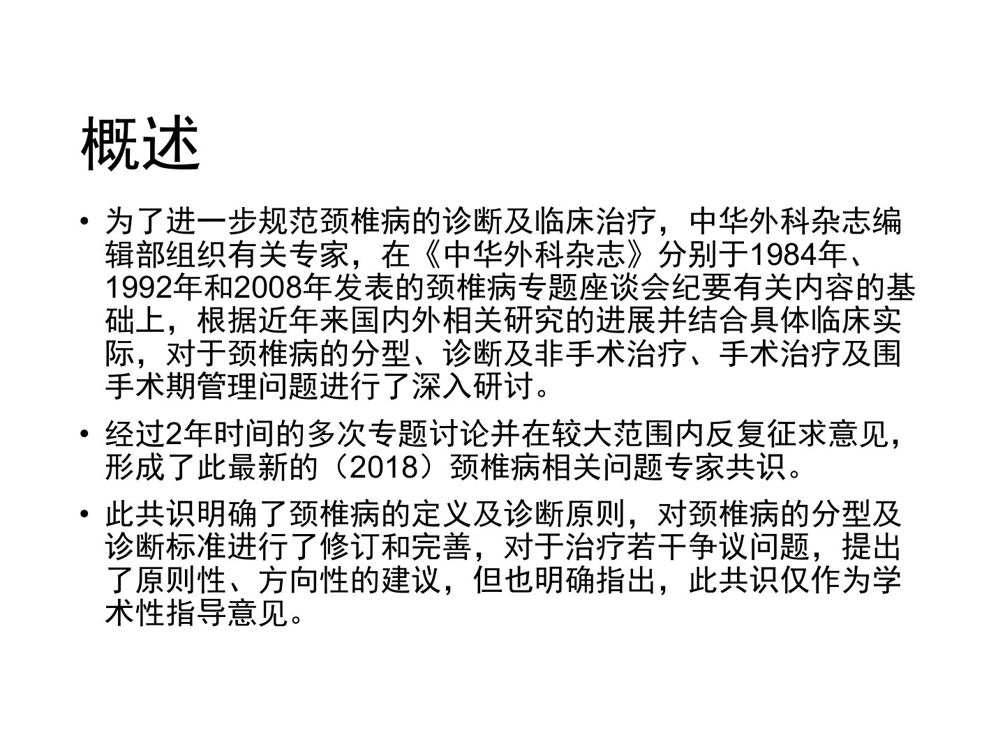 《颈椎病的诊断及临床治疗专家共识(2018)》由中华外科杂志编辑部组织专家研讨形成。共识明确:颈椎病指颈椎椎间盘退行性改变及其继发相邻结构病理改变累及周围组织结构并出现相应临床表现的疾病。诊断需同时具备临床表现、影像学退行性改变及能解释表现的影像学依据。颈椎病分为颈型、神经根型、脊髓型和其他型。非手术治疗是颈型、神经根型等颈椎病首选包括保持合乎生理要求的生活和工作体位、头颈牵引、物理治疗、运动疗法、药物疗法及传统医学治疗等。手术治疗目的是中止病理变化对神经组织的损害要严格掌握指征根据病情选方式以充分减压等为核心。不同类型颈椎病手术适应症不同手术入路有前入路、后入路及一期后前联合入路。病情评估和疗效评价推荐采用国际通行评价标准。共识还提出了围手术期管理建议。