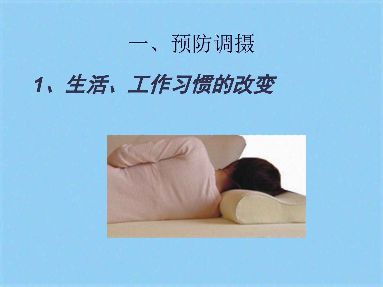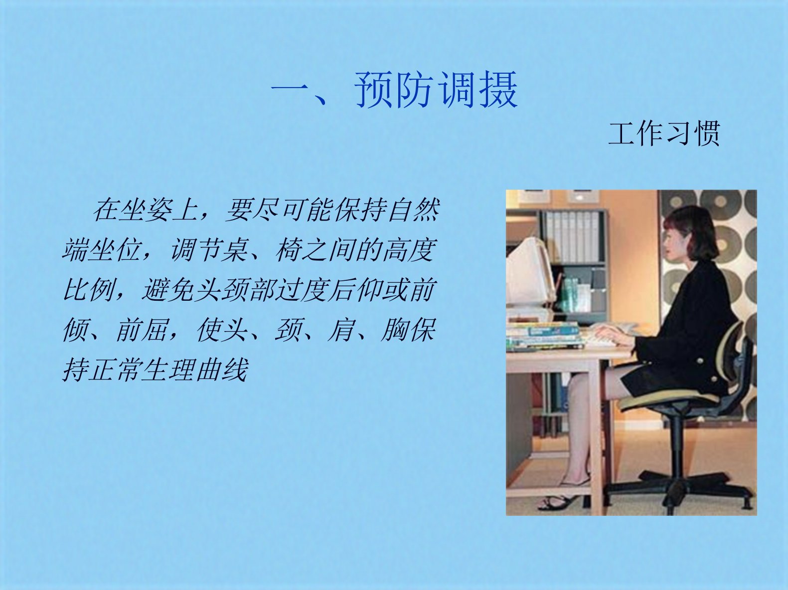 颈椎病预防摘要预防颈椎病需注重生活与工作习惯的调整。工作时应保持自然端坐位调节桌椅高度避免头颈部过度后仰或前倾。每工作30分钟应轻柔缓慢地转动头颈部至最大范围并进行肌肉负荷训练以增强肌力。睡眠时仰卧位颈部应枕在枕头上头部略后仰高度1216cm侧卧位时枕头支点应位于颈侧中央高度与肩同高。锻炼方案需个体化在专业医生指导下进行避免随意锻炼造成损伤。可模仿动物形体活动如苍龟缩颈、大鹏展翅、白鹅引颈等消除项背部肌肉疲劳。此外体育活动前应充分准备防止外伤;冬季注意保暖。康复操可改善颈部血液循环无颈椎病者可起到预防作用。