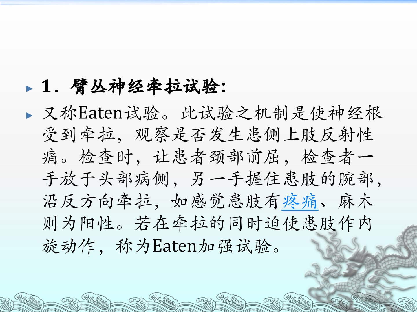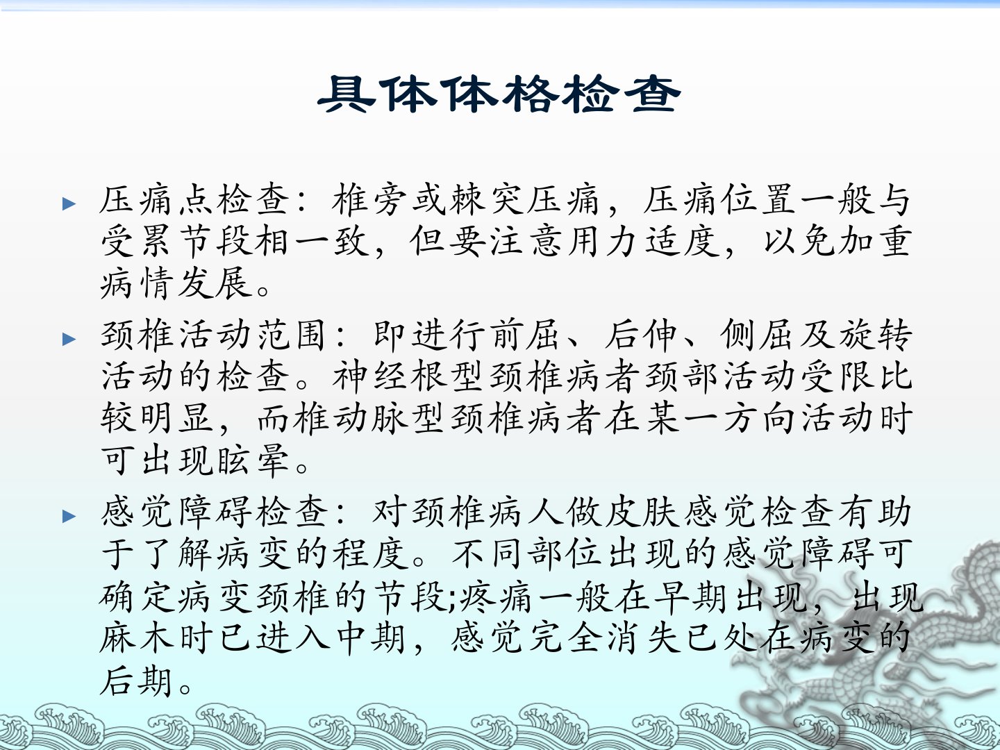 颈椎病体格检查包含多方面内容:压痛点检查时压痛位置多与受累节段一致但检查时用力要适度;颈椎活动范围检查神经根型颈椎病颈部活动受限明显椎动脉型颈椎病在某方向活动时或现眩晕;感觉障碍检查可了解病变程度不同部位感觉障碍能确定病变颈椎节段。此外还有多种特殊试验:臂丛神经牵拉试验(Eaten试验)及其加强试验通过牵拉神经根观察是否引发患侧上肢反射性痛来判断;椎间孔挤压试验(Spurting试验)让患者坐位头部侧弯并向下施压患肢放射性疼痛为阳性;还有Jackson压头试验、肩部下压试验、直臂抬高试验、颈部拔伸试验、转身看物试验、头前屈旋转试验(Fenz试验)、霍夫曼氏征检查等。