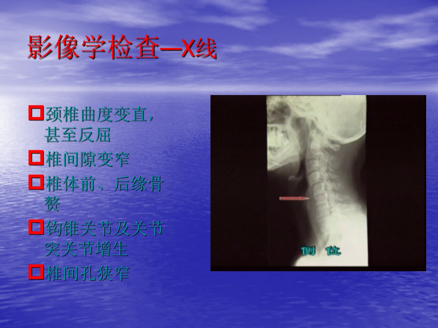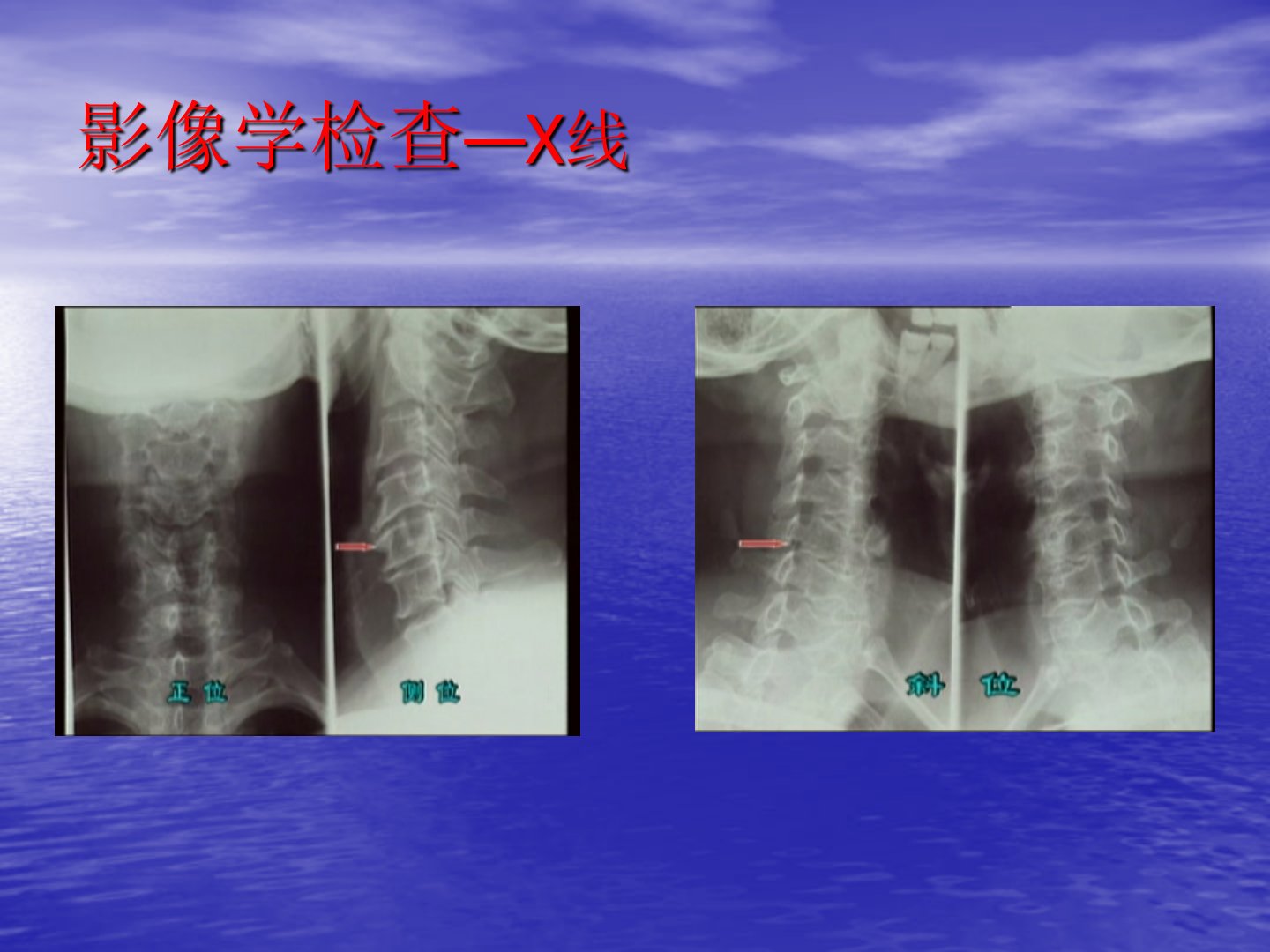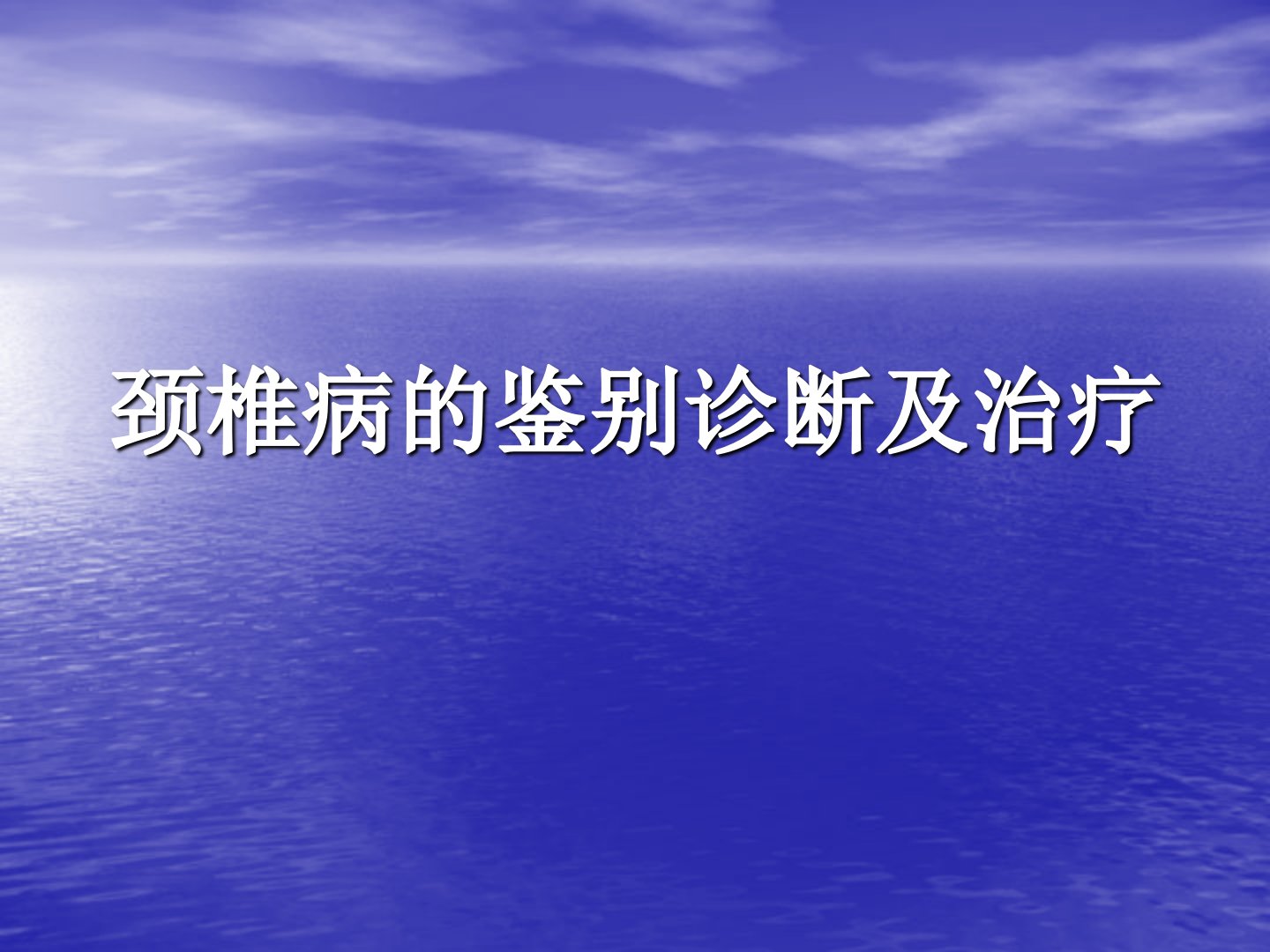 颈椎病鉴别诊断及治疗摘要:影像学检查包括X线(显示颈椎曲度变直、椎间隙变窄等)、CT、MRI及MRA。鉴别诊断需区分神经根型(与肩周炎、腕管综合征等区分)、脊髓型(与颈椎骨折、结核、肿瘤等区分)、椎动脉型和交感神经型(与美尼尔综合征、冠状动脉供血不足、锁骨下动脉盗血综合征区分)。治疗方面保守治疗包括枕颏带牵引(适于脊髓型以外各型缓解肌痉挛增大椎间隙)、颈托和围领(颈部制动)、按摩和理疗(缓解肌肉痉挛改善血液循环脊髓型禁忌)、药物治疗(非甾体抗炎药、肌松剂、营养神经类药物)。手术治疗适用于症状明显的脊髓型颈椎病及其他保守治疗无效的情况方法包括前路减压椎体间植骨融合术和后路椎板切除术或椎板成形术。