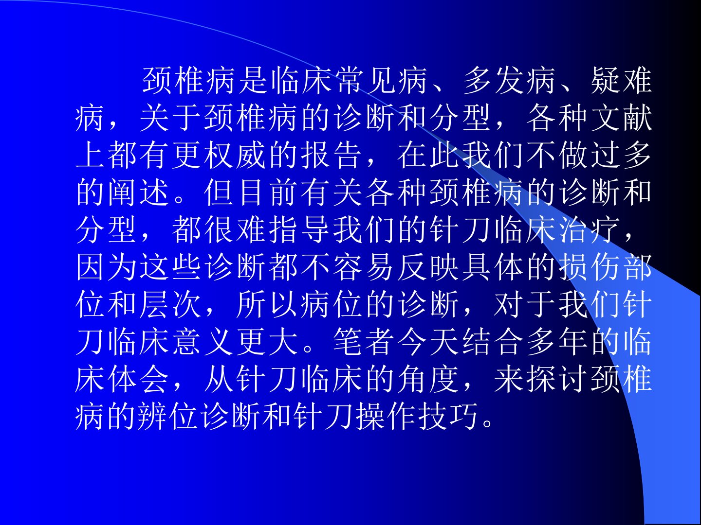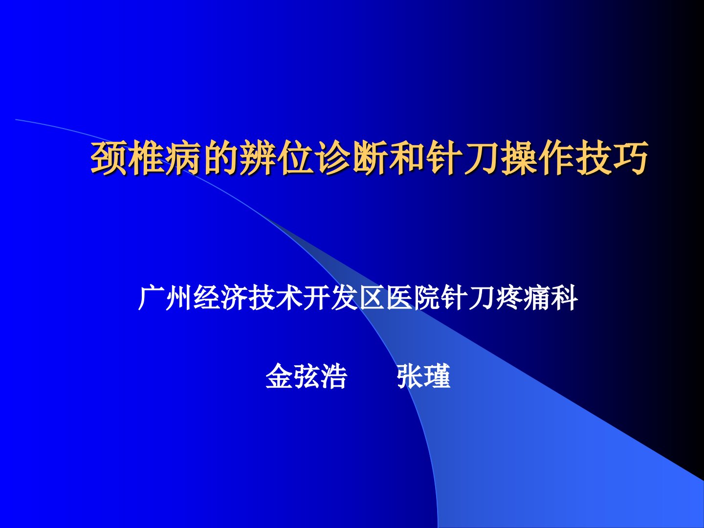 广州经济技术开发区医院金弦浩、张瑾医生从针刀临床角度探讨了颈椎病的辨位诊断与操作技巧。他们指出传统颈椎病诊断难以指导针刀治疗病位诊断对针刀临床更具意义。文中提出可根据症状判断病位如头面五官症状病变多位于上下项线间上肢症状病变则主要在C4T1后关节、横突等处。针刀治疗时仔细触诊、精确定位是关键需寻找压痛点触摸条索、硬结范围。文中还详细介绍了颈椎常见病变部位的定位和针刀入路层次如上下项线间、颈后部六条纵线等并强调了分层次针刀松解法的操作技巧即快速进入皮下后分层次突破仔细感受刀下硬度快速突破硬结不大幅摆动减少损伤和出血减轻病人痛苦。最后通过典型病例展示了针刀疗法的疗效。