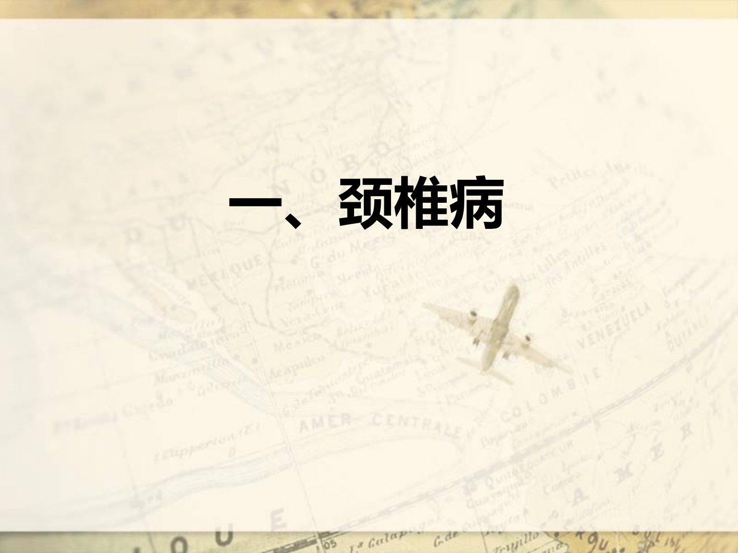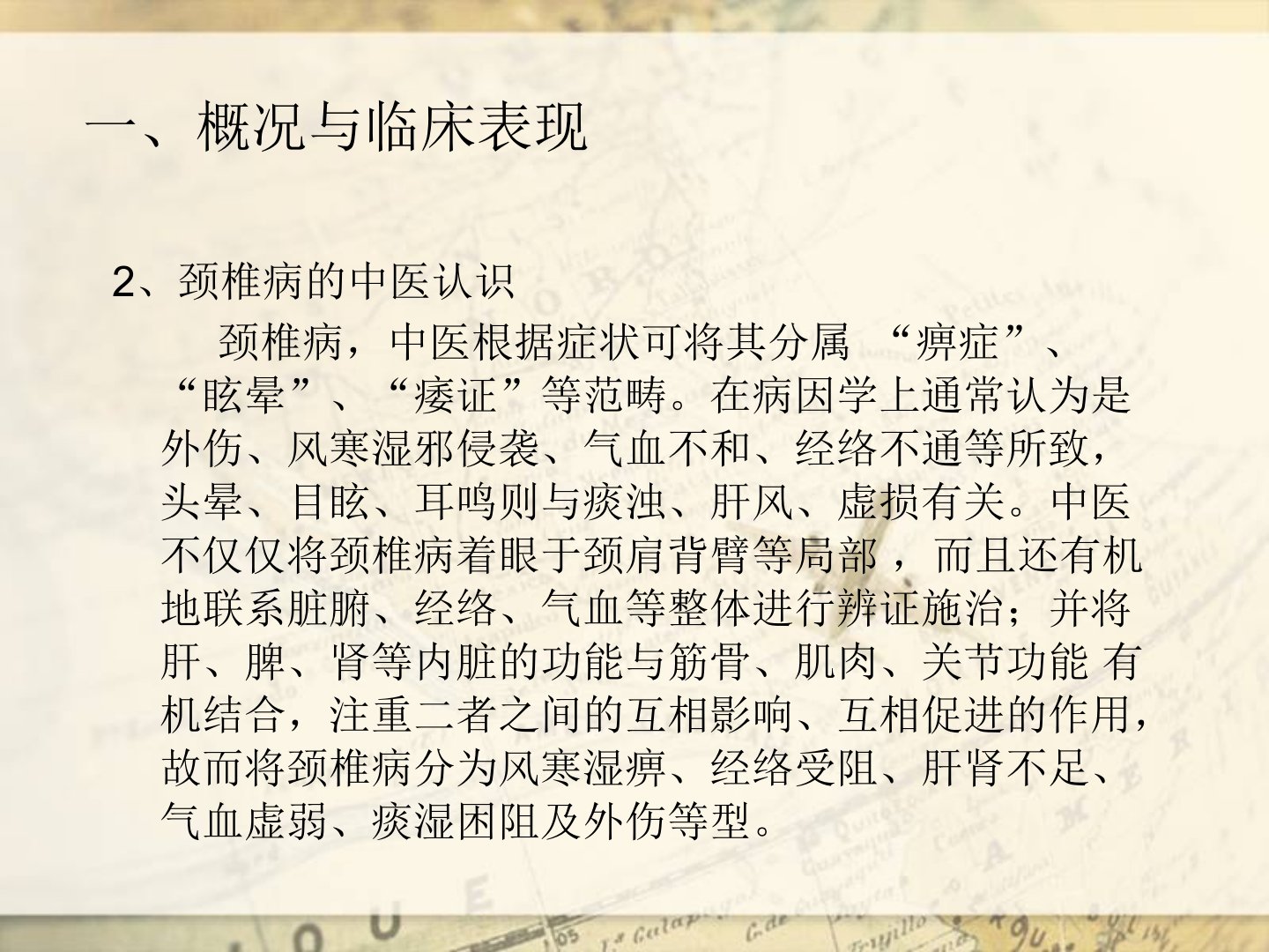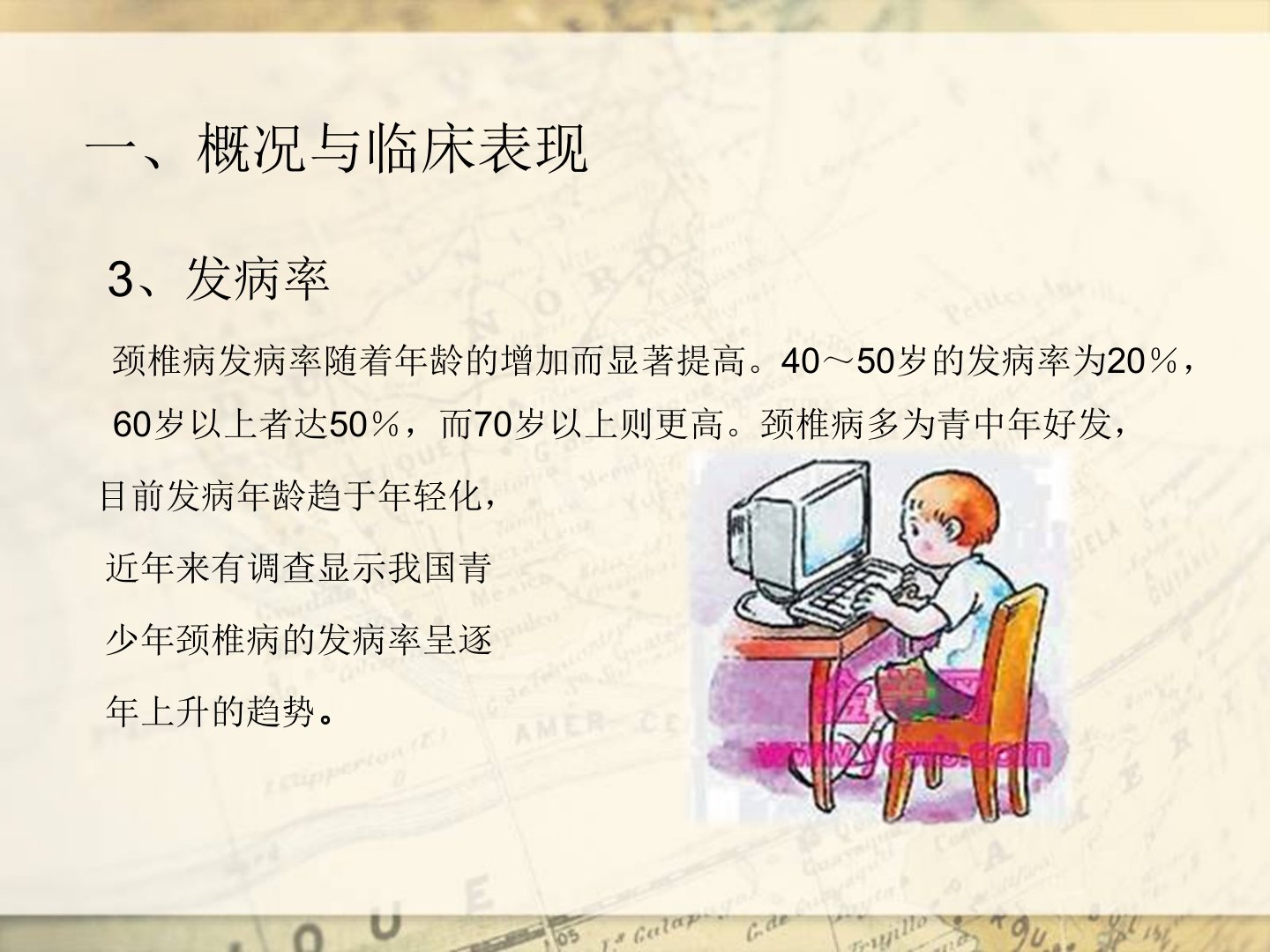 一、颈椎病一、概况与临床表现2、颈椎病的中医认识颈椎病,中医根据症状可将其分属“痹症”、“眩晕”、“痿证”等范畴。在病因学上通常认为是外伤、风寒湿邪侵袭、气血不和、经络不通等所致,头晕、目眩、耳鸣则与痰浊、肝风、虚损有关。中医不仅仅将颈椎病着眼于颈肩背臂等局部,而且还有机地联系脏腑、经络、气血等整体进行辨证施治;并将肝、脾、肾等内脏的功能与筋骨、肌肉、关节功能有机结合,注重二者之间的互相影响、互相促进的作用,故而将颈椎病分为风寒湿痹、经络受阻、肝肾不足、气血虚弱、痰湿困阻及外伤等型。一、概况与临床表现3、发病率颈椎病发病率随着年龄的增加而显著提高。40~50岁的发病率为20%,60岁以上者达5...