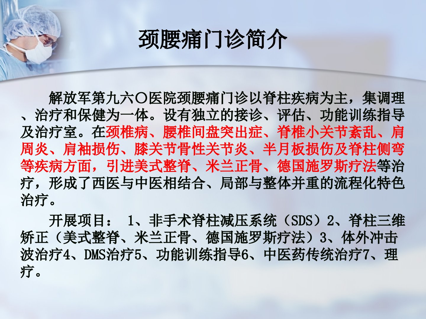 解放军第九六医院颈腰痛门诊以脊柱疾病为主集调理、治疗、保健为一体设有独立功能区域。门诊在颈椎病、腰椎间盘突出症等疾病治疗上融合美式整脊、米兰正骨、德国施罗斯疗法等形成中西医结合、局部与整体并重的流程化特色治疗。开展项目包括非手术脊柱减压系统、脊柱三维矫正、体外冲击波治疗等。门诊工作流程涵盖接诊评估、手术治疗、非手术治疗(含开放式手术、微创治疗、脊柱三维矫正、脊柱减压治疗、药物及物理治疗)及功能指导等。以65岁女性患者为例其因腰部疼痛就诊经影像学评估分析后采用美式整脊、米兰整骨及功能锻炼治疗三次后疼痛减轻九次后症状基本消失强调疼痛症状缓解是治疗和维护的开始。