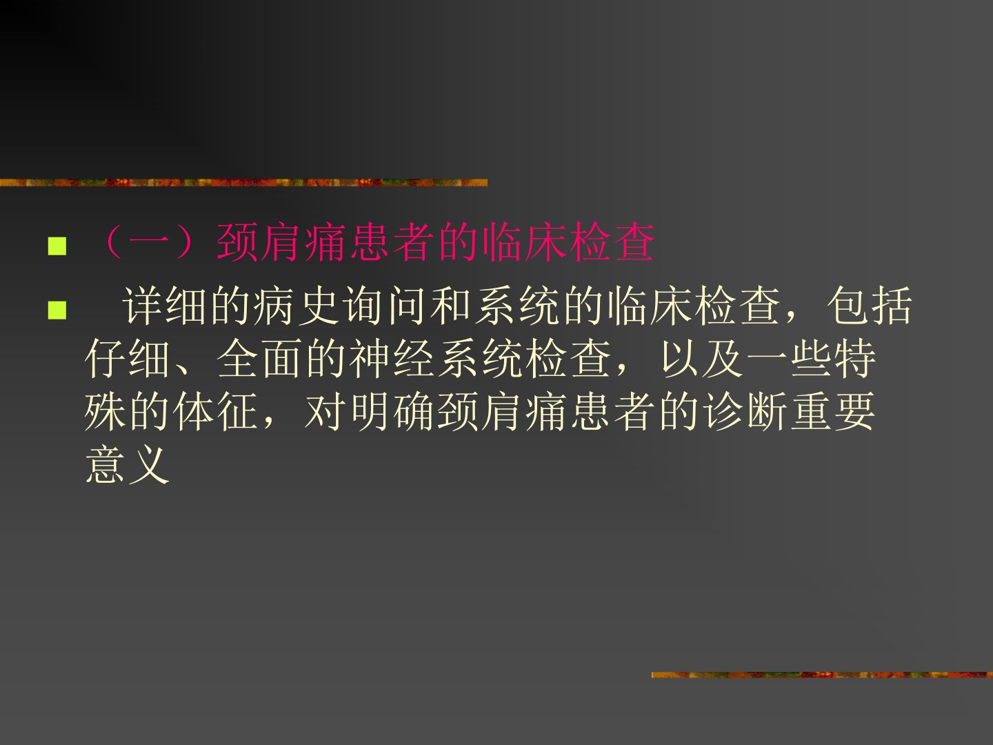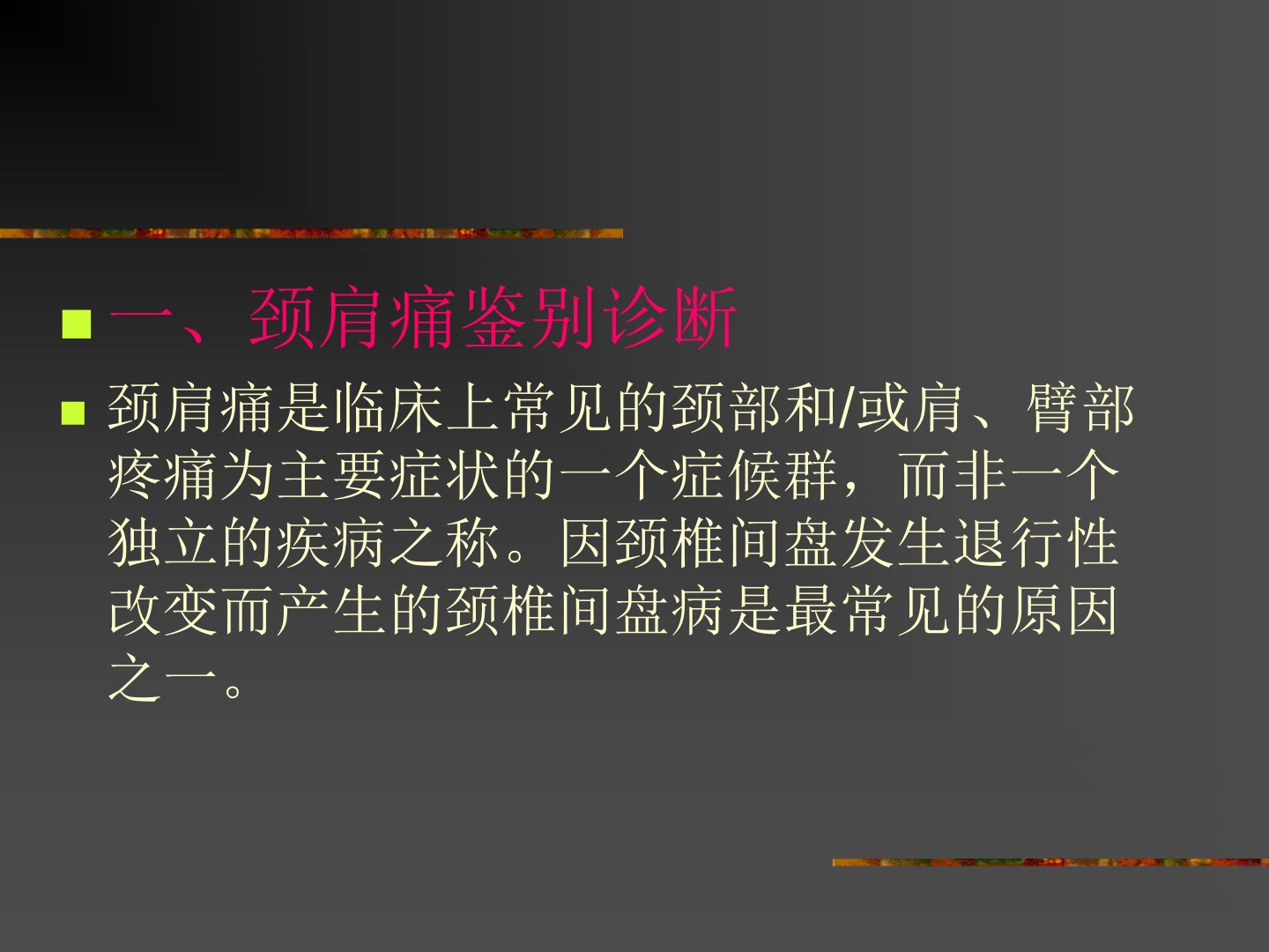摘要颈肩痛是常见症候群非独立疾病颈椎间盘退行性改变是其常见病因之一。颈肩痛临床检查中详细的病史询问和系统的临床检查包括神经系统检查和特殊体征检查对明确颈肩痛患者的诊断有重要意义。其中神经根病指神经根功能障碍的症状和体征颈3颈8神经根病各有其独特的临床表现和支配区域且有椎间孔挤压试验等特殊临床体征。颈肩痛鉴别诊断包括外伤性、退行性、炎症性、肿瘤性等多种疾病。颈椎病发病率较高定义明确。其病因学包括机械压迫学说、血运障碍学说等。病理上颈椎间盘、椎体、关节突关节及韧带等退行性变化以及颈椎发育性椎管狭窄、创伤和损伤等都是颈椎病发病原因。颈椎病分型包括颈型、神经根型等六型还有特定的椎管测量方法。治疗方面大部分患者非手术治疗效果优良少数需手术不同类型有不同治疗禁忌。非手术治疗方式多样中药治疗对神经根型颈椎病效果肯定。手术治疗有明确适应症和术式。此外本文还介绍了颈椎病的预防措施。