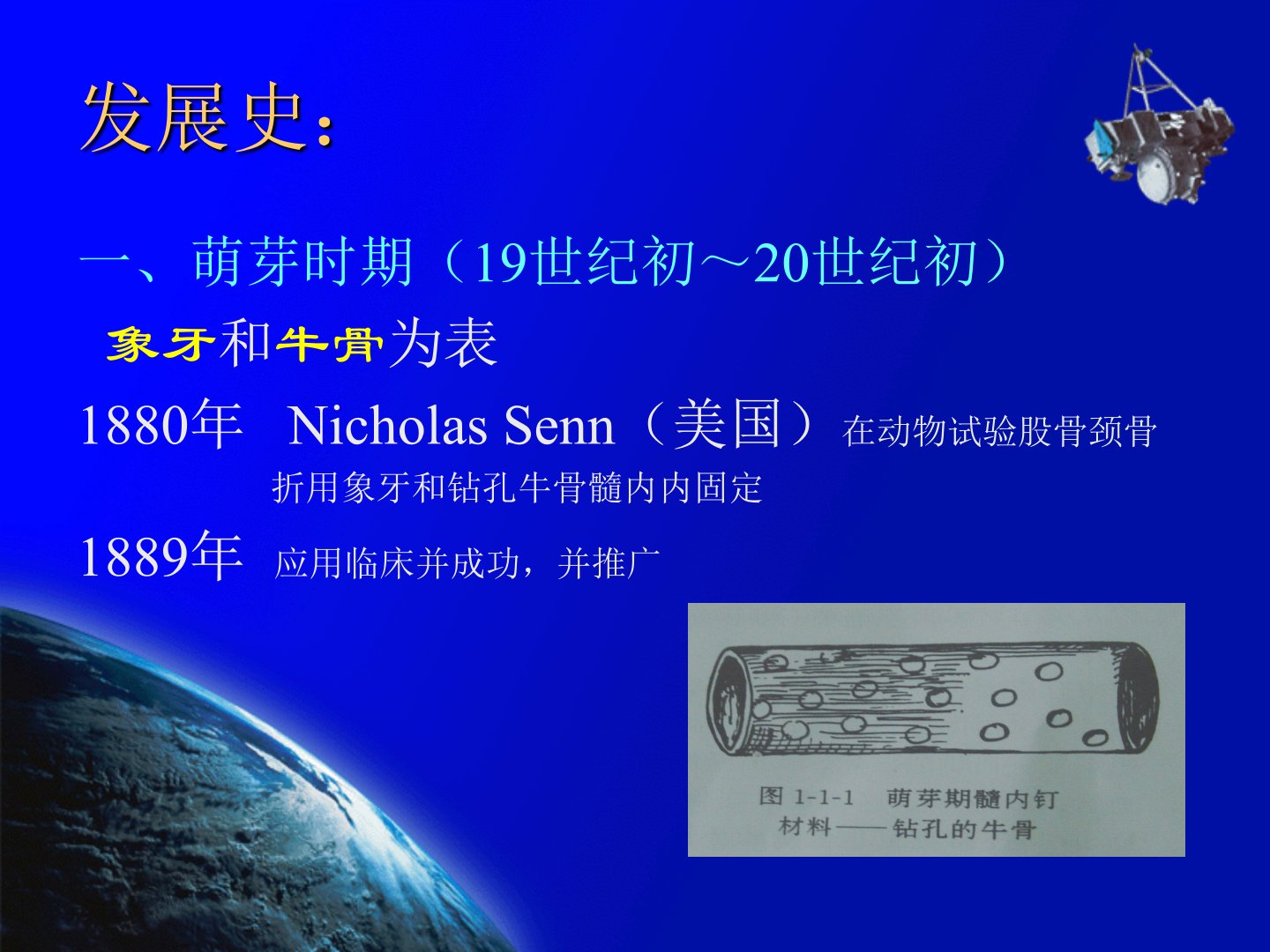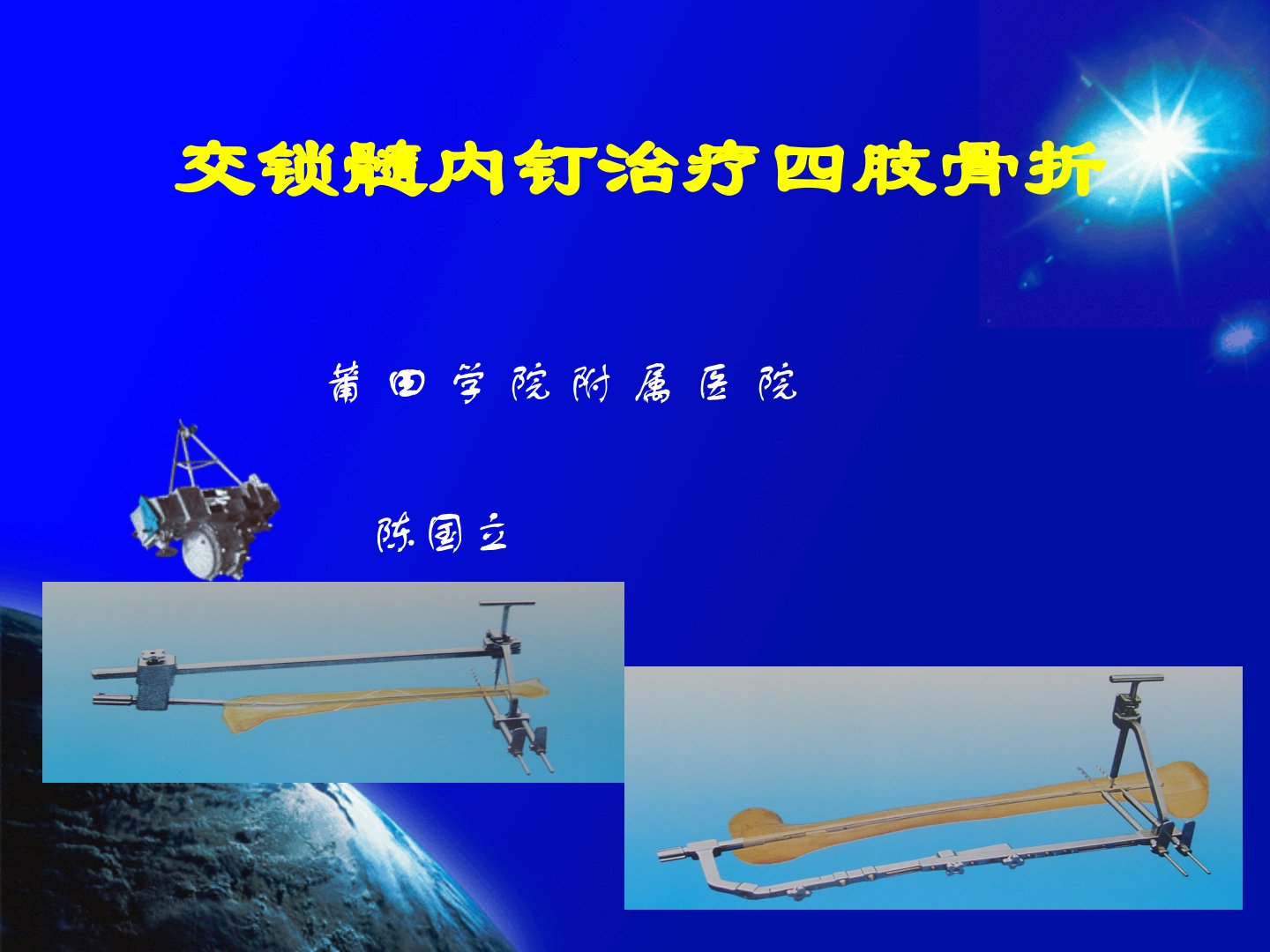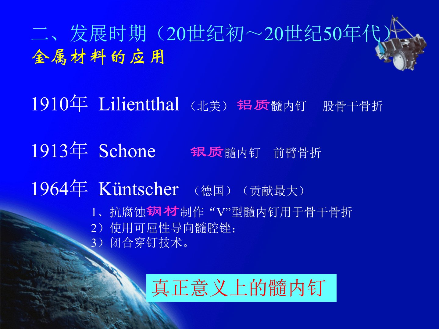 交锁髓内钉是治疗四肢骨折的有效方法。文章首先介绍了其发展历程:19世纪初至20世纪初为萌芽期以象牙和牛骨为材料;20世纪初至50年代为发展期开始使用金属材料;50年代后期至今为完善期交锁髓内钉逐渐成为主流。理想置入物应符合生物相容性、化学稳定性、良好柔韧性等标准常用材料包括不锈钢、钛合金等。交锁髓内钉适用于四肢长管状骨等多种骨折类型。临床应用中闭合穿钉出血少、感染率低为首选方法;扩髓可提高稳定性但可能破坏髓内血供;带锁髓内钉能有效防止畸形发生。并发症方面感染是最严重并发症之一需严格清创和使用抗生素预防其他并发症还包括骨折畸形愈合、脂肪栓塞等。我院自98年来应用交锁髓内钉治疗股骨、胫骨、肱骨骨折取得了良好效果。此外BO理论逐渐被接受交锁髓内钉闭合复位、穿钉的特点与之相符是良好的选择。