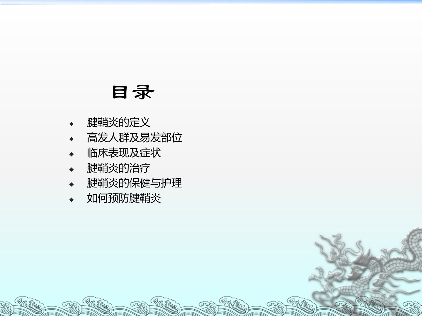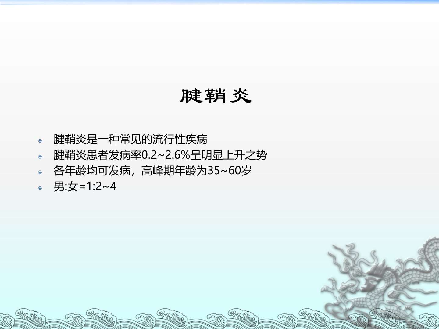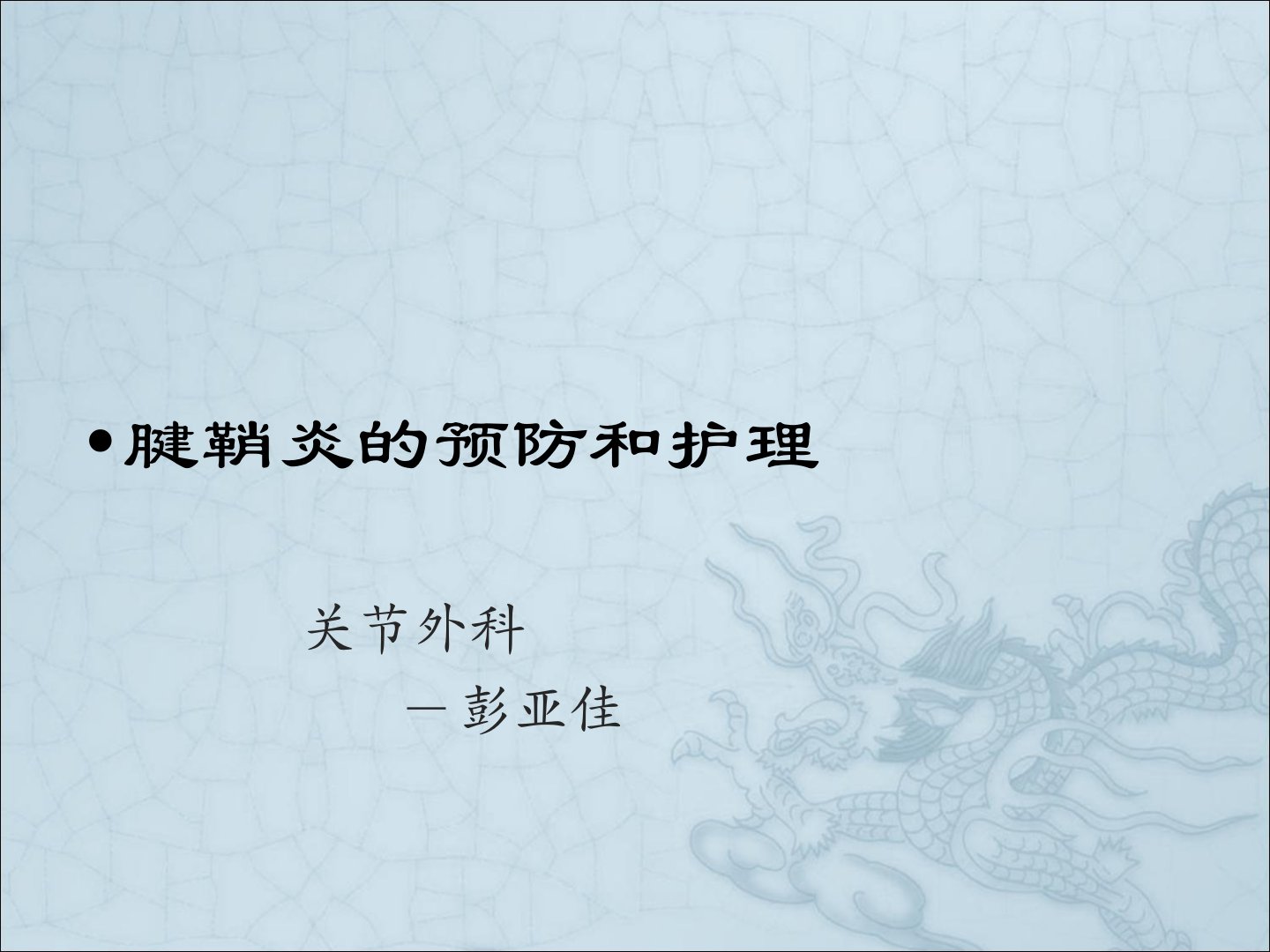 腱鞘炎的预防和护理摘要本文介绍了腱鞘炎的定义、高发人群、易发部位、临床表现及症状、治疗方式、保健护理和预防方法。腱鞘炎是肌腱和壳板交界处的炎症因肌腱频繁活动、用力过度或寒冷刺激导致。中老年女性、长期重复劳作的职业人群及常穿高跟鞋的女性易患此病常见于指、趾、腕、踝及肩部以腕部和指部最为常见。临床表现包括初期起病缓慢出现肿胀、短暂疼痛等症状部分患者起病为急性。治疗方式包括手术、针灸按摩、膏药外敷和封闭治疗等各有优缺点。保健与护理方面建议用温水洗手、旋转手腕、定时运动、服用止痛药、做握拳练习并多食蔬菜水果。预防腱鞘炎需注意正确工作姿势、避免关节过度劳动、定时休息冬天防止手部受寒。对于长期伏案办公人员应采用正确工作姿势缓解手部酸痛。