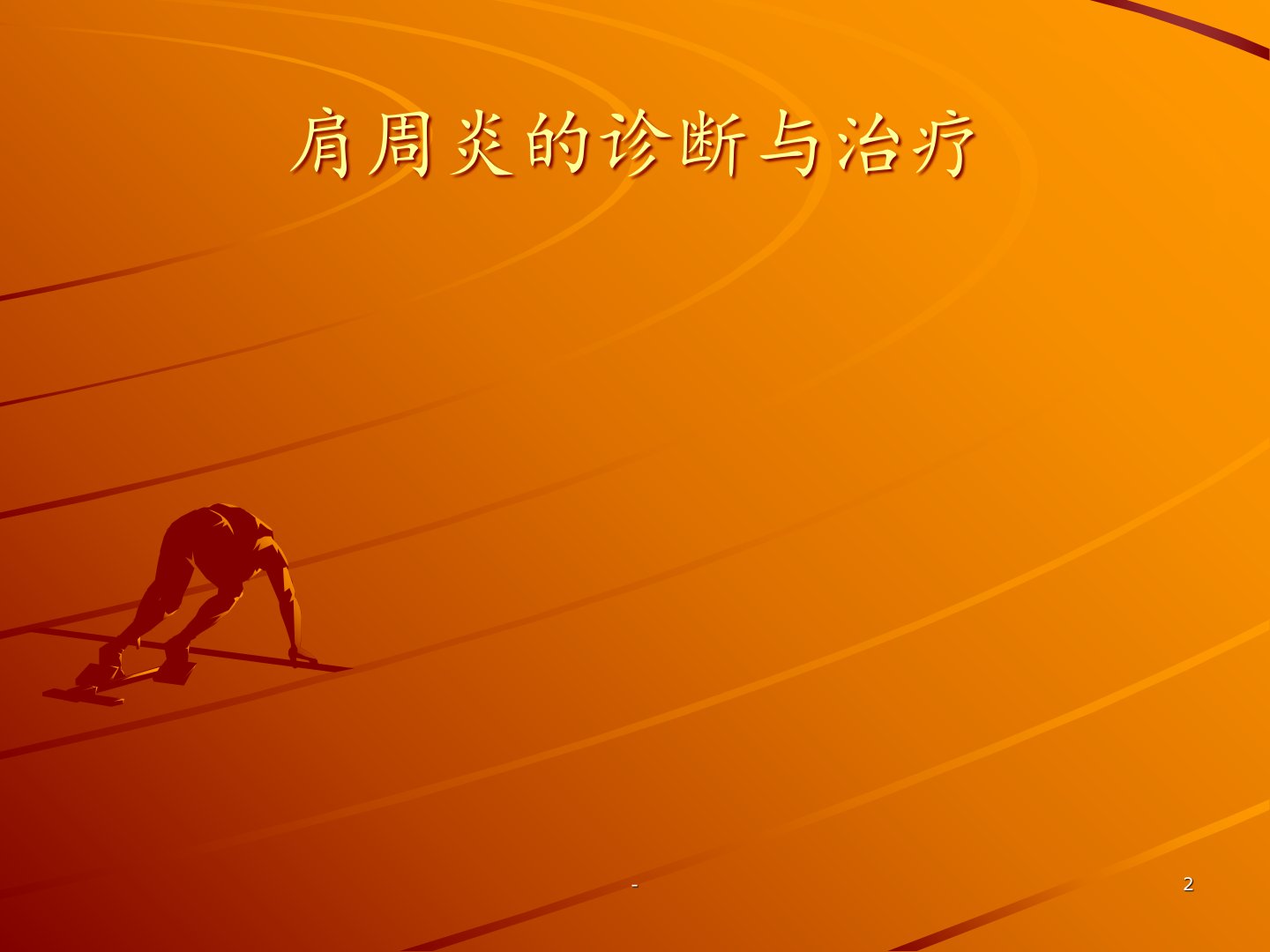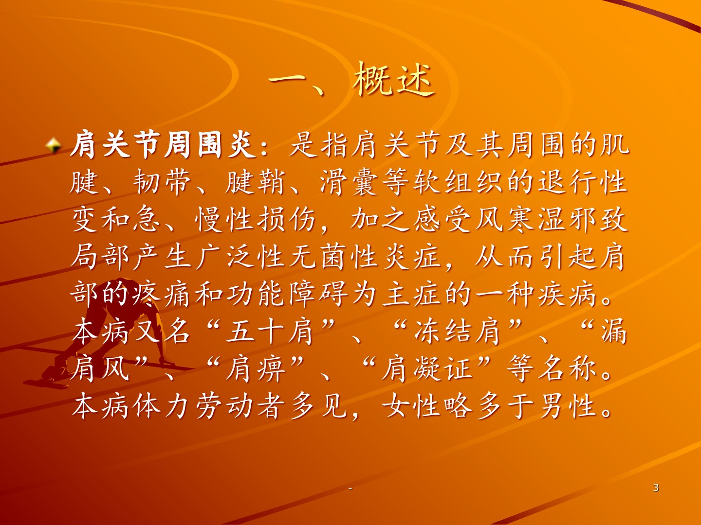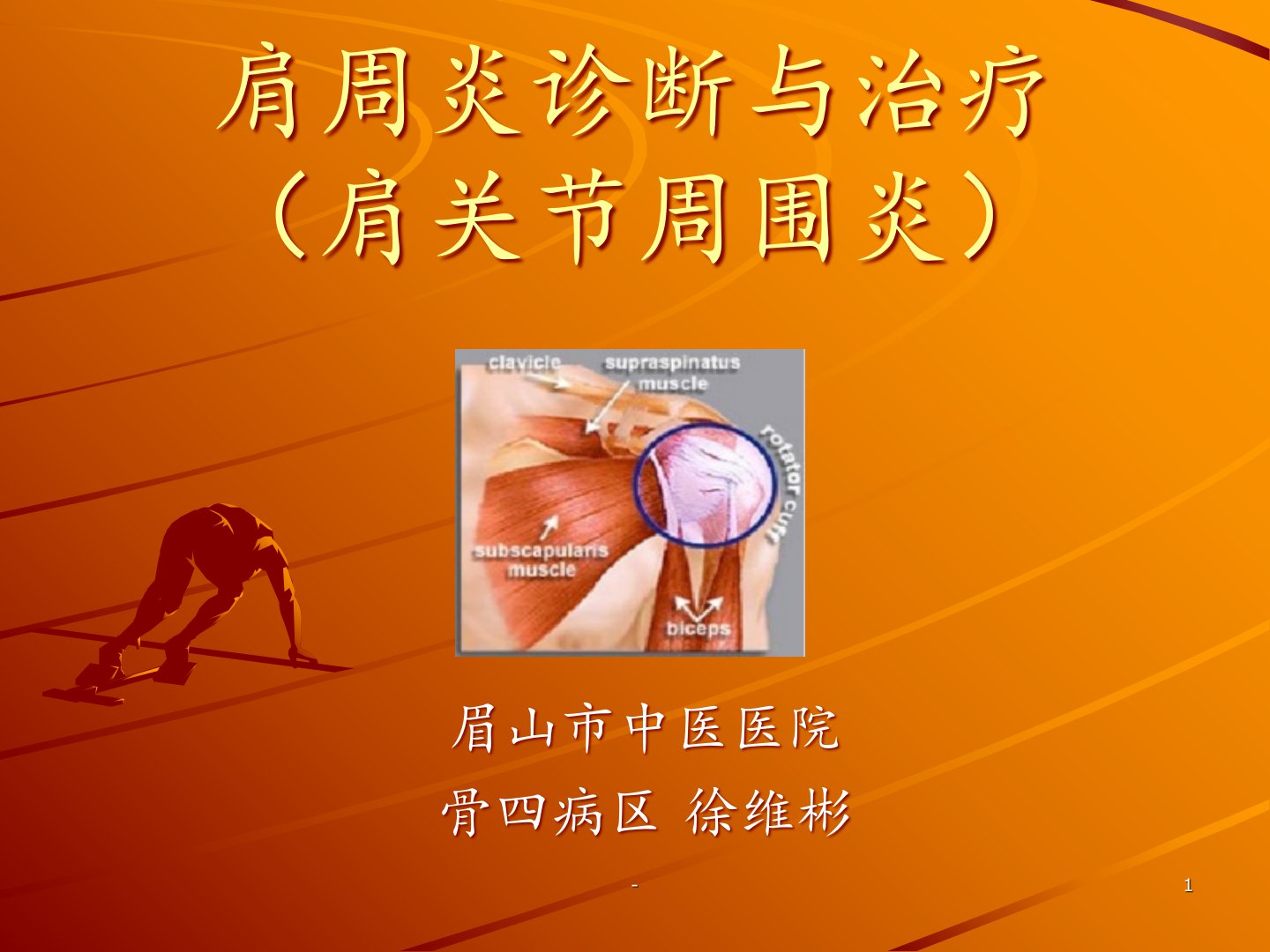 肩周炎诊断与治疗(肩关节周围炎)眉山市中医医院骨四病区徐维彬-肩周炎的诊断与治疗-一、概述肩关节周围炎:是指肩关节及其周围的肌腱、韧带、腱鞘、滑囊等软组织的退行性变和急、慢性损伤,加之感受风寒湿邪致局部产生广泛性无菌性炎症,从而引起肩部的疼痛和功能障碍为主症的一种疾病。本病又名“五十肩”、“冻结肩”、“漏肩风”、“肩痹”、“肩凝证”等名称。本病体力劳动者多见,女性略多于男性。-肩周炎在中国的发病率为15.9%肩周炎在世界的发病率为10%~12%女性的发病率略高于男性。左侧的发病率似乎较右侧的高一些,发生于双侧的肩周炎约占总发病率的12%。约40%的一侧肩周炎患者还会在5-7年内发生对侧的肩周炎...