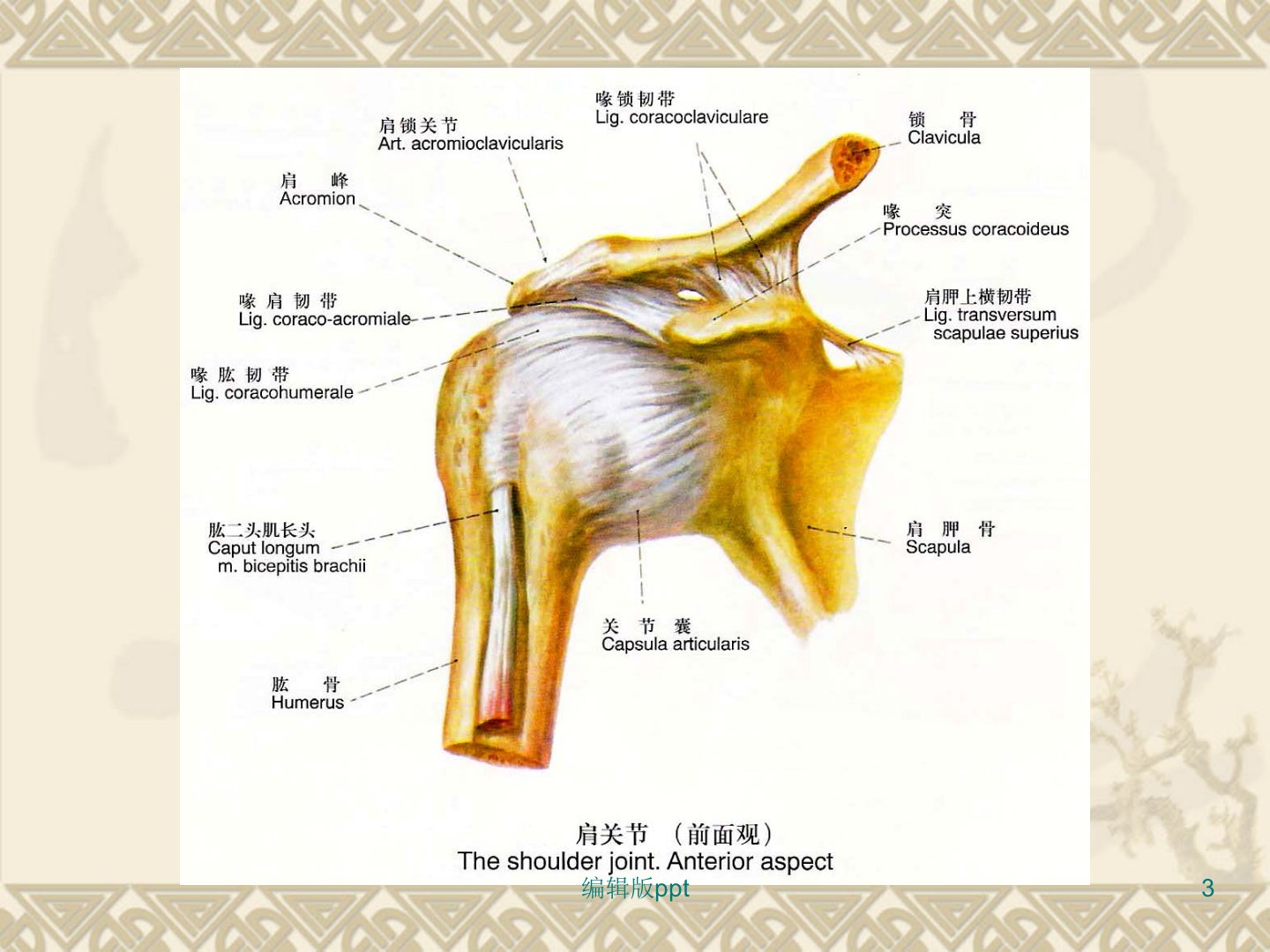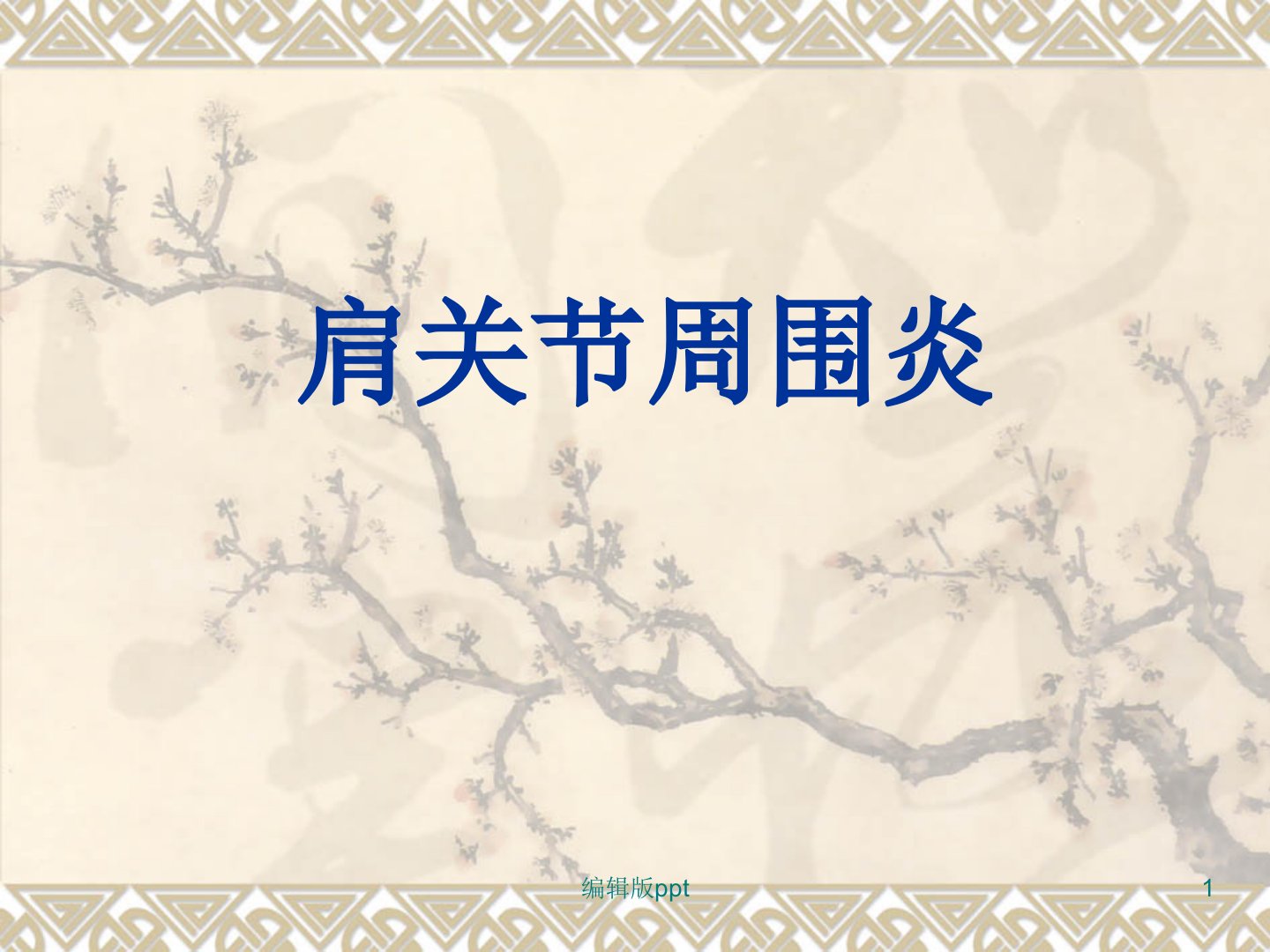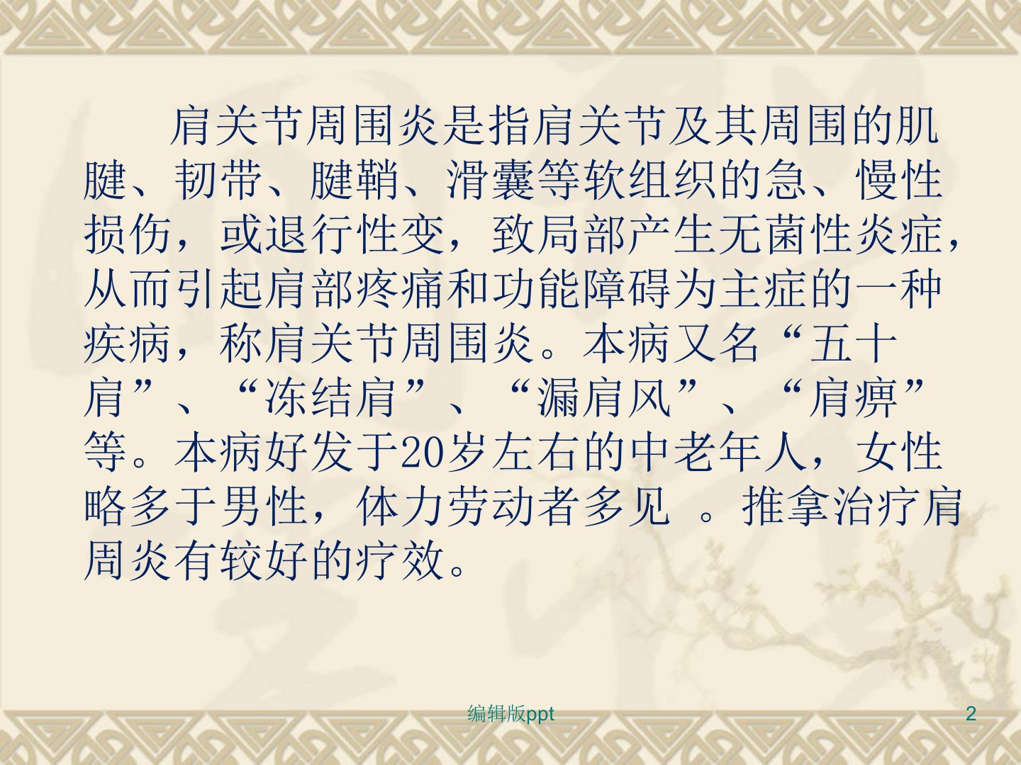 肩关节周围炎是肩关节及其周围软组织急慢性损伤或退行性变引发的无菌性炎症以肩部疼痛和功能障碍为主症又名“五十肩”、“冻结肩”等好发于中老年体力劳动者女性略多于男性。肩关节是人体活动范围最大的关节由多个关节和众多肌肉韧带组成血供丰富受颈5和颈6神经支配。病因包括外伤劳损致软组织损伤粘连、肝肾亏虚气血不足致筋脉失养、外感风寒湿邪致气血运行迟涩等。临床表现有肩部疼痛、功能障碍疼痛昼轻夜重后期可出现上臂肌群废用性萎缩。检查可发现压痛点肩关节功能受限X线检查一般无异常后期可出现骨质疏松等现象。本病应与冈上肌肌腱炎、神经根型颈椎病鉴别。治疗原则为初期疏通经络、活血止痛后期改善肩关节功能取穴及部位包括肩井、肩髃等手法有滚、揉、拿捏等。针灸治疗分型取穴通经活络、舒筋止痛。治疗时需排除骨关节病变手法轻柔注意保暖配合功能锻炼。预防调护需注意患肩保暖急性期减少运动慢性期和恢复期主动进行功能锻炼。本病预后良好但有糖尿病或结核病史的患者治疗效果较差。