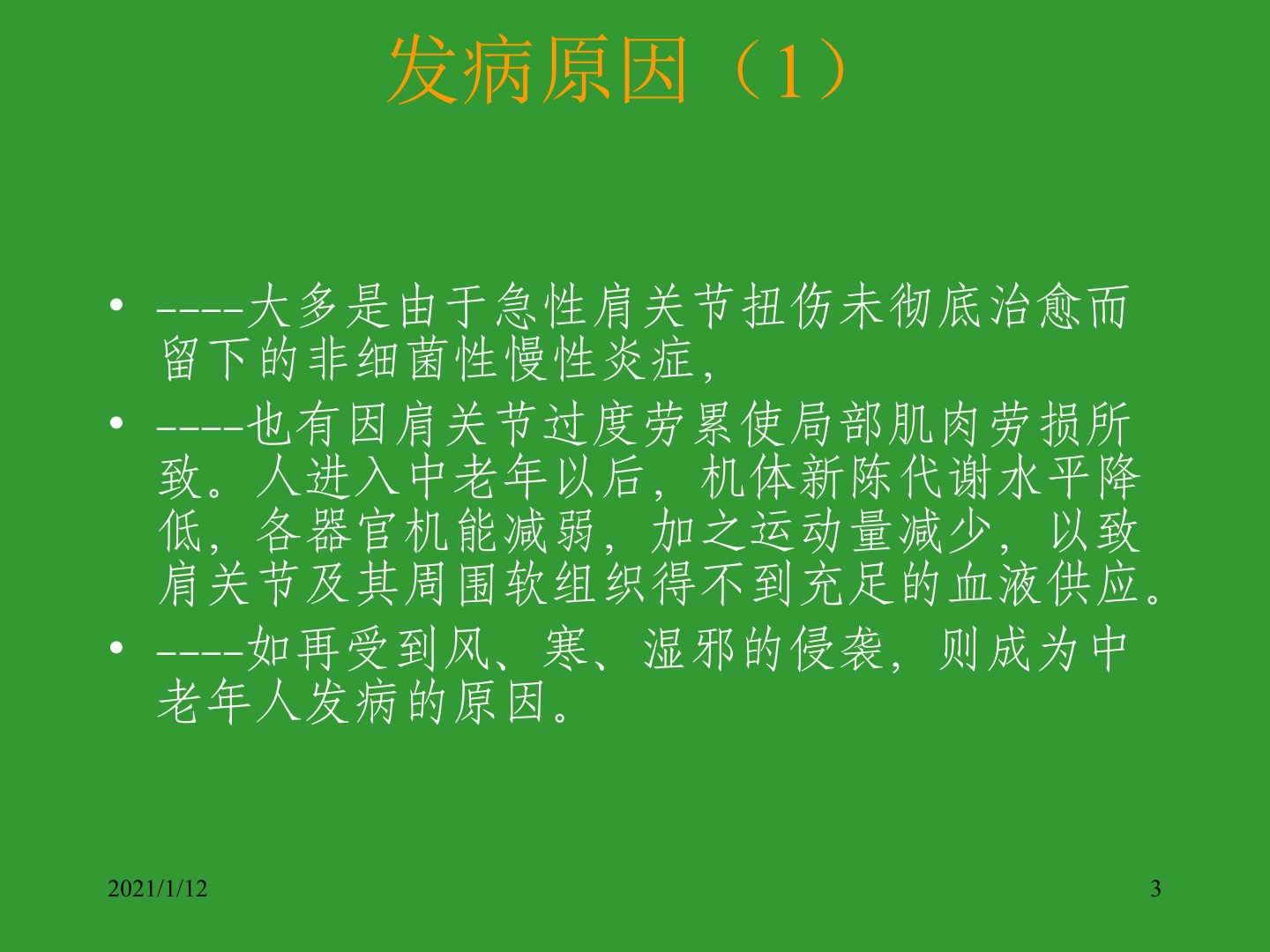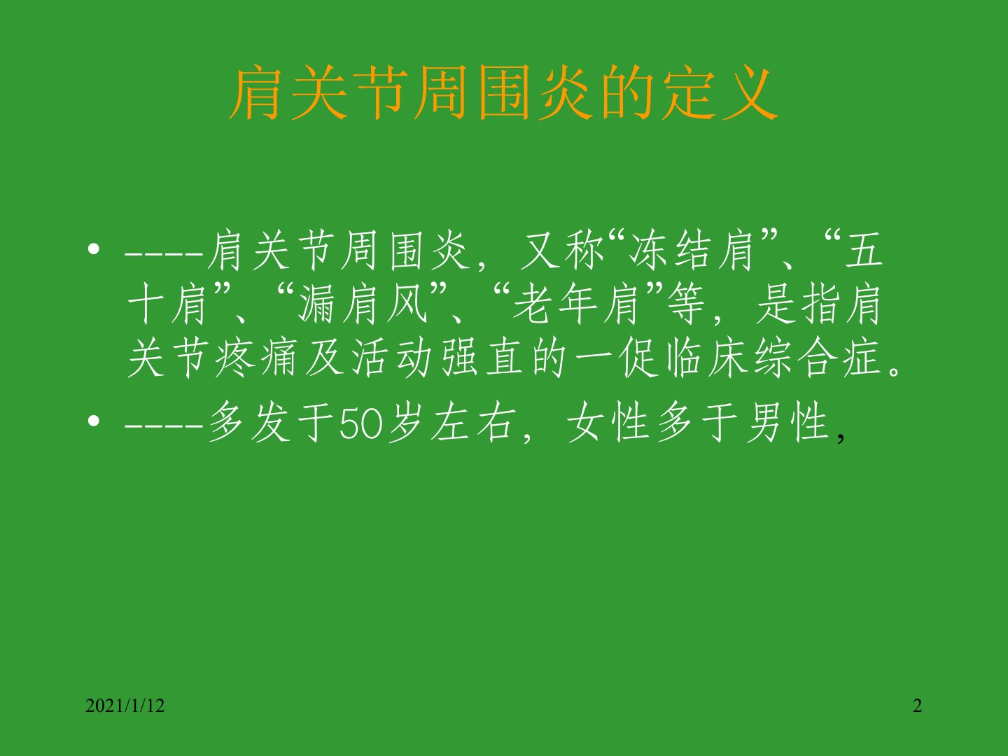 肩周炎康复详解摘要肩关节周围炎俗称“冻结肩”多发于50岁左右人群女性多于男性是一种引起肩关节疼痛及活动强直的临床综合症。其发病原因多样包括急性肩关节扭伤未愈、肩关节过度劳累、机体新陈代谢水平降低、器官机能减弱、运动量减少、血液供应不足以及受到风、寒、湿邪的侵袭等。此外盂肱关节附近结构的炎性改变、肩部或上肢手术、创伤、骨折等导致的长期固定以及颈椎病、心脏病等疾病也可能诱发肩周炎。临床表现上肩周炎初期表现为肩或上臂疼痛后期以肩关节活动受限为主影响工作和生活。诊断时需考虑患者年龄、性别、病史及体格检查如肩部肌肉萎缩、活动范围受限等。护理措施包括心理护理和生活护理鼓励病人主动锻炼。治疗方面早期主要应用药物控制疼痛鼓励病人进行肩关节活动锻炼;急性期需用吊带保证肩的静止配合止痛剂、理疗等;对于其他疾病引起的肩周炎应治疗原发疾病。康复治疗旨在改善肩部血液循环减轻肌肉痉挛恢复肩关节功能。病程一般较长需坚持康复锻炼。自我锻炼方法包括转动胳膊等简单动作坚持锻炼可促进康复。
