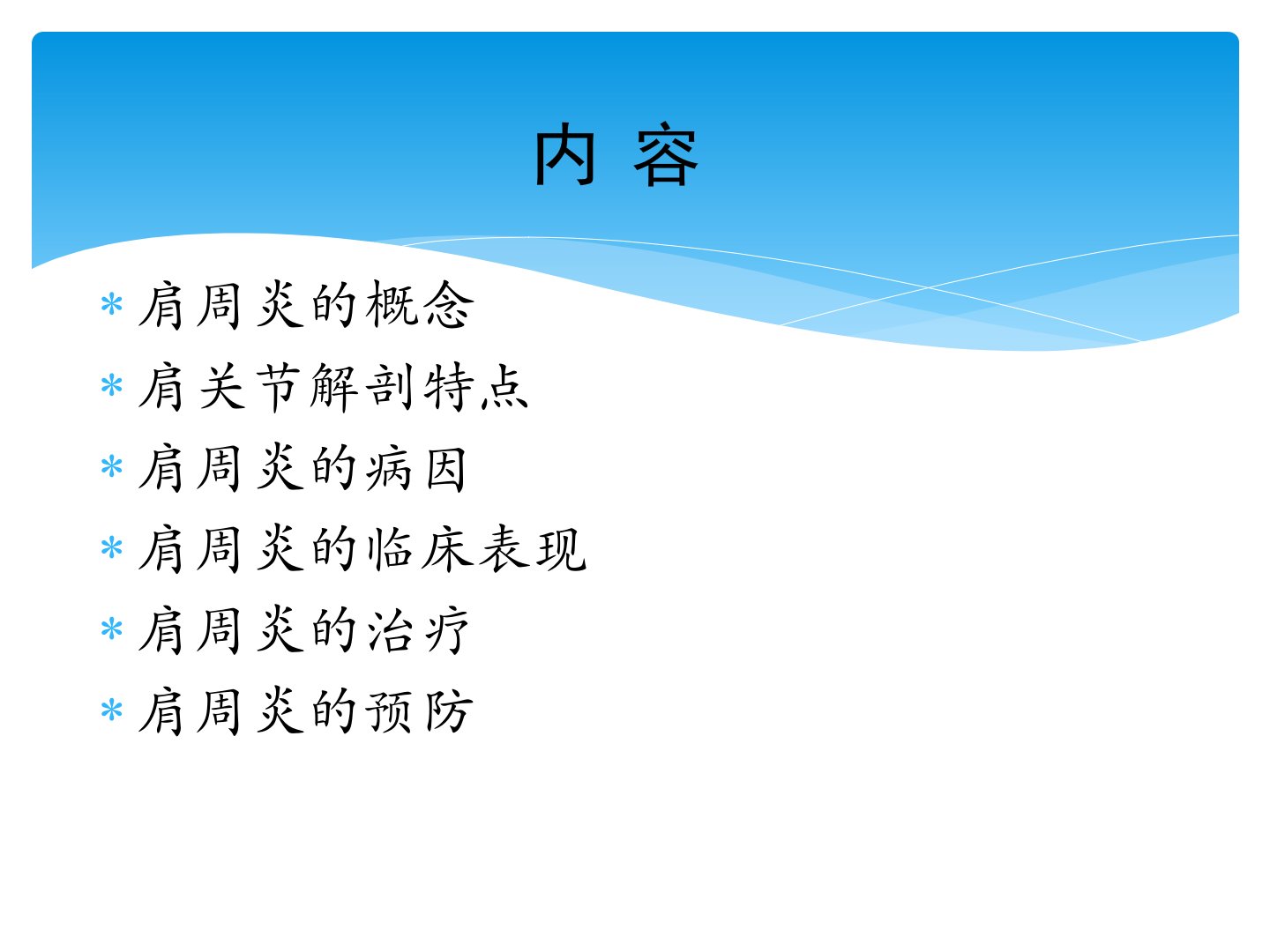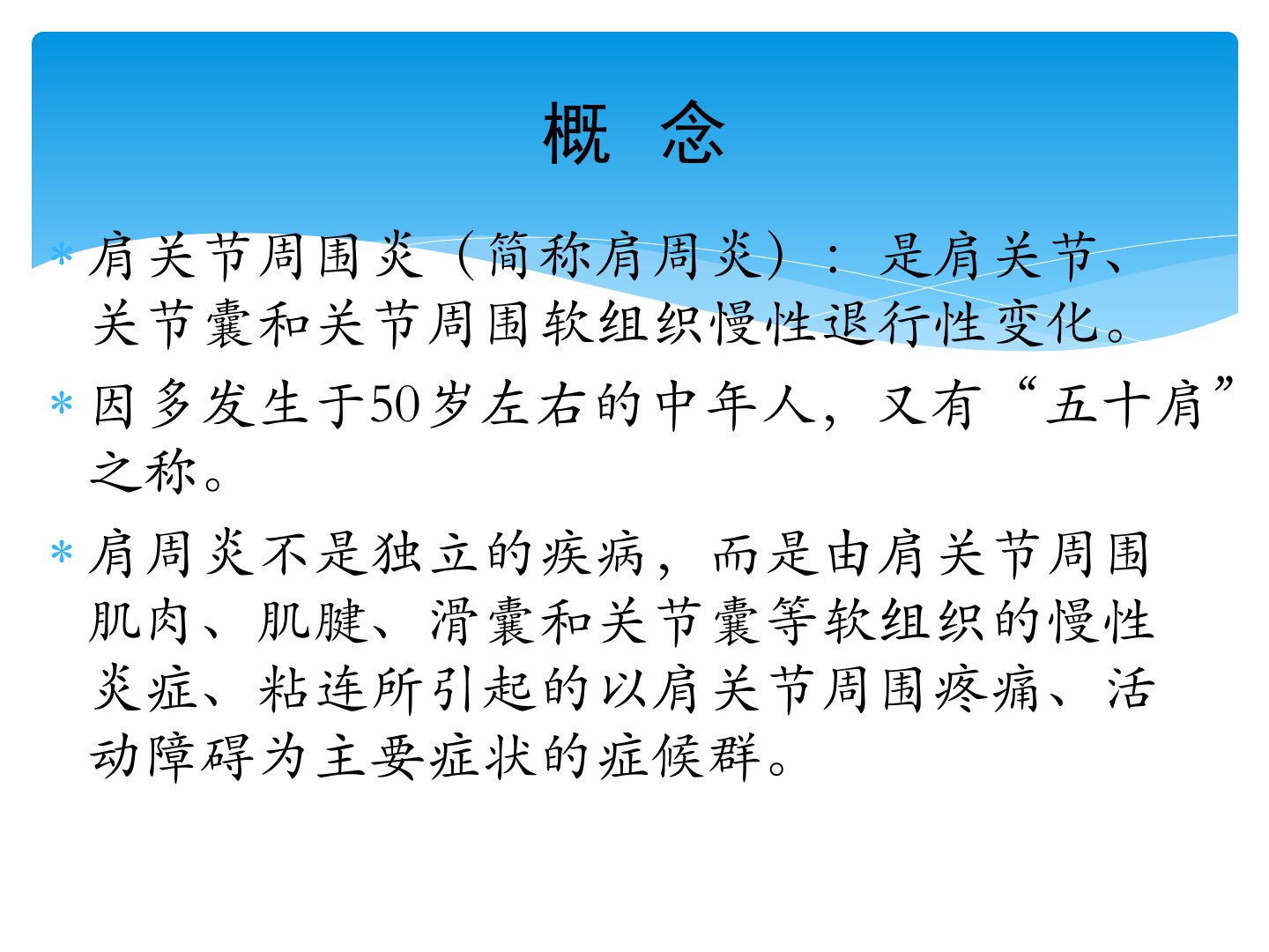 肩关节周围炎(肩周炎)是肩关节及周围软组织的慢性退行性病变多见于50岁左右人群又称“五十肩”。其病因包括肩关节退行性变、慢性劳损、急性外伤、受凉、感染、活动减少及颈椎病等。肩关节由肱骨头与肩胛骨关节盂构成活动范围大但稳定性小易受损发炎。肩周炎临床表现包括发病缓慢肩关节疼痛及活动受限夜间疼痛加重影响睡眠。病程分三期:急性期疼痛剧烈活动受限;冻结期肩关节僵化日常生活困难;恢复期肩关节活动逐渐恢复但多伴肌肉萎缩。治疗上急性期以镇痛、减轻渗出为主减少活动;冻结期及恢复期以主动和被动运动为主增加活动量。自我锻炼在肩周炎治疗中占有重要地位包括钟摆运动、手指爬墙等。预防方面老年人应加强上肢及肩部运动锻炼避免受寒可通过甩手、捞物、划圆圈、摸墙等动作预防肩周炎发生。