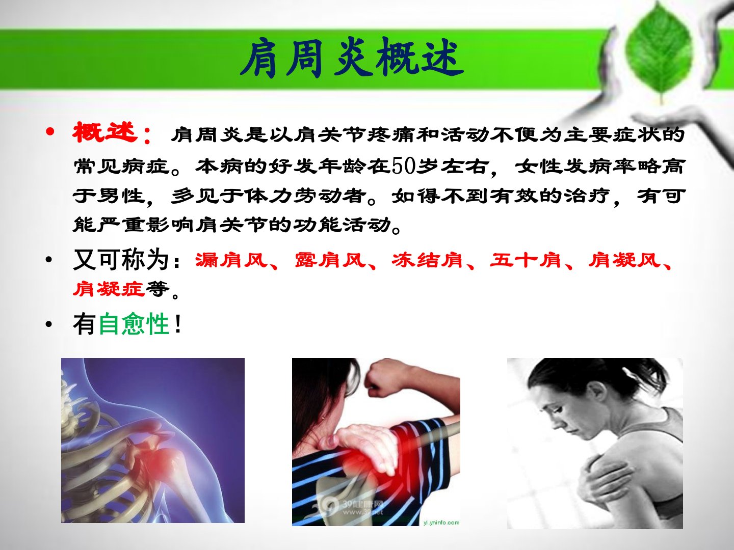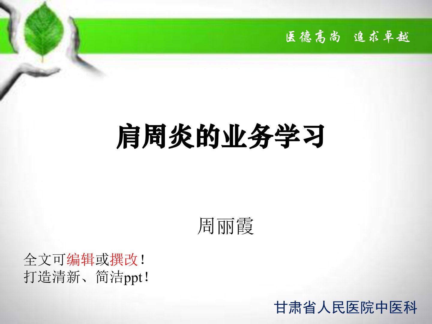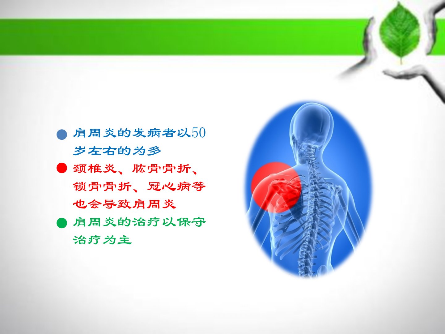 肩周炎业务学习摘要周丽霞医生在甘肃省人民医院中医科开展肩周炎业务学习。肩周炎是以肩关节疼痛和活动不便为主症的常见病好发于50岁左右人群女性发病率略高于男性多见于体力劳动者又称漏肩风等有自愈性。其发病原因多样颈椎炎、骨折、冠心病等可导致此病;外感风寒湿邪、气血不足、外伤劳损也是重要病因。临床表现上疼痛昼轻夜重有放射现象;关节活动受限有“扛肩”现象;患肩怕冷对天气变化敏感;还有压痛、肌肉痉挛与萎缩等症状。治疗以保守治疗为主功能锻炼十分关键鼓励患者多做肩关节运动如弯腰晃肩、蝎子爬墙、体后拉手等。预防方面要注意肩部保暖避风寒避免过度劳累坚持循序渐进的功能锻炼手法切忌粗暴。