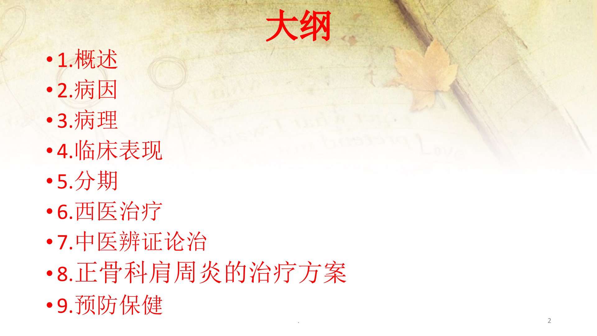 肩周炎中西医诊疗摘要肩周炎是肩关节周围炎症简称多发生于中老年人以疼痛与功能障碍为主要特征若肩关节疼痛持续3个月以上无功能障碍可排除。病因包括肩关节周围病变如软组织劳损或退变、急性创伤、缺乏锻炼等;肩外疾病如颈椎源性、冠心病及其他因素。病理上肩关节周围病变主要发生在盂肱关节周围慢性损伤致结构增生、粘连产生疼痛和功能受限。临床表现有肩部疼痛、活动受限、怕冷、压痛、肌肉痉挛与萎缩等。肩周炎分期包括开始期、冻结期、解冻期。西医治疗需明确诊断根据病期制定计划如急性期制动休息、药物理疗等慢性期功能锻炼、药物理疗等恢复期理疗肌力训练。中医认为其属“痹症”范畴辨证论治分风寒侵袭、寒湿凝滞、瘀血阻络、气血亏虚等证型。正骨科采用针刀、手法、牵引等疗法。预防保健需注意肩关节保暖、避免劳累、加强锻炼、补充营养等。