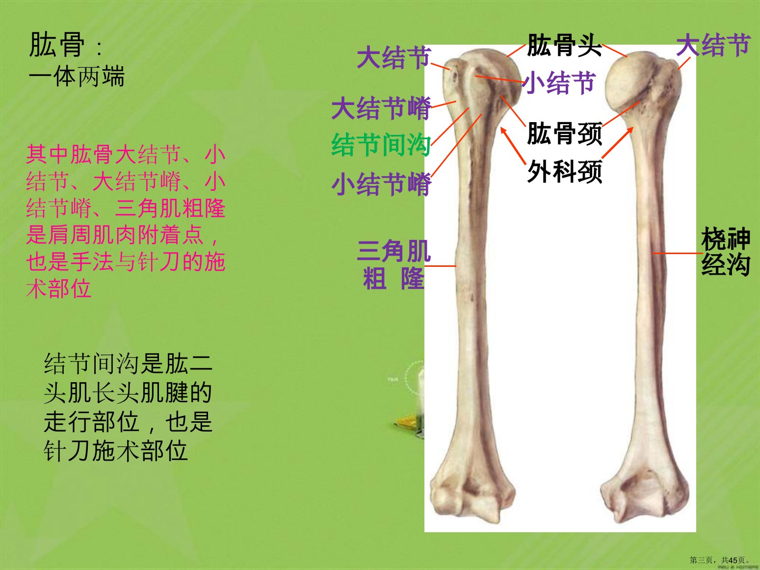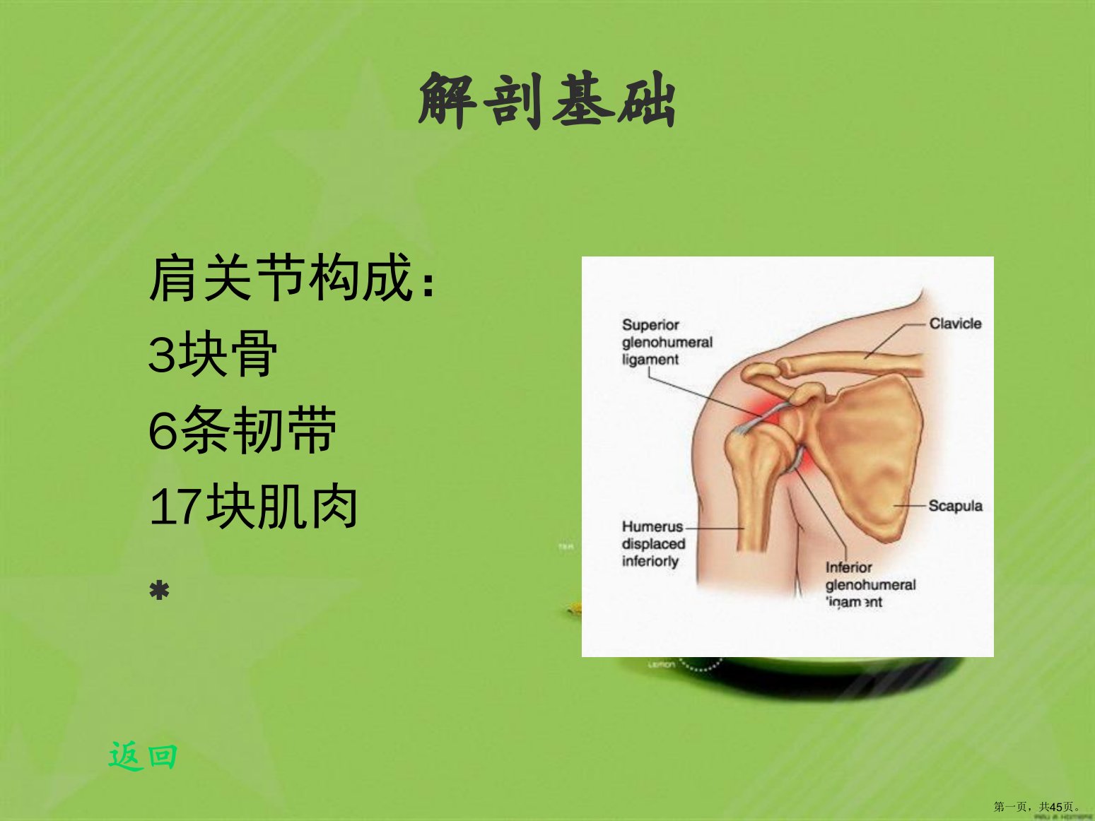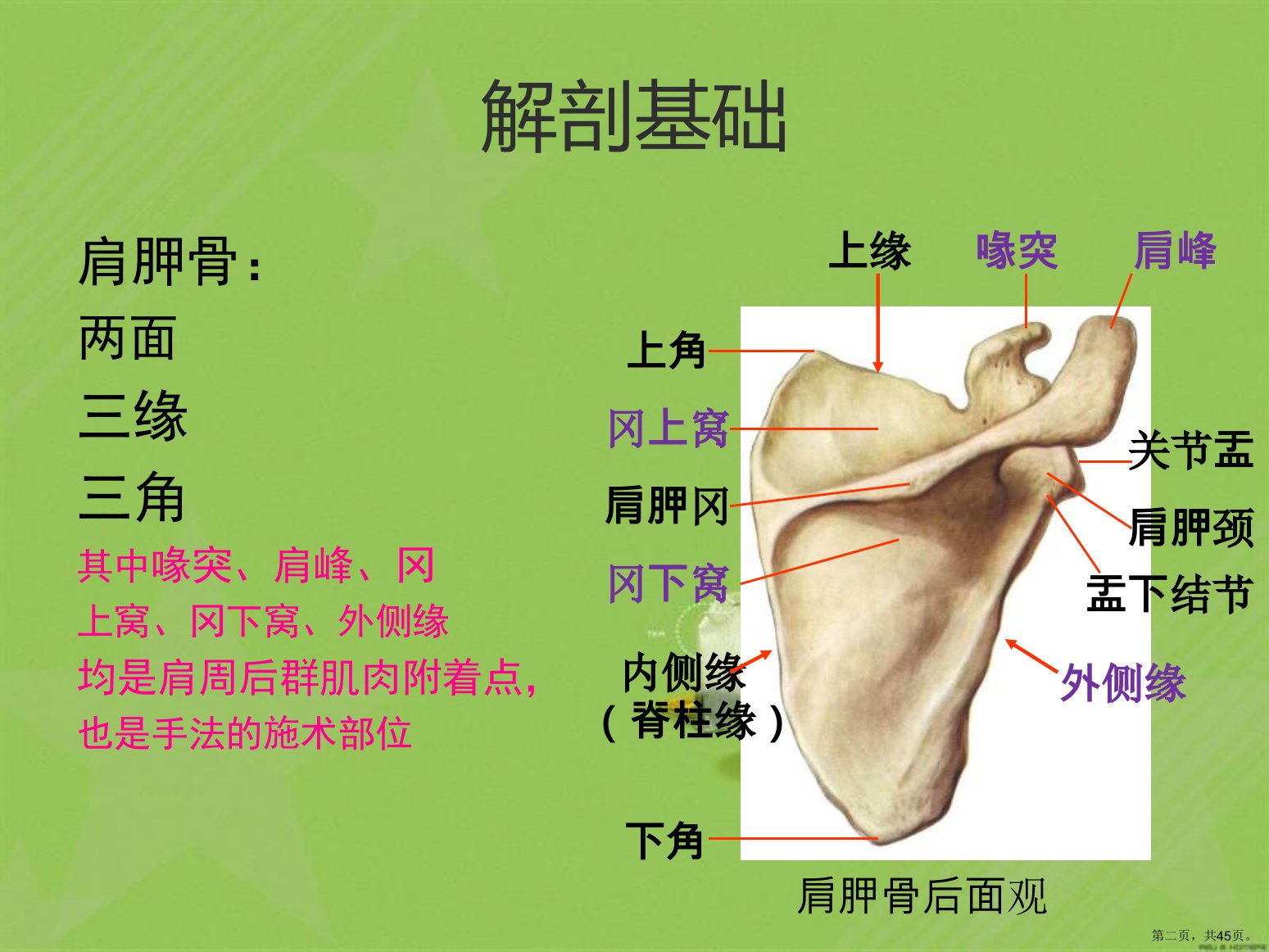 肩关节解剖基础包括3块骨、6条韧带、17块肌肉。肩胛骨两面三缘三角是肩周后群肌肉附着点及手法施术部位。肱骨一体两端是肩周肌肉附着点及手法、针刀施术部位。6条韧带分布于肩关节前部和上部受炎症侵袭会严重影响肩关节活动。连结躯干与肩胛骨的6块肌肉主要控制肩胛骨活动间接影响盂肱关节活动度。跨肩关节的11块肌肉直接影响肩关节活动。肩袖、肱二头肌腱长头、三角肌下滑囊等与肩关节囊密切相关是肩周炎主要诱发点或累及点。肩周炎指肩周肌等的慢性损伤性炎症早期疼痛中后期活动受限。其发病有肩部、肩外因素病变机制为肩关节动态平衡失调、周围广泛粘连等。早期治疗以止痛、消炎、防止粘连为主中末期治疗以牵伸挛缩组织、松解粘连为主包括针刀松解术、关节松动术等术后可配合理疗和康复锻炼巩固疗效。