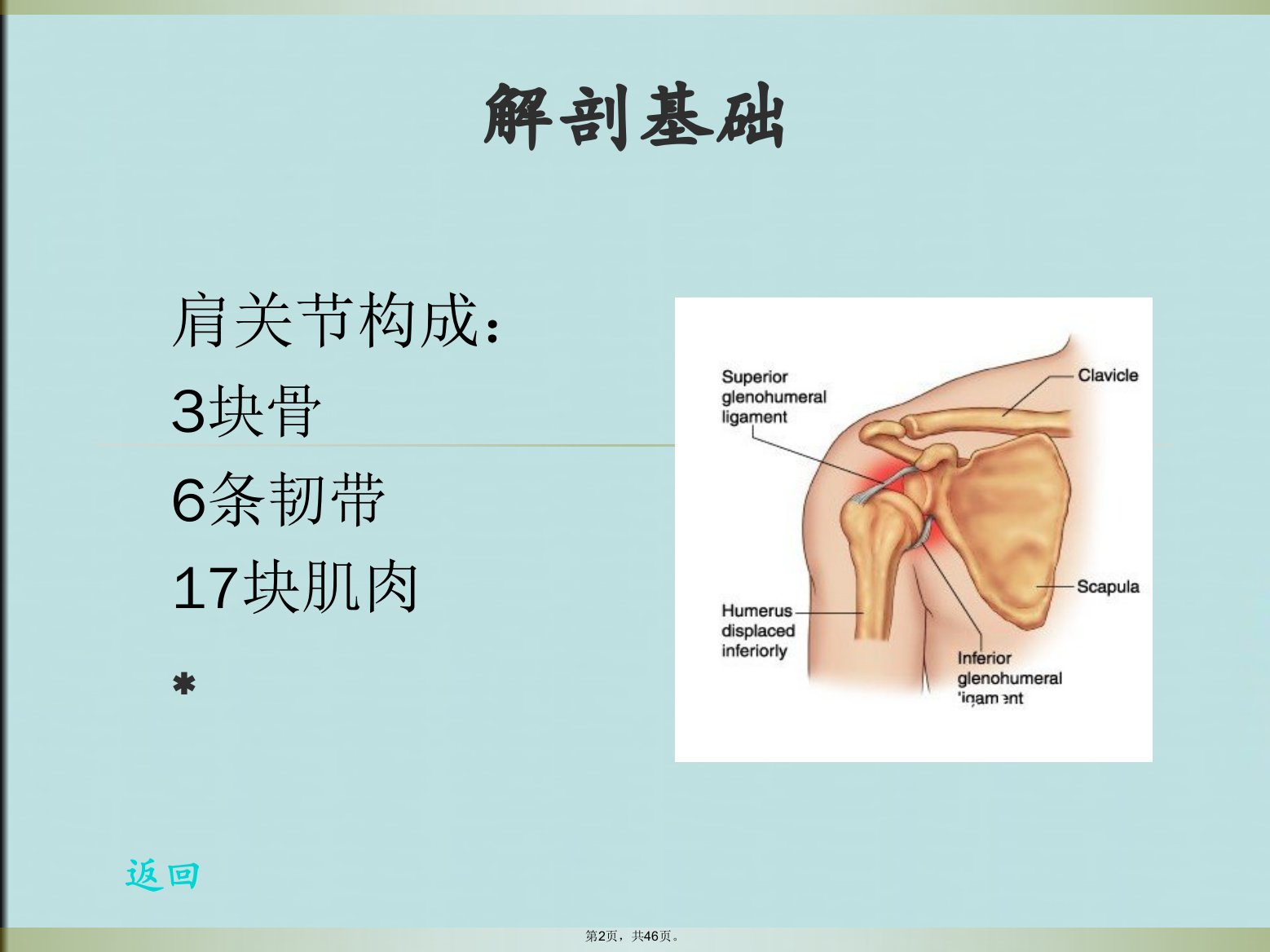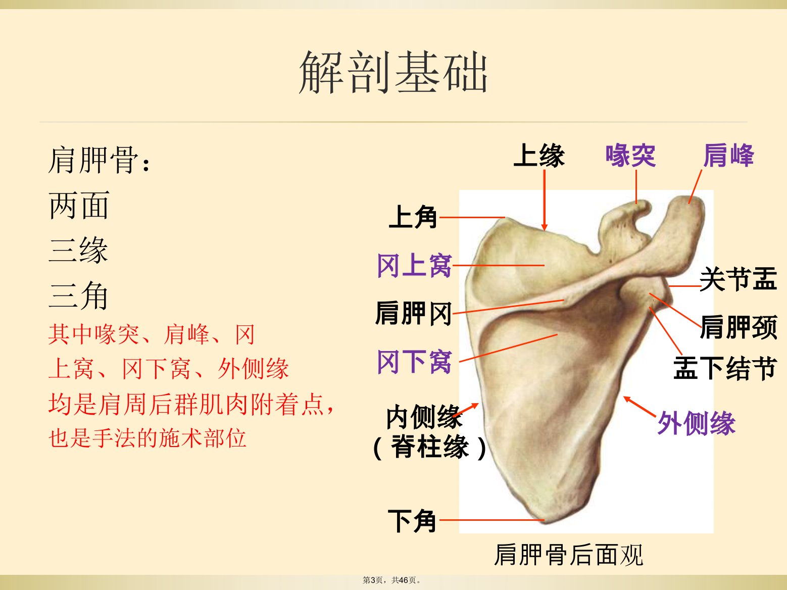 肩周炎的治疗摘要本文详细阐述了肩周炎的相关知识内容涵盖解剖基础、定义、发病原因、病变机制、临床表现及治疗手段。肩关节解剖复杂由3块骨、6条韧带、17块肌肉构成。肩胛骨两面三缘三角其多部位是肌肉附着点与手法施术部位;肱骨一体两端多部位为肌肉附着点及手法、针刀施术部位;6条韧带分布于肩关节前部和上部受炎症侵袭会严重影响肩关节活动;6块连结躯干与肩胛骨的肌肉控制肩胛骨活动间接影响盂肱关节活动度;11块跨肩关节肌直接影响肩关节活动。肩袖、肱二头肌腱长头等与肩关节囊密切相关是肩周炎主要诱发点或累及点。肩周炎俗称凝肩、冻结肩、五十肩早期疼痛中后期活动受限。发病原因包括肩部因素和肩外因素。病变机制为肩关节动态平衡失调周围广泛粘连等有四个关键病变点。治疗方面早期或急性期以止痛、消炎、防止粘连、预防功能障碍为目的方法有口服药物、局部痛点封闭、理疗等;中末期以牵伸挛缩组织、松解粘连、扩大肩部活动范围、改善肌肉萎缩为目的方法有针刀松解、关节松动术、局部牵伸技术、康复锻炼等中后期还可配合理疗巩固疗效加强肩部弱势肌群训练同时教会患者自我锻炼方法。此外针刀松解术需注意麻醉选择、松解部位及防止头静脉损伤等事项。