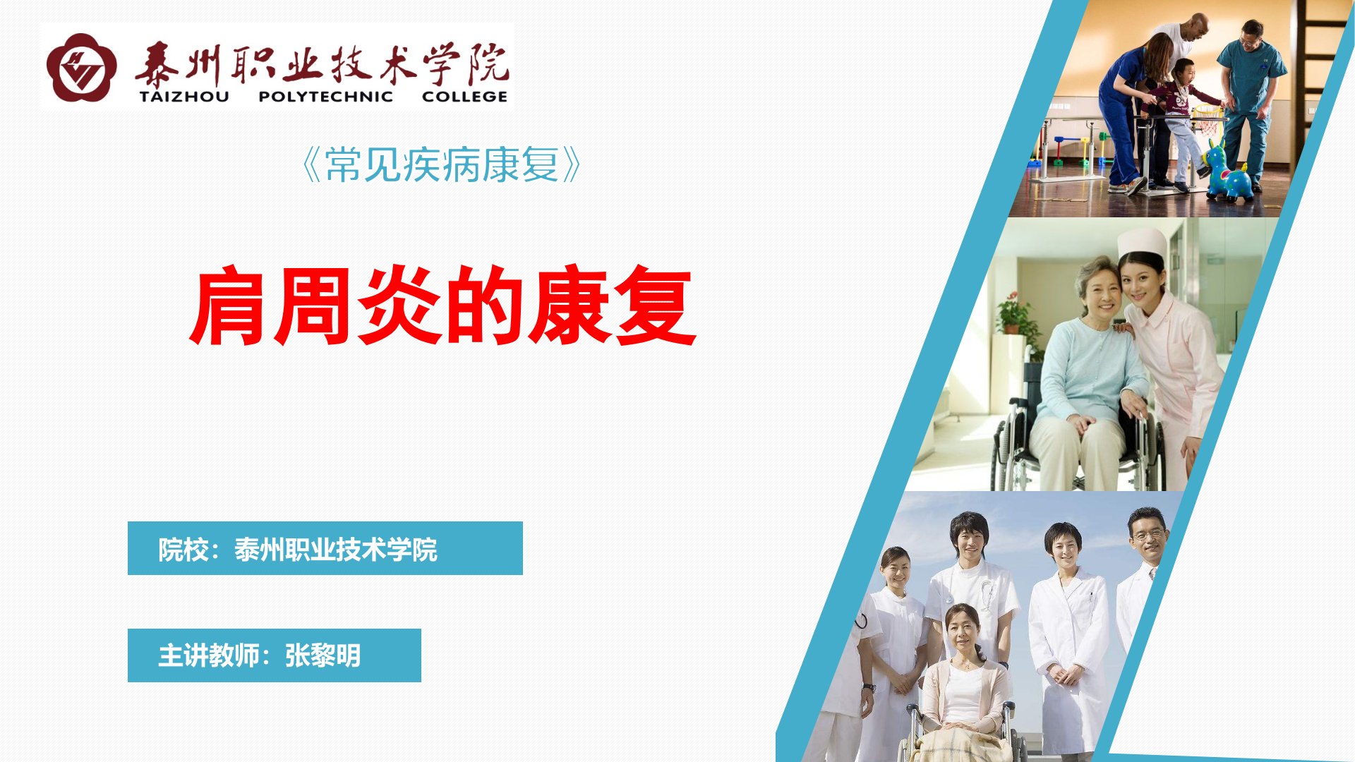 泰州职业技术学院张黎明老师在《常见疾病康复》课程中对肩周炎康复功能进行讲解。肩周炎又称冻结肩是肩关节周围组织的慢性损伤性炎症以肩部酸重、活动受限、僵直为主要症状国际定义为粘连性关节囊炎。该病好发于4060岁人群高发年龄56岁女性略多于男性非优势侧肩发病率稍高。临床诊治中患者常出现肩关节周围压痛、肌肉痉挛与萎缩、活动受限等症状。辅助检查包括X线、超声和MRI检查。肩周炎临床分为急性期、冻结期和恢复期各期特征不同。诊断时需与肩关节其他疾病鉴别。康复评定包括肩关节ROM评定、肩关节功能评价量表等。治疗方面急性期以短期制动、缓解疼痛为主运动疗法可在可忍受的轻度疼痛范围内进行肩关节被动运动;冻结期和恢复期则通过主动及被动运动、物理因子治疗等促进关节滑液流动增加关节活动度松解粘连改善血液循环促进炎症吸收同时加强肌肉收缩防止肌萎缩。推荐医疗体操包括手指爬墙、背后助拉等关节松动术和推拿治疗也有良好效果。此外体外冲击波治疗可松解组织粘连促进细胞摄氧达到止痛目的。