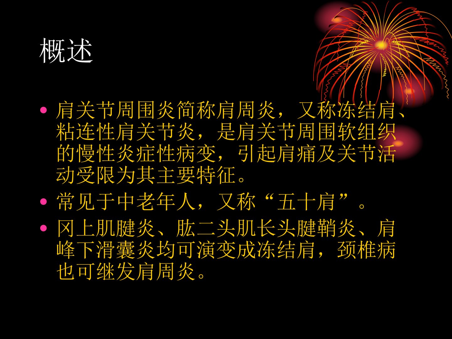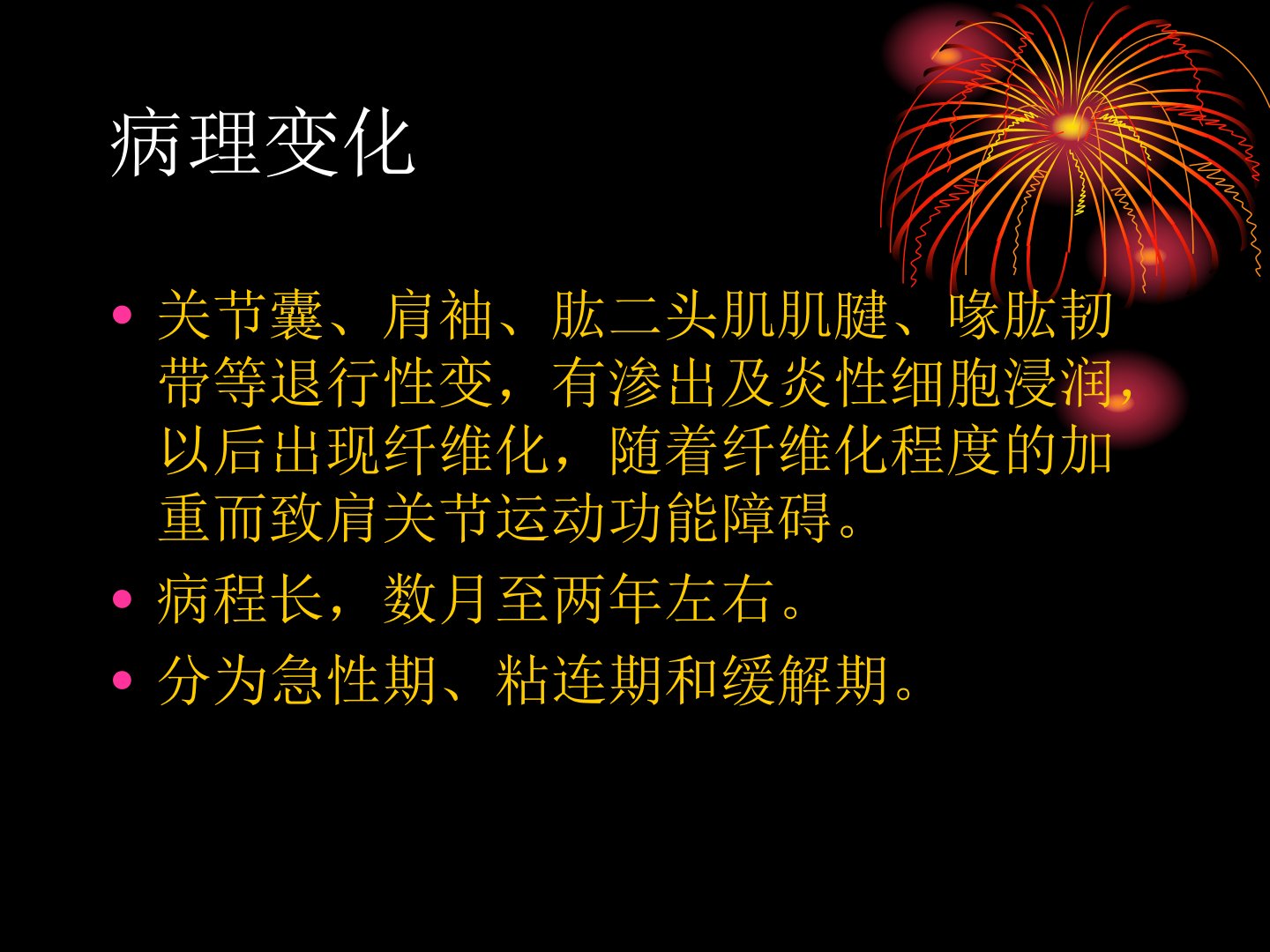 肩关节复合体含三解剖、三功能性关节活动范围大。肩胛下肌收缩可防止肩向前半脱位冈上肌可防止肱骨头向上半脱位冈下肌、小圆肌可使肩外旋。肩周炎康复涉及疼痛及功能活动度评估涵盖背包、会阴部清理等多项日常活动及内旋、外旋等动作评定。治疗上粘连期采用运动疗法如下垂摆动练习、体操棒练习、肩梯或爬墙练习、吊环练习及肌力练习等。练习时前倾90度前后、内外、画圈高血压患者需谨慎;俯卧位持棒上举、外展外旋等动作需防止代偿;持棒侧举、后举时胳膊紧贴身体;持棒体后上拉注意内旋、内收同时可配合关节松动术进行治疗。