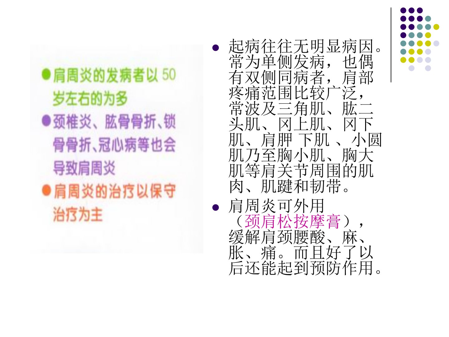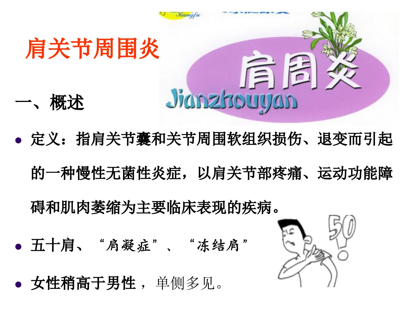 肩关节周围炎一、概述定义:指肩关节囊和关节周围软组织损伤、退变而引起的一种慢性无菌性炎症,以肩关节部疼痛、运动功能障碍和肌肉萎缩为主要临床表现的疾病。五十肩、“肩凝症”、“冻结肩”女性稍高于男性,单侧多见。起病往往无明显病因。常为单侧发病,也偶有双侧同病者,肩部疼痛范围比较广泛,常波及三角肌、肱二头肌、冈上肌、冈下肌、肩胛下肌、小圆肌乃至胸小肌、胸大肌等肩关节周围的肌肉、肌踺和韧带。肩周炎可外用(颈肩松按摩膏),缓解肩颈腰酸、麻、胀、痛。而且好了以后还能起到预防作用。肩周炎与肩痛肩周炎并非肩关节周围不明原因肩痛的统称,较为准确的命名应该是“冻结肩”或“粘连性关节囊炎”。好发于40岁~70岁的中...