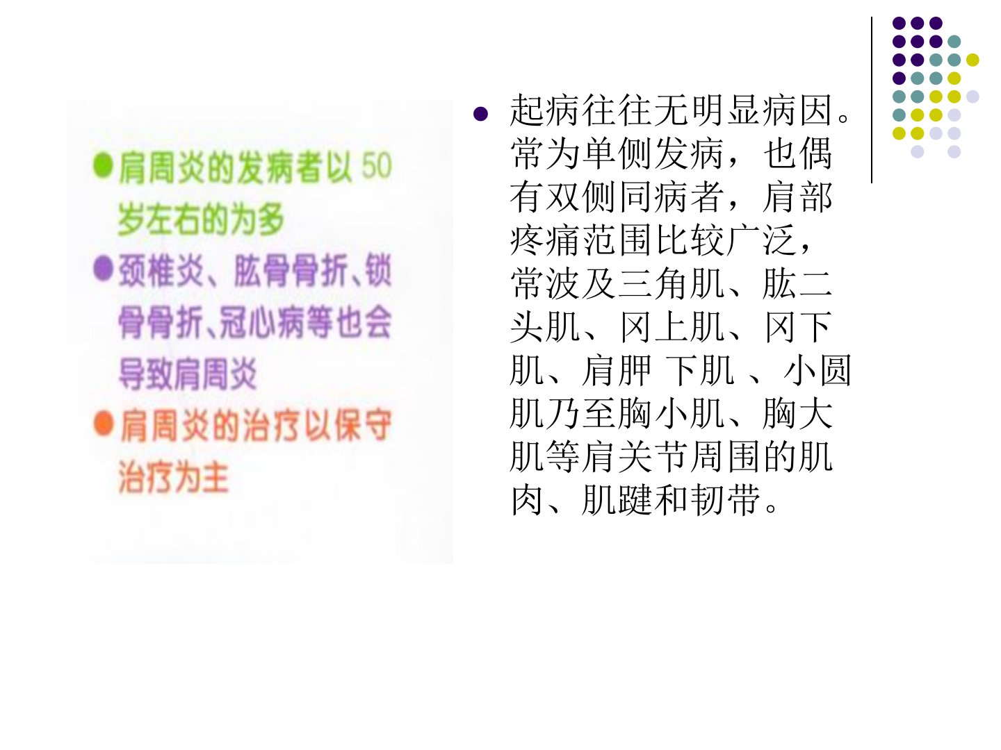 肩关节周围炎一、概述定义:指肩关节囊和关节周围软组织损伤、退变而引起的一种慢性无菌性炎症,以肩关节部疼痛、运动功能障碍和肌肉萎缩为主要临床表现的疾病。五十肩、“肩凝症”、“冻结肩”女性稍高于男性,单侧多见。起病往往无明显病因。常为单侧发病,也偶有双侧同病者,肩部疼痛范围比较广泛,常波及三角肌、肱二头肌、冈上肌、冈下肌、肩胛下肌、小圆肌乃至胸小肌、胸大肌等肩关节周围的肌肉、肌踺和韧带。肩周炎并非肩关节周围不明原因肩痛的统称,较为准确的命名应该是“冻结肩”或“粘连性关节囊炎”。好发于40岁~70岁的中老年人,大约有2%~5%的发病率,女性较男性多见。最常见的与肩周炎相混淆的疾病有“肩关节周围撞击症...