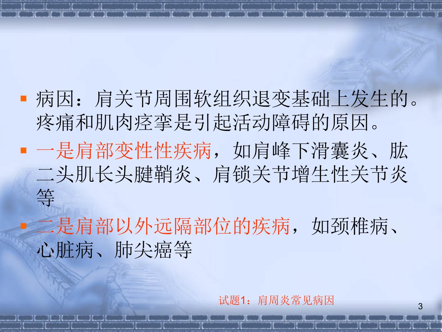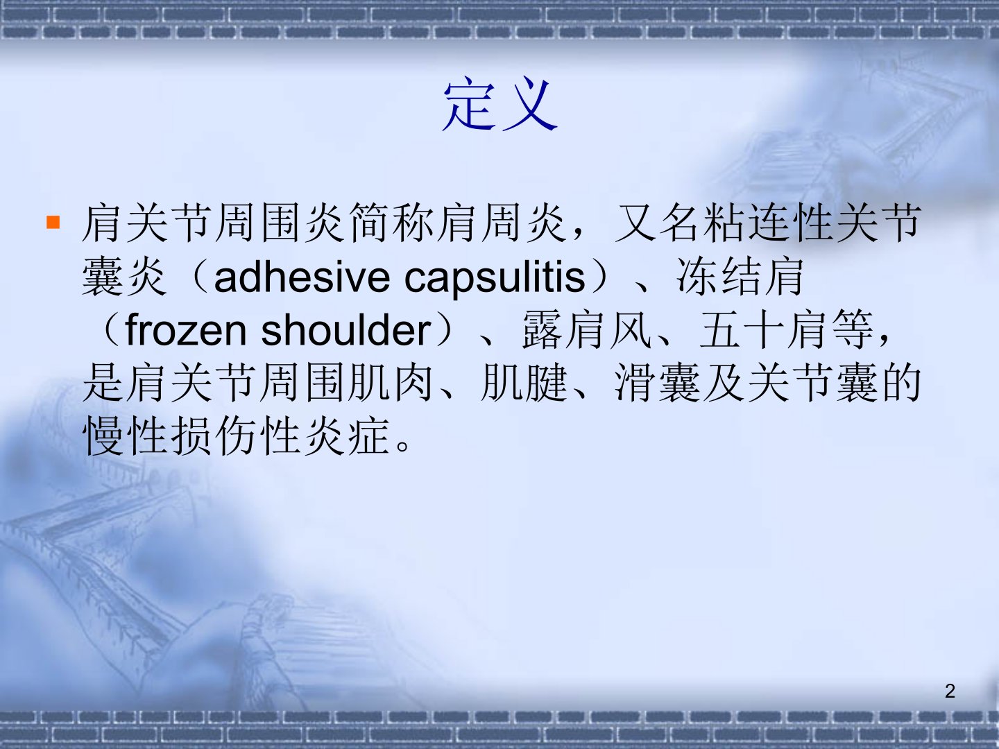 作为医生对肩周炎相关内容摘要如下:肩周炎病因多样包括肩部变性性疾病、肩部以外远隔部位疾病、过久不适当制动及局部长期不动或少动。其临床分期有冻结进行期、冻结期、解冻期各期症状不同如关节囊挛缩、关节腔容量减少、持续性肩痛夜间加重、活动度逐渐增加等还会导致肩关节活动障碍、日常生活活动能力下降及心理障碍。常见康复问题包括疼痛、关节活动度、肌力及肩关节功能评定。评定方法多样其中关节活动度练习应在肩关节可忍受的轻度疼痛范围内进行此为肩周炎运动疗法基本原则。此外被动活动及养成预防肩周炎的三个好习惯也很重要。