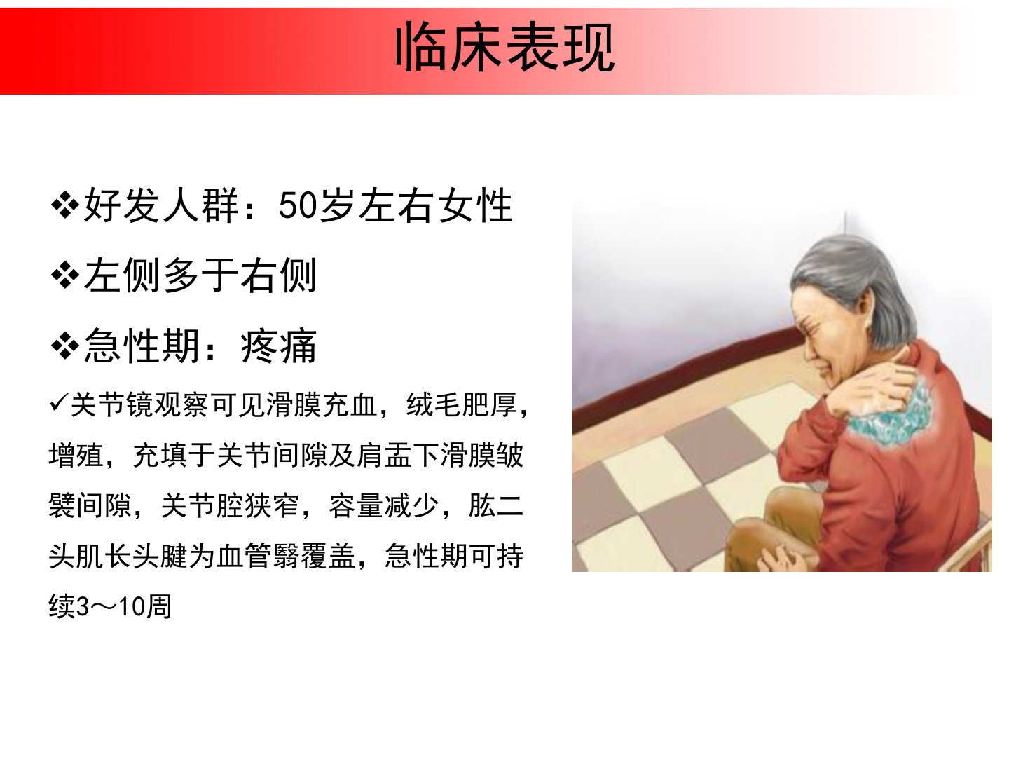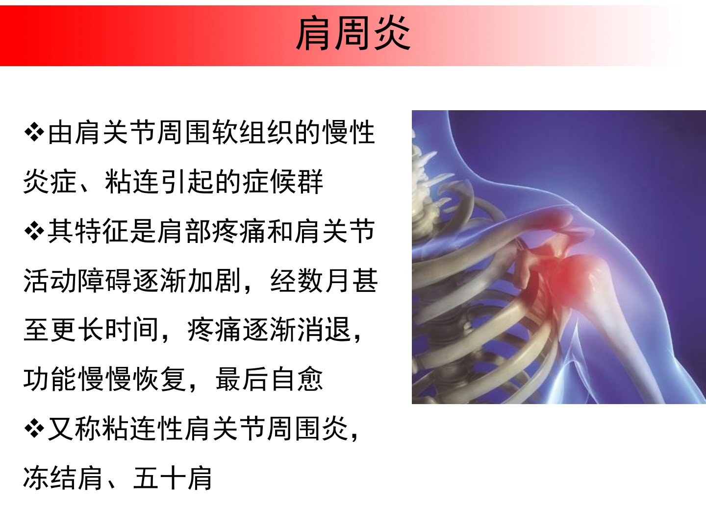肩周炎由肩关节周围软组织慢性炎症、粘连引发特征为肩部疼痛和活动障碍可自愈又称冻结肩、五十肩。其好发于50岁左右女性左侧多于右侧分急性期、慢性期、功能康复期。急性期疼痛明显关节腔狭窄;慢性期疼痛减轻但关节僵硬活动困难;功能康复期炎症吸收功能逐步恢复。肩周炎病因尚不明确一般认为与肩关节活动受限、软组织退行性病变、上肢病变等因素有关。治疗包括一般治疗如药物治疗、神经阻滞、针刀疗法、麻醉下松解术、功能锻炼等。肩周炎需与多种疾病鉴别。肩关节穿刺有前侧、后侧、肩峰下滑囊入路等途径。病例讨论中患者右肩疼痛6月余首次治疗痛点阻滞效果不佳复诊后考虑肩袖损伤需进一步检查并治疗。肩袖由肩胛下肌、冈上肌、冈下肌、小圆肌组成损伤多见于40岁以上男性判断损伤程度有多种方法。治疗急性期需休息、制动、局部理疗等慢性期可手术修补或加固肩袖并进行功能康复训练。病史查体是诊断基础治疗无效时应考虑重新诊断必要时多学科联合诊治。
