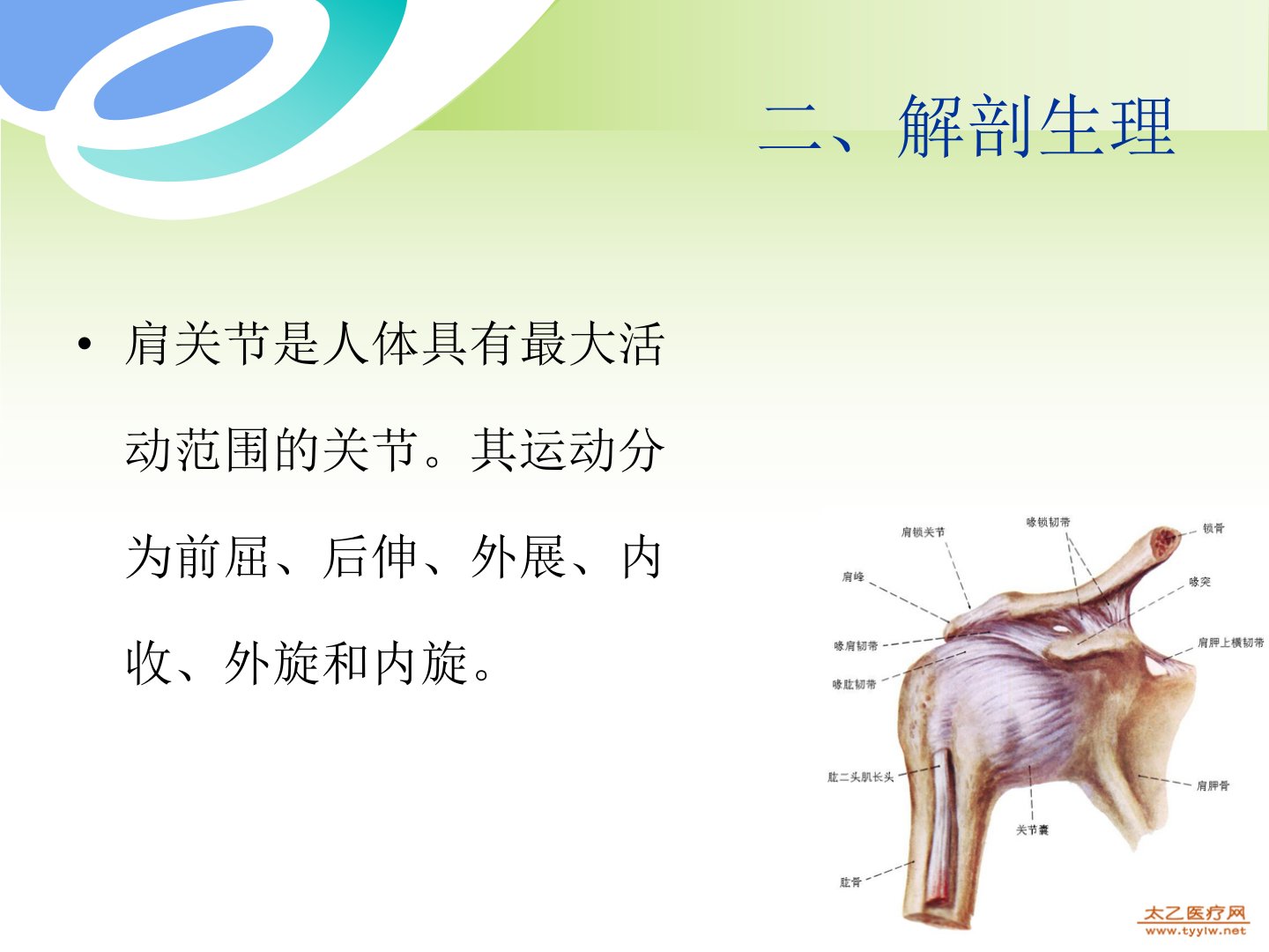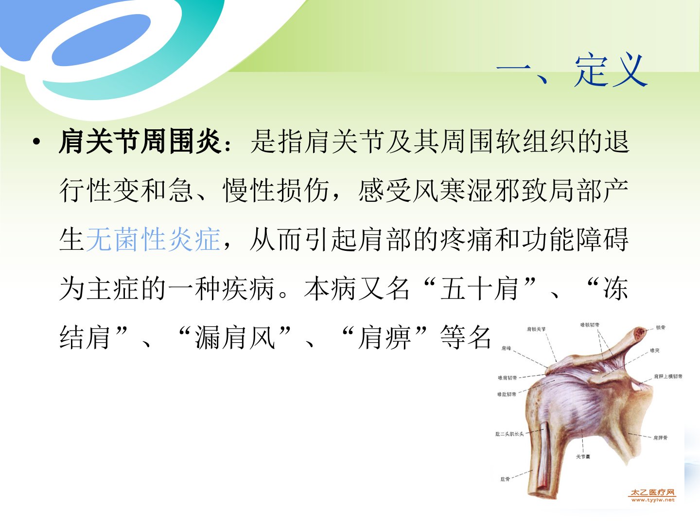 摘要肩周炎1定义:肩关节及其周围软组织退行性变等致无菌性炎症引起肩部疼痛和功能障碍又名“五十肩”等。2解剖生理:肩关节活动范围大运动多样。3病因病机:外伤劳损、肝肾亏虚气血不足、外感风寒湿邪。4临床表现:急性期肩部疼痛活动受限;慢性期肩痛减轻关节挛缩僵硬;恢复期肩痛基本消失。5检查:望诊两侧对比特殊检查有搭肩试验。6中医辨证:分风寒侵袭、寒湿凝滞、瘀血阻络、气血亏虚四型。7治疗:初期疏通经络活血止痛后期松解粘连滑利关节;取穴有肩井等;手法多样。8注意事项:治疗前拍片排除病变手法轻柔注意保暖适当锻炼。预后良好有特殊病史者效果差。网球肘1定义和临床表现:肱骨外上髁炎肘关节外侧疼痛压痛活动时加重。2病因:长期前臂过度活动中老年文职人员提重物。3治疗:休息、艾灸、服药、可的松局部封闭。腕管综合征1概述:腕管内容积减少等致正中神经卡压引发手指麻木乏力等症状。2病因病机:手部慢性损伤风湿等疾病诱发。3临床表现与诊断:早期手指麻木刺痛晚期大鱼际肌萎缩等。4治疗方法:按揉法、擦法、拔伸法。