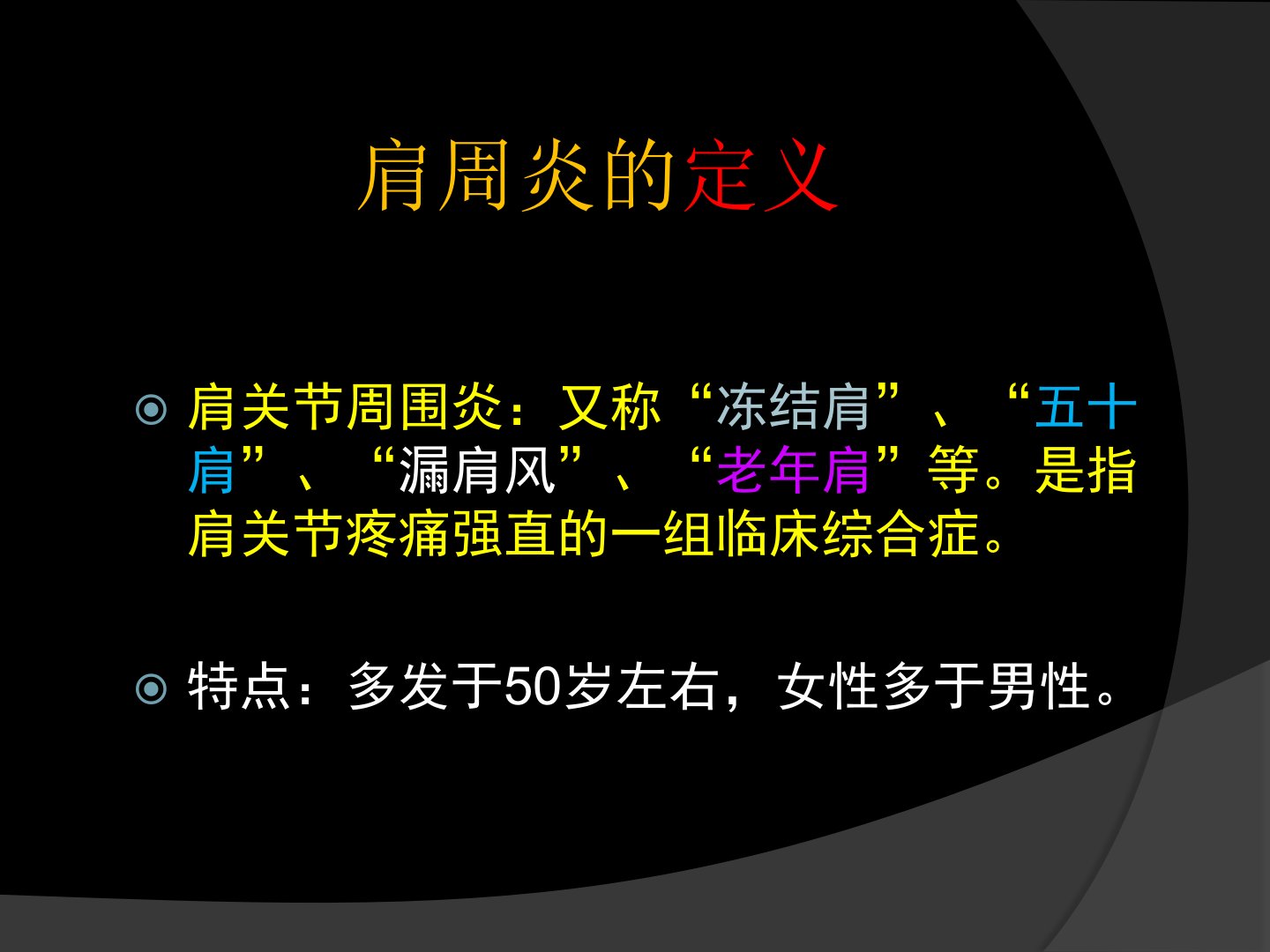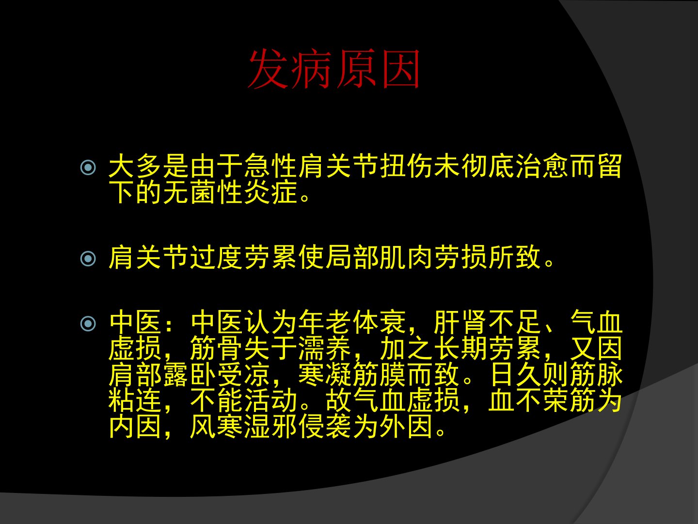 平凉市中医医院骨2科王军介绍了肩周炎的诊断及治疗。肩周炎又称“冻结肩”等指肩关节疼痛强直的临床综合症多发于50岁左右女性。发病原因多为急性肩关节扭伤未愈留下的无菌性炎症或肩关节过度劳累中医认为与年老体衰、肝肾不足、气血虚损及风寒湿邪侵袭有关。临床表现初期为肩或上臂疼痛活动后加重夜间痛醒;后期肩关节活动受限。诊断多发于中老年人伴退行性变初期轻度疼痛逐渐加重活动范围受限体格检查可见肩部肌肉萎缩活动受限。中医诊断分为风寒湿阻证、血虚寒凝证、瘀血阻络证。病程分疼痛期、冻结期、恢复期。影像学表现多为阴性但可排除骨与关节疾病。治疗分中医西医中医采用内治法、手法治疗、针灸、外敷药物等;西医采用非手术疗法包括药物治疗、局封治疗、臭氧注射治疗、理疗及练功疗法长期保守治疗无效者可考虑手术治疗。