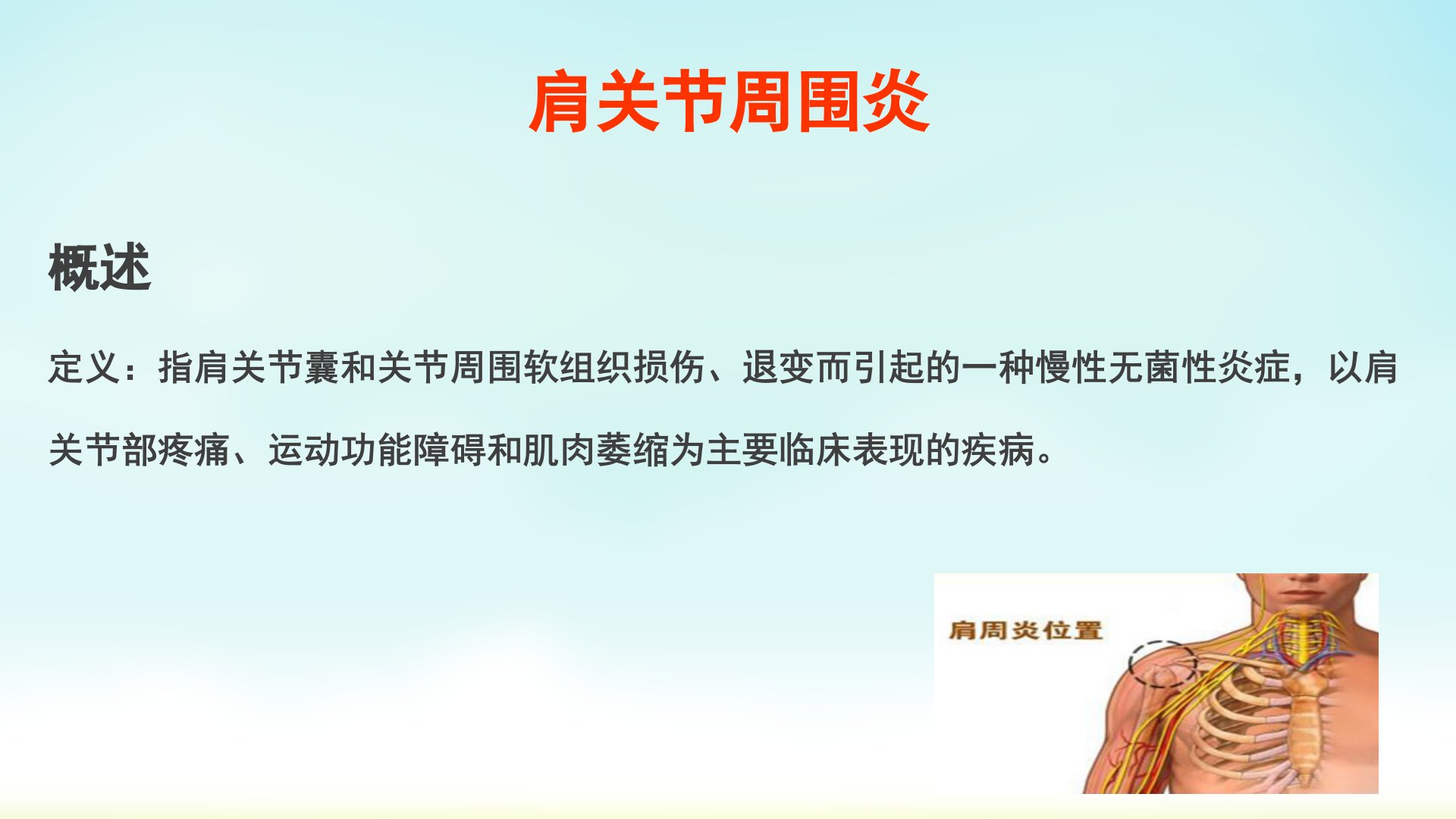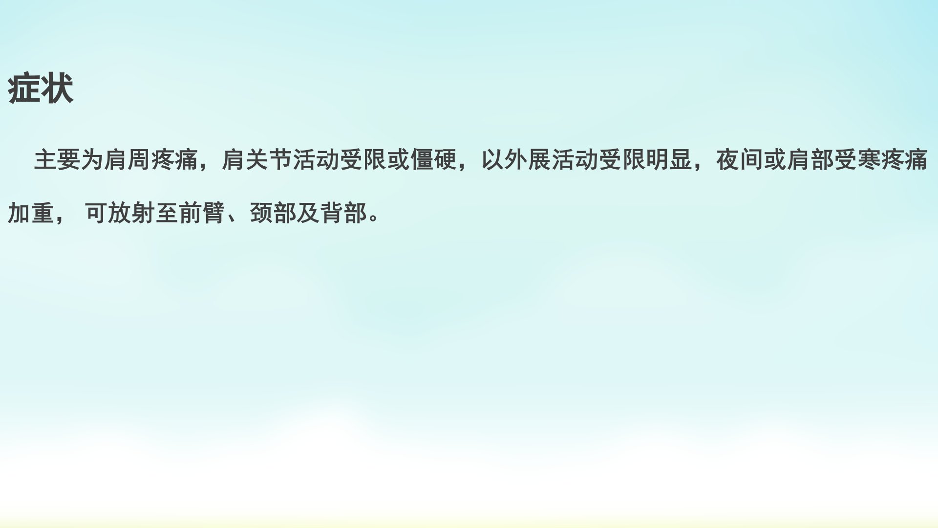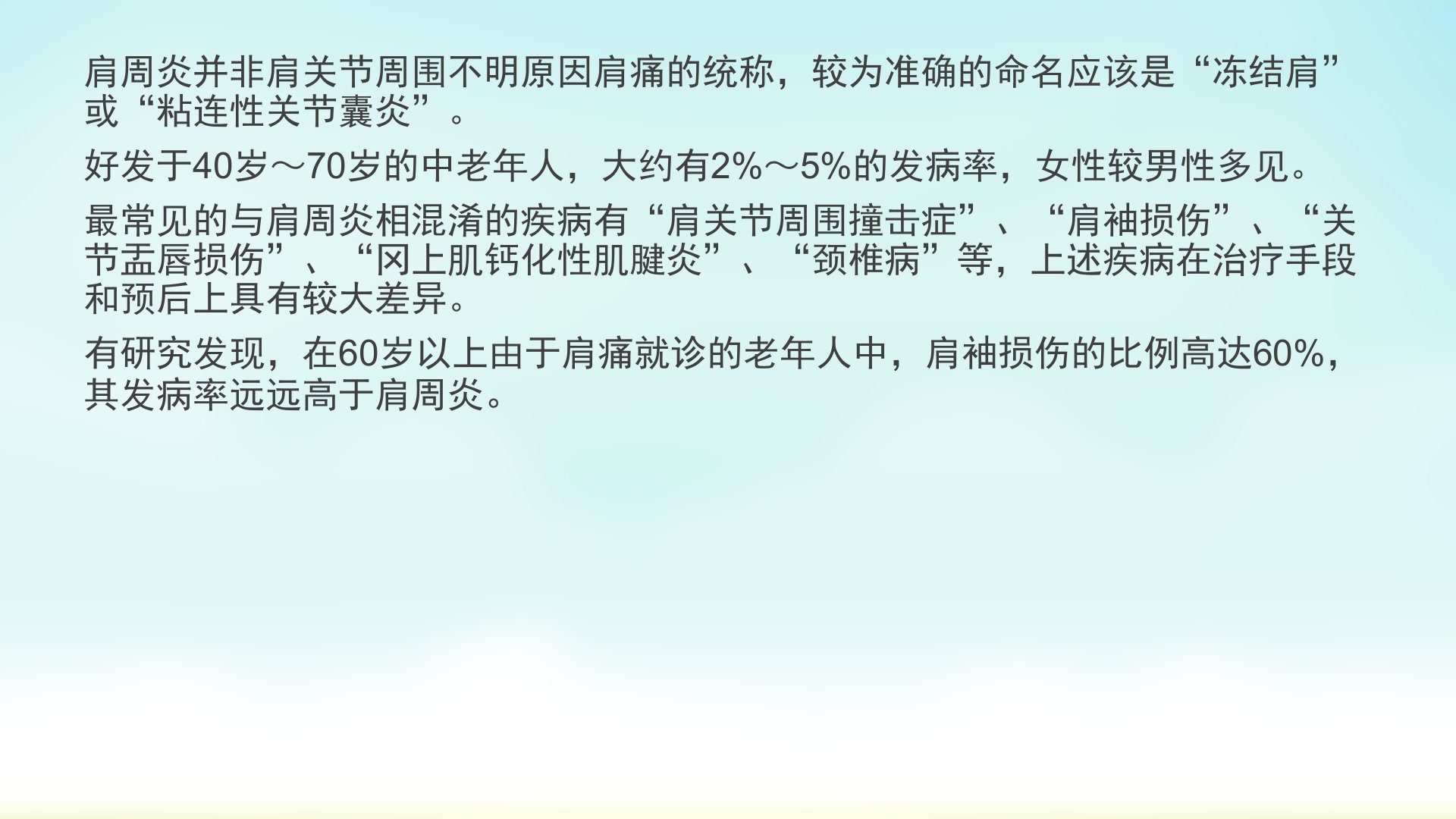 肩关节周围炎又称“冻结肩”或“粘连性关节囊炎”是肩关节囊和周围软组织损伤、退变引发的慢性无菌性炎症主要表现为肩部疼痛、运动功能障碍和肌肉萎缩。该病好发于4070岁中老年人女性多见易与“肩关节周围撞击症”、“肩袖损伤”等疾病混淆。肩周炎病程长分急性期、粘连期和缓解期三阶段各阶段症状不同。其病因可能与肩部活动减少、肩关节损伤、无菌性炎症粘连等因素有关。诊断依据包括中老年人慢性起病、肩部酸痛、活动受限等。治疗初期以提高痛阈、改善局部血液循环为主后期以改善肩关节活动、松解关节粘连为主方法有理筋通络、肩周炎松解术等其中松解术需有经验医师执行。肩周炎有自愈过程预后关键在于功能锻炼包括主动运动和松动粘连等体育疗法。