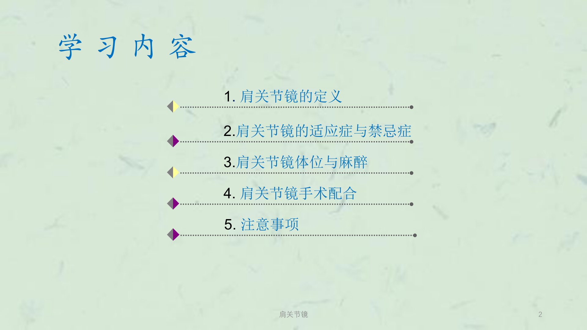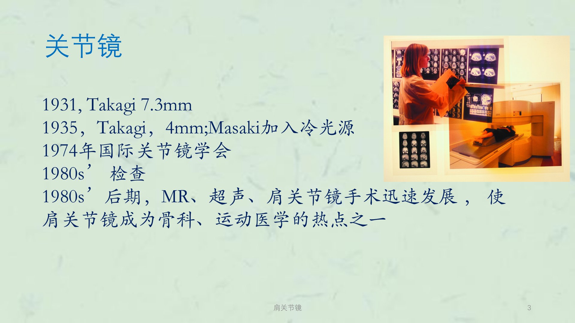 肩关节镜手术要点综述肩关节镜发展历程悠久自1931年Takagi使用73mm关节镜起步至1974年国际关节镜学会成立80年代后MR、超声及肩关节镜手术快速发展成为骨科、运动医学热点。其优点显著适应症广泛涵盖诊断性检查及多种病症治疗如肱二头肌腱病变、盂唇损伤等。手术体位有沙滩椅位、侧卧位等各有优劣。麻醉方式中全麻利于控制性降压臂丛麻醉止痛不完全但可减少全麻药量全麻臂丛联合是首选。术中出血控制通过控制性降血压、合理入水灌注系统、射频电凝止血实现。用物准备包括一次性物品、仪器、无菌包及相关耗材。手术入路多样以肩峰成型术为例介绍了后入路操作流程。术中巡回与器械护士各有职责前者做好核查、体位安置等工作后者提前准备、保证无菌操作并及时提供器械。术后要注意患者体位摆放同时要预防颈椎损伤、臂丛神经麻痹等并发症。此外课件还提出了手术标识、全麻患者头部固定方法等讨论点。