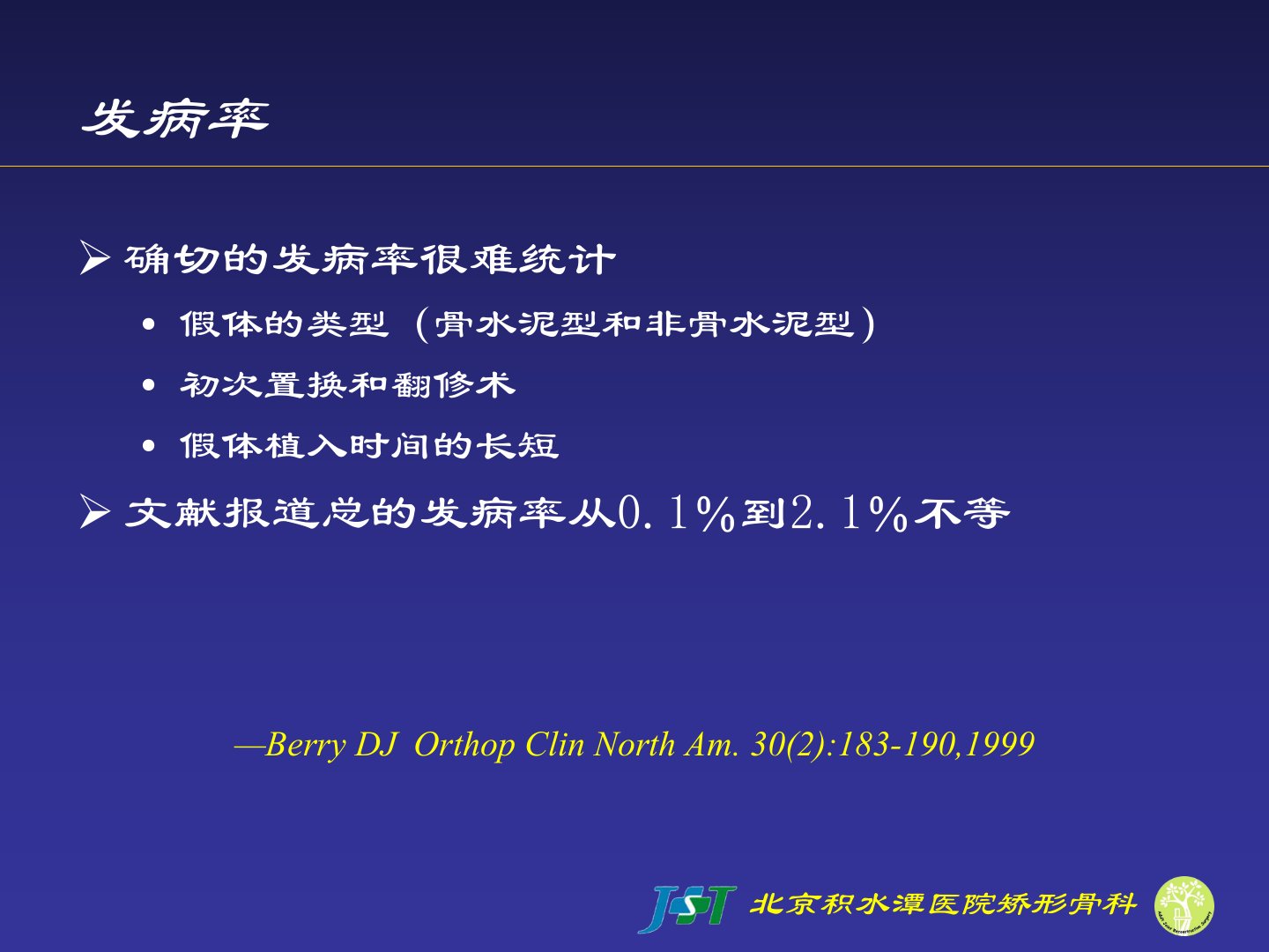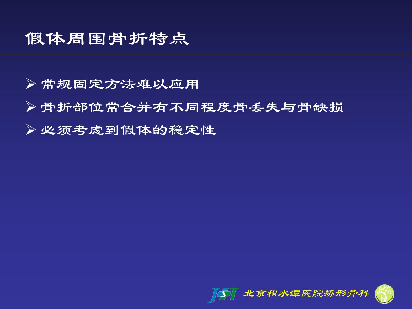 北京积水潭医院矫形骨科周乙雄、吕明介绍了髋关节置换术后股骨假体周围骨折的特点、发病率、病因、分型及治疗方法。常规固定方法难以应用骨折部位常合并骨丢失与缺损必须考虑假体稳定性。发病率因假体类型、置换次数等因素而异文献报道在01到21之间。病因包括外伤、骨皮质缺损、翻修术、假体松动、骨质疏松和骨溶解等。分型以Vancouver分型最为公认其综合考虑了骨折部位、假体稳定性和宿主骨剩余骨量等因素。治疗方法分非手术和手术非手术包括密切观察、牵引术、石膏或支具适应征少;手术包括髓内固定、翻修术、髓外固定等适应征包括假体松动或断裂、骨折明显成角畸形等。治疗方案的选择要根据骨折部位、假体稳定性、剩余骨量、病人年龄、健康状况和活动水平而定。