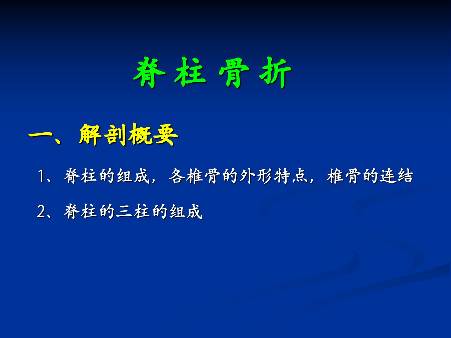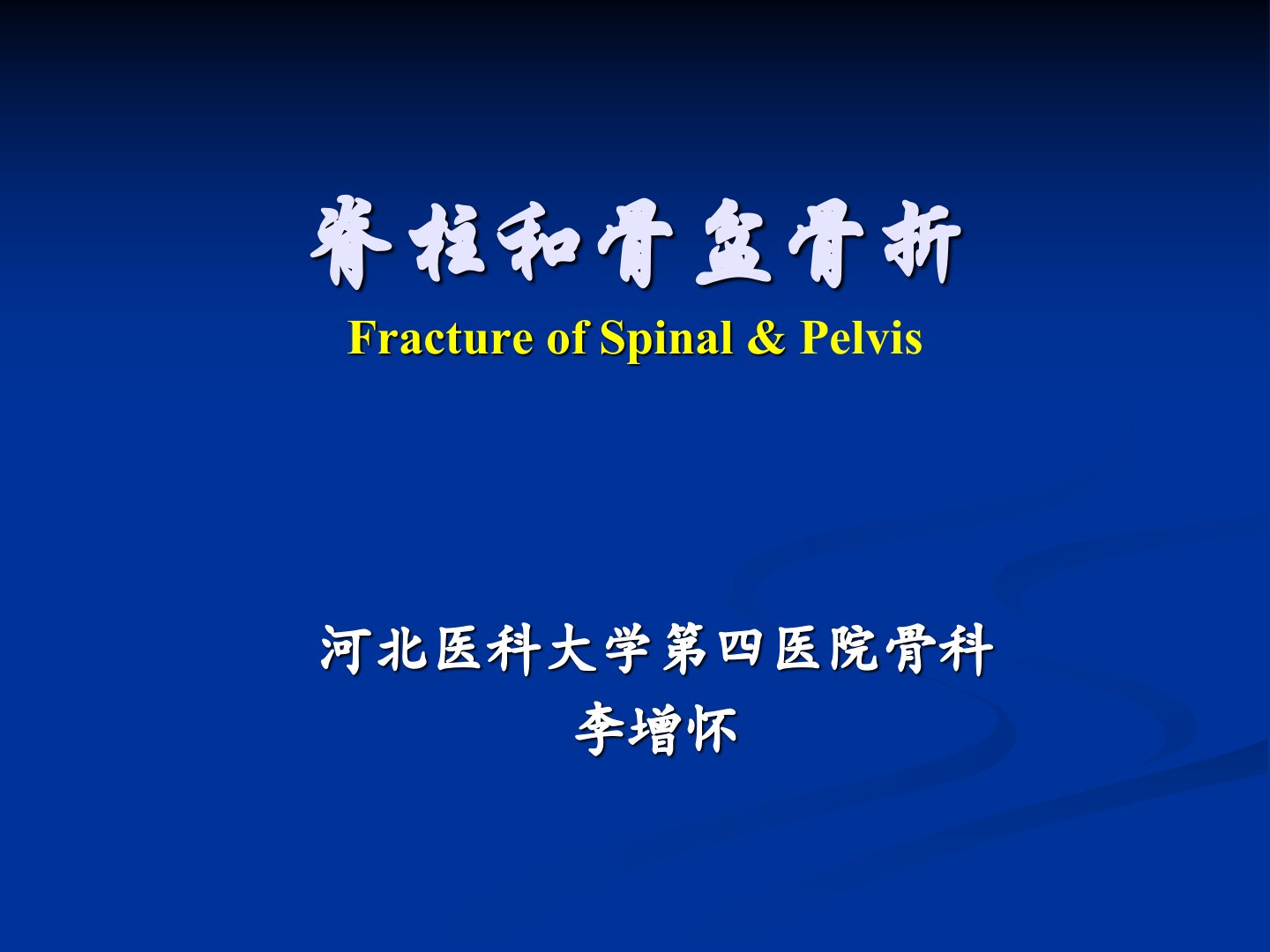 脊柱和骨盆骨折摘要本文是河北医科大学第四医院骨科李增怀关于脊柱和骨盆骨折的论述。首先介绍了脊柱的解剖概要包括脊柱的组成、三柱结构等。暴力是颈、胸、腰椎骨折的主要原因脊柱骨折可根据受伤机制、骨折后的稳定性、骨折形态进行分类。脊柱骨折的临床表现包括严重外伤史、局部疼痛、站立及翻身困难等需详细询问受伤情况进行脊柱和影像学检查。急救搬运应采用滚动法或平托法。治疗方面颈椎骨折包括上颈段损伤和下颈椎损伤的不同处理方式胸腰椎损伤则根据压缩、爆裂、屈曲分离、骨折脱位、附件骨折等情况进行相应治疗。脊髓损伤包括脊髓震荡、脊髓休克、不完全脊髓损伤、完全性脊髓损伤、脊髓圆锥综合征、马尾损伤治疗原则包括固定、减轻脊髓水肿和继发性损害、手术治疗等。骨盆骨折方面介绍了骶股弓和骶坐弓的承重作用按骨盆环稳定型和暴力方向进行了分类。临床表现包括外伤史、骨盆分离与挤压试验等体检结果以及X线、CT检查。并发症包括盆腔出血、腹腔内脏损伤等。治疗原则为优先处理危及生命的外伤或并发症全身稳定后及时处理合并伤与并发症稳定性骨折无需复位固定旋转不稳定骨折采用外固定架复位、固定不稳定骨折在全身情况稳定后积极手术治疗。髋臼骨折方面介绍了受