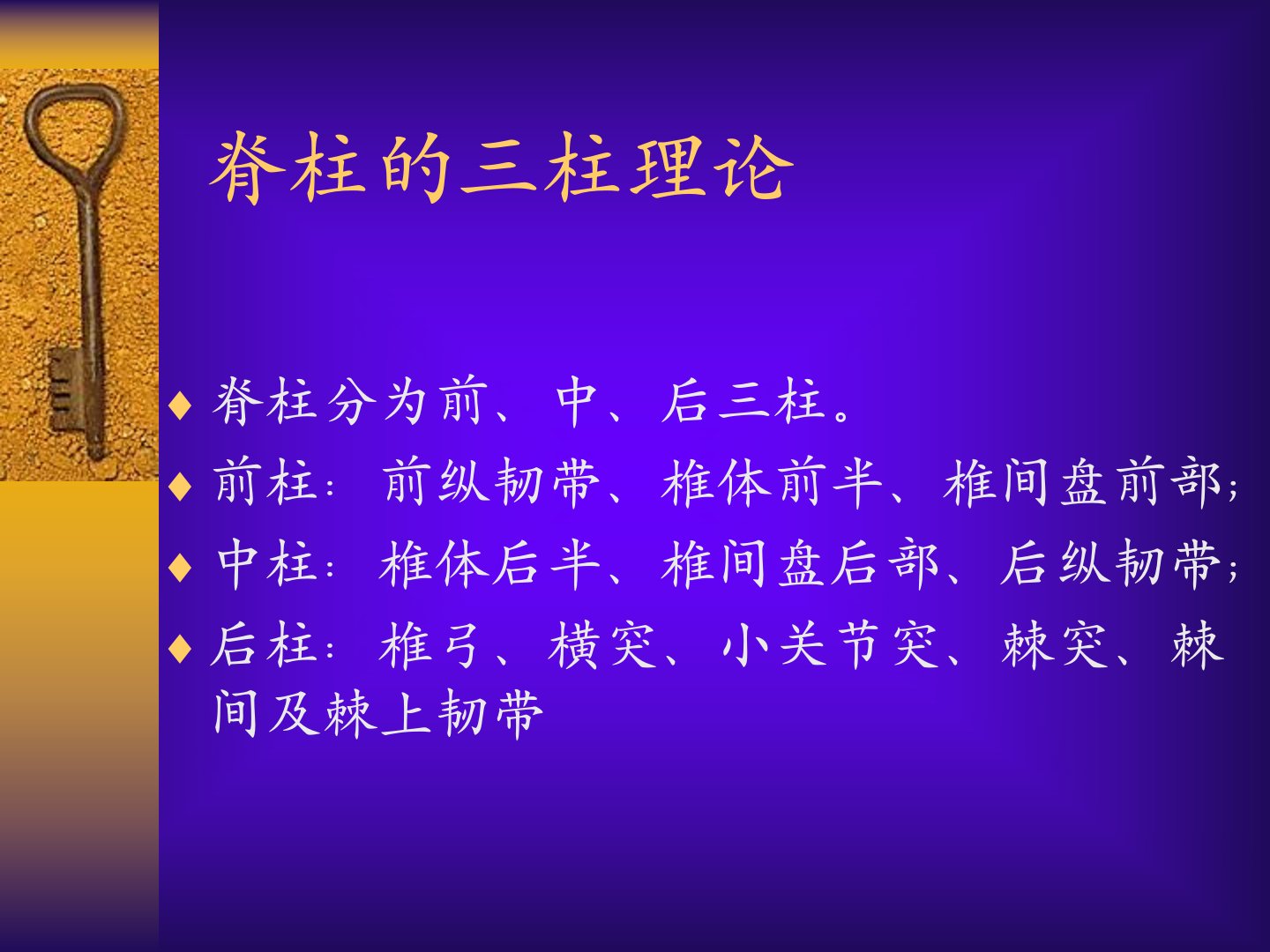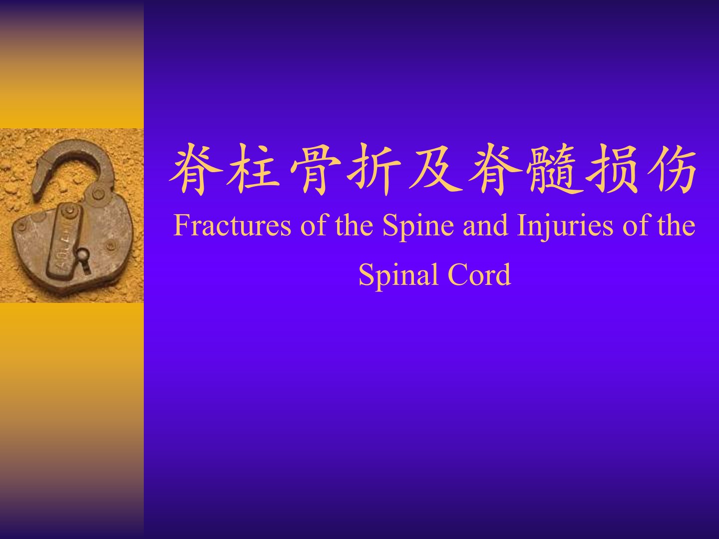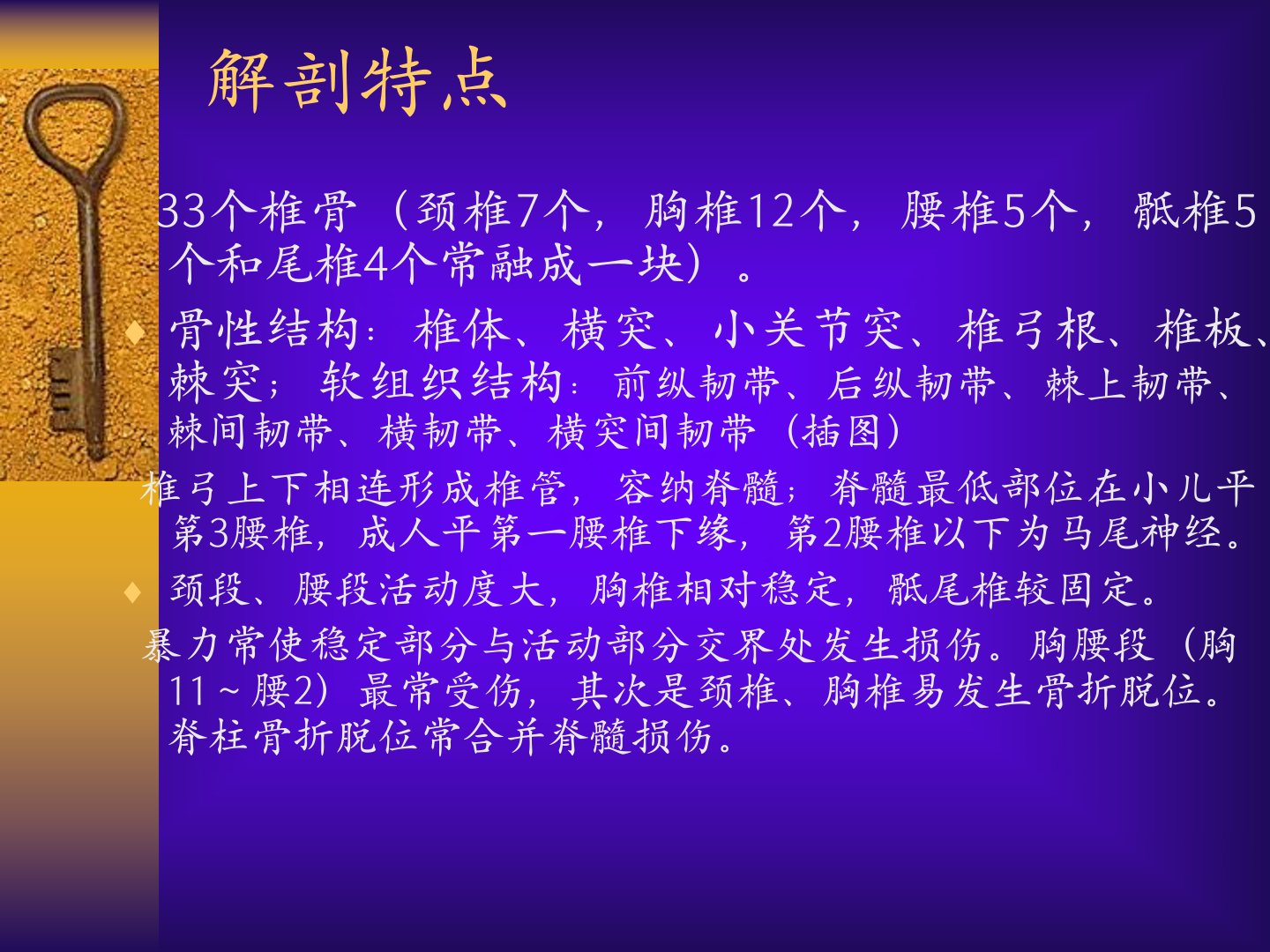脊柱骨折及脊髓损伤FracturesoftheSpineandInjuriesoftheSpinalCord解剖特点33个椎骨(颈椎7个,胸椎12个,腰椎5个,骶椎5个和尾椎4个常融成一块)。骨性结构:椎体、横突、小关节突、椎弓根、椎板、棘突;软组织结构:前纵韧带、后纵韧带、棘上韧带、棘间韧带、横韧带、横突间韧带(插图)椎弓上下相连形成椎管,容纳脊髓;脊髓最低部位在小儿平第3腰椎,成人平第一腰椎下缘,第2腰椎以下为马尾神经。颈段、腰段活动度大,胸椎相对稳定,骶尾椎较固定。暴力常使稳定部分与活动部分交界处发生损伤。胸腰段(胸11~腰2)最常受伤,其次是颈椎、胸椎易发生骨折脱位。脊柱骨折脱位常合并...