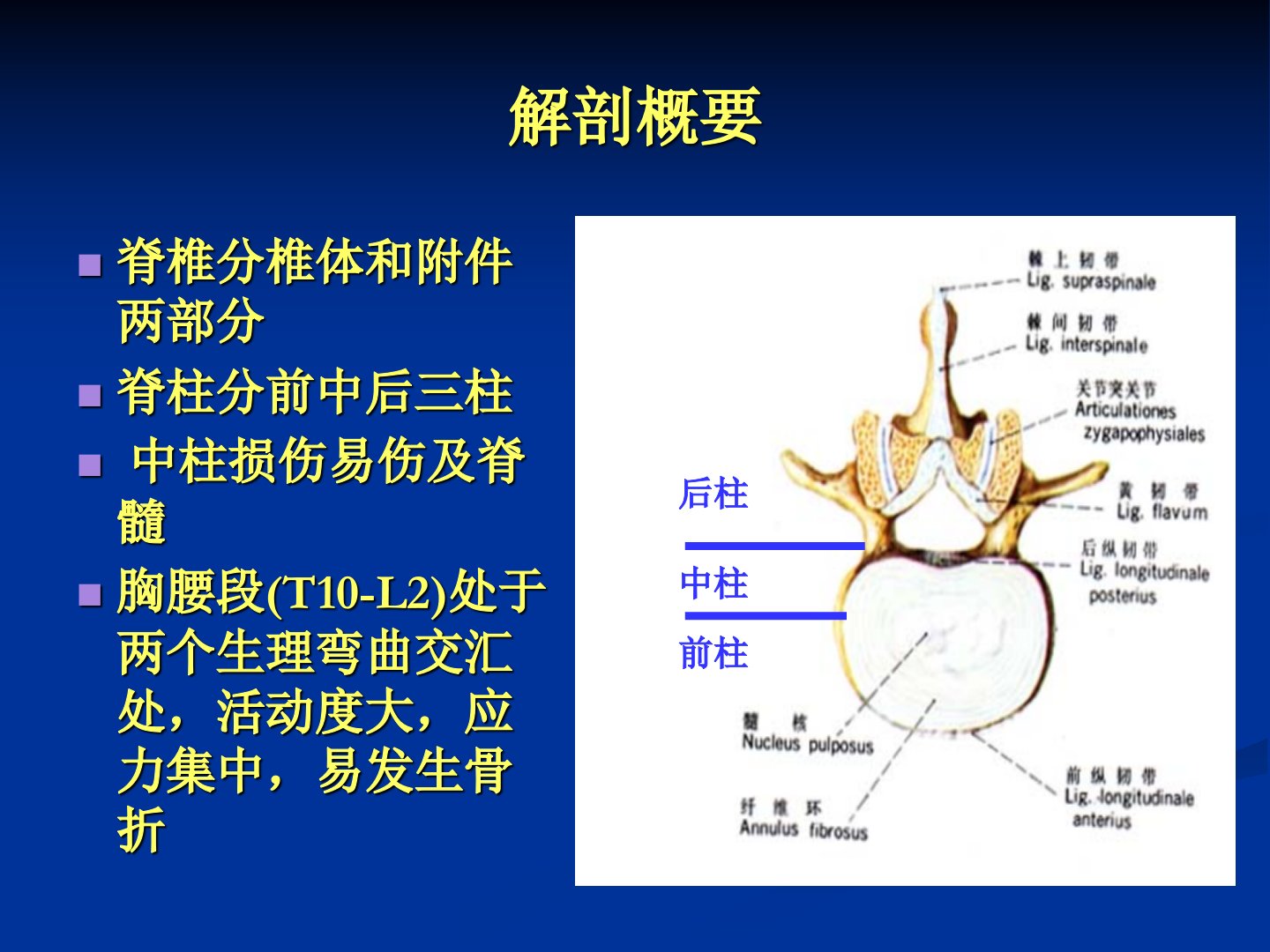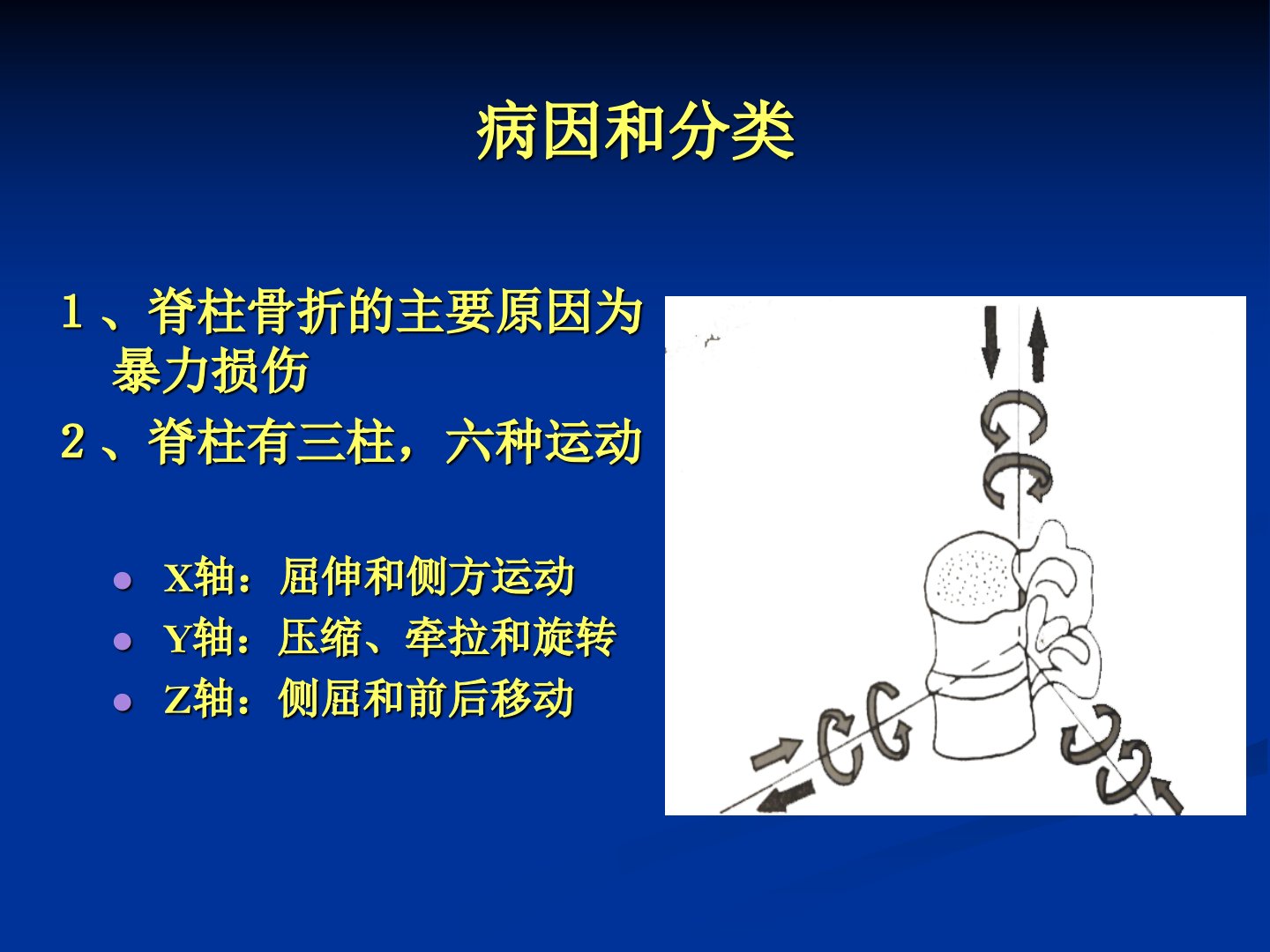 作为医生现将脊柱骨折相关要点总结如下:脊柱分椎体和附件分前中后三柱中柱损伤易伤及脊髓。胸腰段活动度大、应力集中易骨折。病因主要为暴力损伤脊柱有三柱六种运动。胸腰椎骨折分类包括单纯性楔形压缩性骨折、稳定性爆裂型骨折等多种类型各有不同损伤机制和特点。颈椎骨折分类有屈曲型损伤、垂直压缩所致损伤等多种。临床表现上患者有严重外伤病史主要症状有局部疼痛、站立及翻身困难等。检查时需详细询问病史注意有无合并伤影像学检查有助于明确诊断。治疗方面胸腰椎损伤压缩骨折等不同情况有保守或手术治疗选择。颈椎骨折脱位分上、下颈椎损伤也有各自对应治疗方式。脊髓损伤是脊柱骨折严重并发症有不同病理和临床表现可通过多种方式诊断治疗包括非手术和手术治疗同时要注意并发症防治。