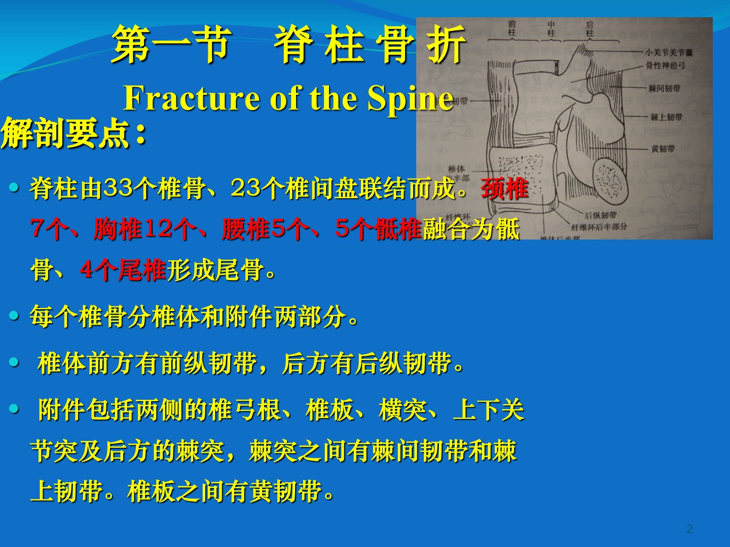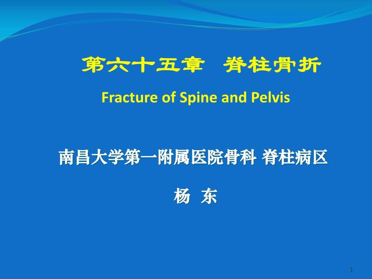 第六十五章脊柱骨折摘要南昌大学第一附属医院杨东医生阐述了脊柱骨折相关内容。脊柱由33个椎骨、23个椎间盘联结每个椎骨分椎体和附件。脊柱三柱理论将脊柱分为前柱、中柱、后柱。脊柱骨折多因外力超过承载能力致结构破坏占全身骨折56胸腰段(T10L2)多见可损伤脊髓、马尾神经颈椎骨折脱位更危险。病因与分类上暴力是胸腰椎骨折主因老年骨质疏松患者可能发生病理性骨折。颈椎骨折分屈曲型等四类;胸腰椎骨折分稳定性与不稳定性骨折各有不同损伤特征。诊断需结合损伤情况、临床表现和辅助检查规范格式含解剖学部位等三方面。治疗原则包括垫枕、卧硬板床等保守治疗及前路、后路手术等手术治疗。脊髓损伤是严重并发症有多种损伤类型与综合征可用截瘫指数表示功能丧失程度。并发症有呼吸衰竭等需采取相应防治措施。手术指征包括脊柱骨折脱位有关节突交锁等情况。