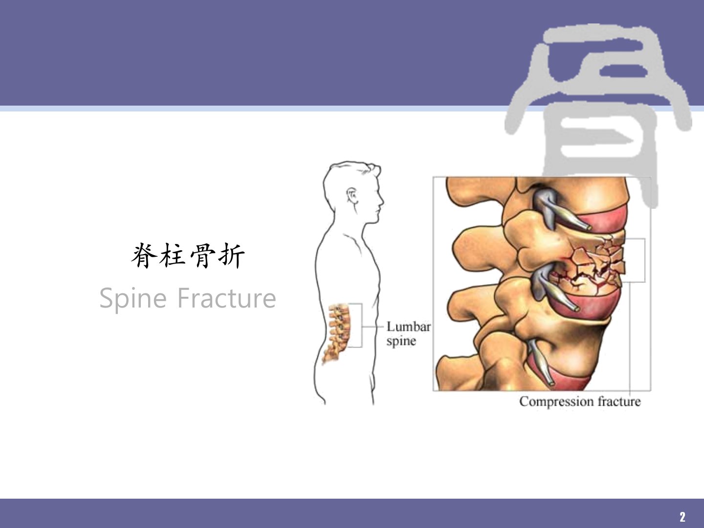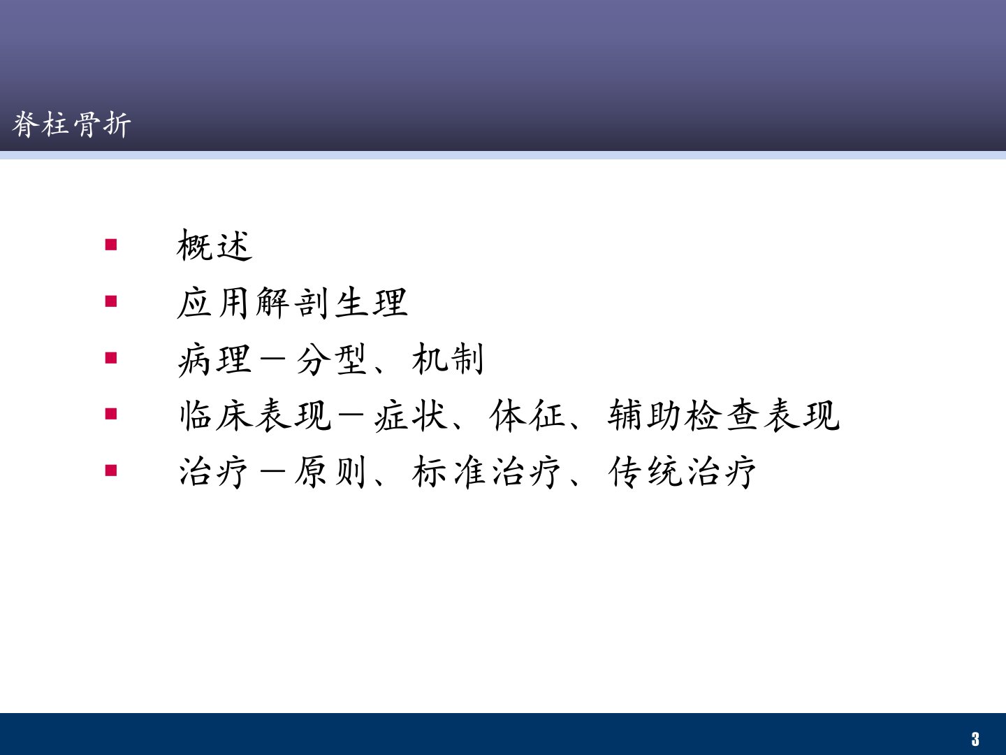 伤科学脊柱骨折概述脊柱骨折脱位(脊柱脊髓损伤)是骨科常见损伤发病率虽低但影响大、后遗症严重男性青壮年多见多由强大暴力所致。应用解剖生理脊柱由33个椎骨构成具负重、运动等多种功能。椎骨有共性与不同部位特殊性如颈椎寰椎无椎体等。椎骨连接包括椎间盘、前纵韧带等。脊柱平衡有脊柱三柱理论脊髓与脊柱有对应关系。病因病理受伤机理有直接暴力(少见)和间接暴力间接暴力包括屈曲型(发生率高多为胸腰段屈曲压缩损伤)、伸直型、垂直压缩型、水平剪切暴力(屈曲牵张型)、侧屈型、屈曲旋转型、撕脱型损伤。临床分型多样按稳定性、机制、累及范围、椎管狭窄等分类。附件骨折有不同类型。临床诊断有外伤史局部疼痛、压痛等症状有后突等畸形体征X线、CT或MRI、神经电生理检查可辅助诊断。治疗原则与方法1治疗原则:确定是否合并其他损伤及脊柱稳定性根据情况选择保守或手术治疗;急性脊髓损伤要药物治疗;治疗包括复位矫形、椎管扩容减压、固定融合及用药。2治疗方法:急救注意搬运等;颈椎骨折脱位有枕颌带牵引等多种治疗方式;胸腰椎骨折脱位分稳定性屈曲型、不稳定屈曲骨折、伸直型骨折等不同治疗;手术治疗目的是重建脊柱稳定性、施行脊髓神经减压。