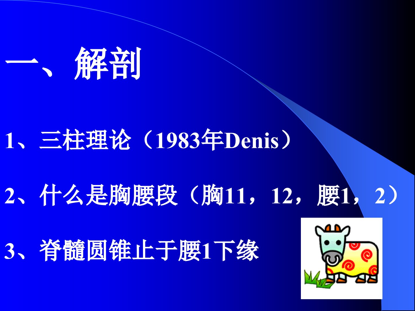 脊柱骨折摘要脊柱骨折相关要点如下:1解剖:基于Denis1983年提出的三柱理论需明确胸腰段指胸11、12及腰1、2脊髓圆锥止于腰1下缘。2分类:分为单纯压缩、稳定性爆裂骨折、不稳定性爆裂骨折、Chance骨折(安全带骨折)、屈曲牵拉、骨折脱位等类型。颈椎骨折又分屈曲损伤(半脱位、双侧椎间关节脱位、单纯压缩骨折)、垂直压缩损伤(环椎损伤即Jafferson骨折、爆裂骨折)、过伸损伤(过伸损伤、环椎椎弓骨折即Hangman骨折)及机制不明的齿状突骨折。3诊断:依据病史、疼痛、畸形、功能障碍结合X线片、CT、MRI检查合并脑、胸腹外伤或未做特殊体位拍片易漏诊。4搬运:遵循平托搬运、滚动翻身原则。5治疗:稳定骨折(压缩小于12、附件骨折)保守治疗;不稳定骨折(压缩大于12、骨折脱位、两柱以上爆裂骨折)需手术治疗如爆裂骨折减压固定、骨折脱位复位固定。