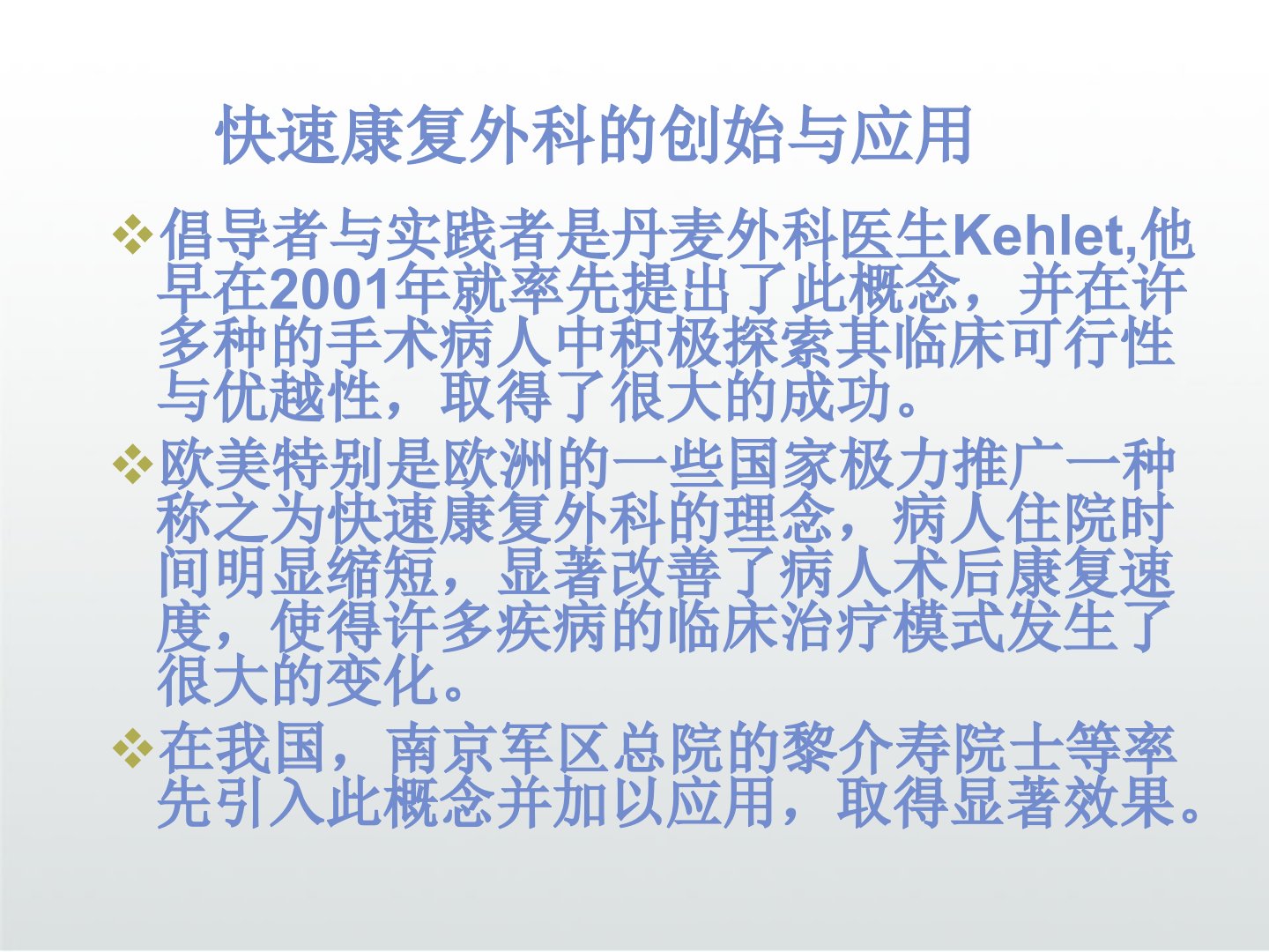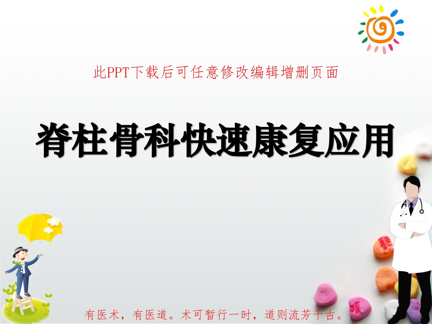 脊柱骨科快速康复应用摘要快速康复外科由丹麦医生Kehlet于2001年提出在欧美国家广泛推广大大缩短了病人住院时间改善了病人术后康复速度。我国南京军区总院的黎介寿院士率先引入此概念并应用取得显著效果。快速康复外科理念(FTS)指优化围术期处理措施减少术后并发症、缩短住院时间。其优点包括缩短住院日、减少并发症、降低再住院率、提供更有效的医疗服务、维护术后肌肉功能、保护瘦肉质群、减少术后肺功能损害、增强心血管功能、增加病人满意度、减少治疗费用等。FTS主要依靠麻醉、微创手术操作、围手术期护理三个环节实现。在脊柱科FTS主要适用于脊椎微创手术如椎间孔镜、椎间盘镜等。FTS要求多科协作优化麻醉方法局麻优先;采用微创手术操作减少炎性反应和软组织损伤;围手术期护理包括心理护理、缩短禁食时间、不常规肠道准备、超前镇痛、超前康复锻炼等。术后需注意体位、补液、早期进食、引流管护理和早期活动。快速康复理念体现了团队精神需要多方配合才能实现患者的快速康复。
