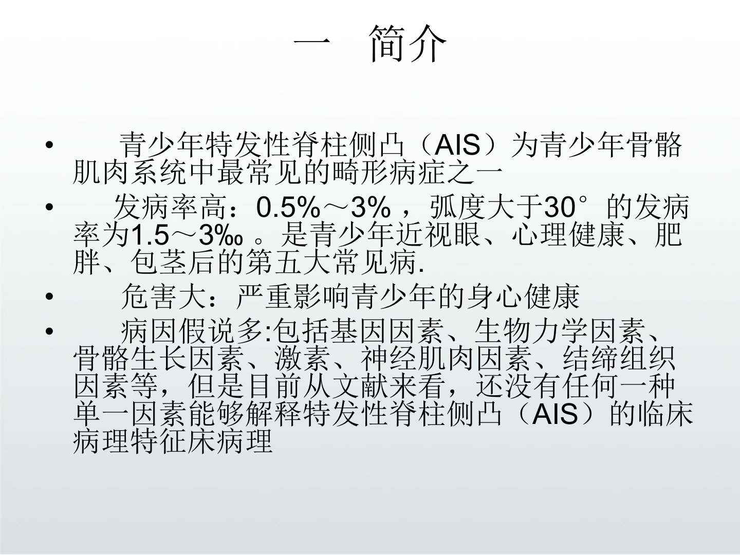 脊柱侧弯手法矫正治疗摘要本PPT聚焦青少年特发性脊柱侧凸(AIS)这是青少年骨骼肌肉系统常见畸形发病率高且危害大病因涉及基因、生物力学等多因素但尚无单一因素能解释其临床病理特征。在治疗上早发性患者治疗棘手既要矫正畸形又要保持脊柱生长能力。支具治疗依从性差、有效性存疑且副作用大;矫形手术只适合严重患者风险大。手法治疗则针对性强、见效快、安全且易操作。诊断时需判断阻力方向明确端椎、中立椎、稳定椎等测量COBB角、顶椎旋转度、顶椎偏移距离等。治疗手法选择遵循无痛优先等原则通过调整动力异常状态来治疗包括调曲法、定点运动松解法等直接、间接矫正法。治疗时要注意适应证与禁忌证不同侧弯情况有不同手法如胸段座位旋转扳法、俯卧位松解竖脊肌法等。同时治疗脊柱侧弯症要注意非结构性有效、结构性无效年龄和角度不同恢复难度不同治疗密集有利于恢复矫正要点包括检查长短脚、骨盆错位等。此外还可通过颈椎牵引、倒立悬挂、单杠悬吊等辅助锻炼治疗。
