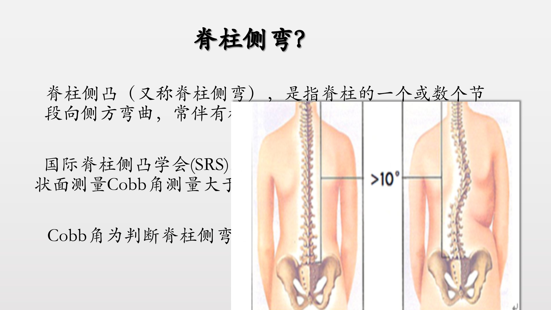 脊柱侧凸(又称脊柱侧弯)指脊柱向侧方弯曲且伴有椎体旋转的三维畸形。国际脊柱侧凸学会SRS定义为:Cobb角大于10度即为脊柱侧凸。正常成人脊柱由26块椎骨组成正面观察为直线侧面有四个生理弯曲。病因上特发性脊柱侧弯占80以上病因不明;先天性脊柱侧弯占510由先天因素导致;还有部分特殊疾病如小儿麻痹等也可引起。临床表现包括双肩不等高、后背隆起等。危害包括影响身高发育、改变负重力学、压迫心肺功能以及导致自卑心理。检查包括物理检查和影像检查。治疗上侧弯角度10度以内可进行脊柱伸展姿势训练和矫正体操;1020度加用侧方电刺激;2040度佩戴矫形器;40度以上或旋转畸形严重者应手术。早发现、早矫治是关键。