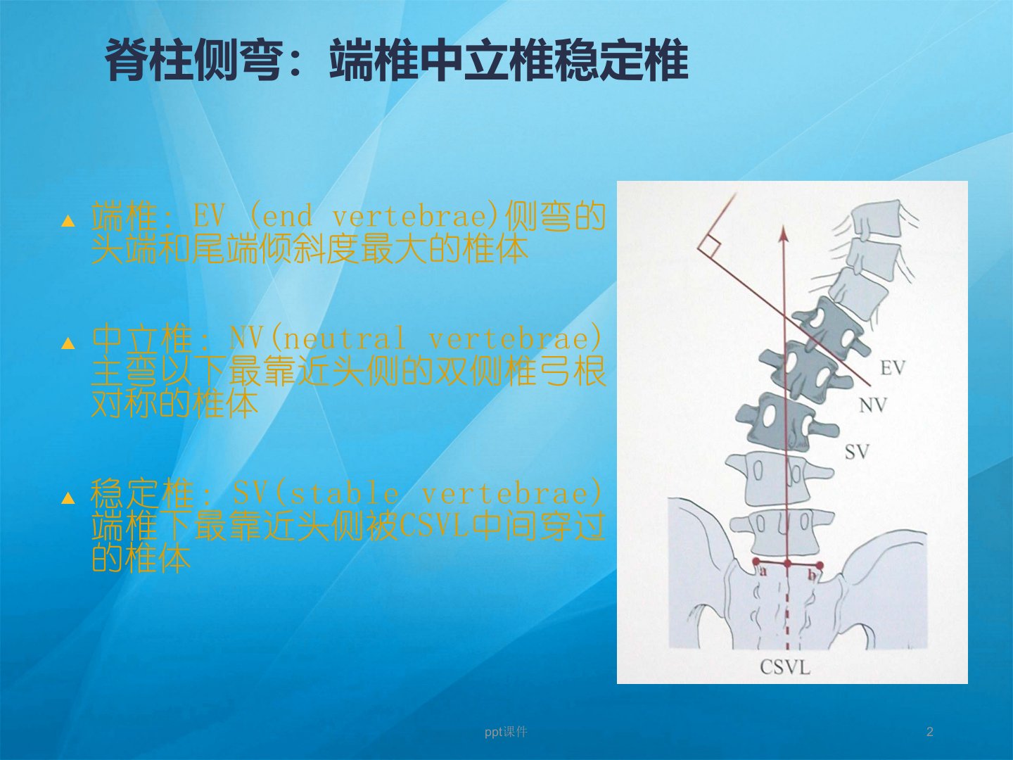 脊柱侧弯基础知识摘要该ppt课件聚焦脊柱侧弯涵盖多个关键方面:1基础概念:端椎是侧弯头尾端倾斜度最大椎体;中立椎是主弯下最靠近头侧、双侧椎弓根对称的椎体;稳定椎是端椎下最靠近头侧且被CSVL中间穿过的椎体。2测量指标:COBB角用于测量上胸弯、胸弯、胸腰段、腰段主弯侧弯;顶椎中心确定方法正常椎体用对角线交叉法楔变椎体用中点交叉法;顶椎偏移距离是顶椎或椎间隙中心与CSVL垂直距离;冠状面平衡通过CSVLC7PL偏移判断;顶椎旋转采用NashMoe分级分04级以凹侧椎弓根位置变化界定。3其他测量:矢状面需进行COBB测量明确胸腰段后凸角度、腰椎前凸角度并评估矢状面平衡。4Lenke分型:先确定侧弯位置、类型、顶椎位置区分结构弯(站立位正位COBB25且SideBendingCOBB25)和非结构弯;基本类型多样;还有修正内容涉及腰弯顶椎、矢状面胸椎后凸角度等并列举相关病例辅助理解。