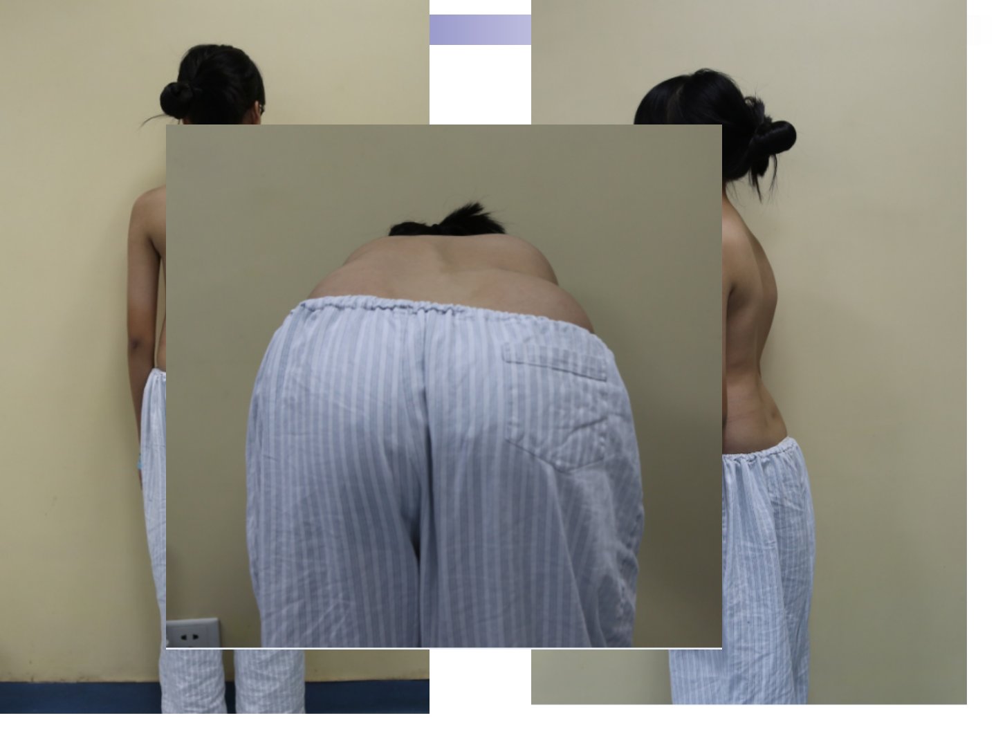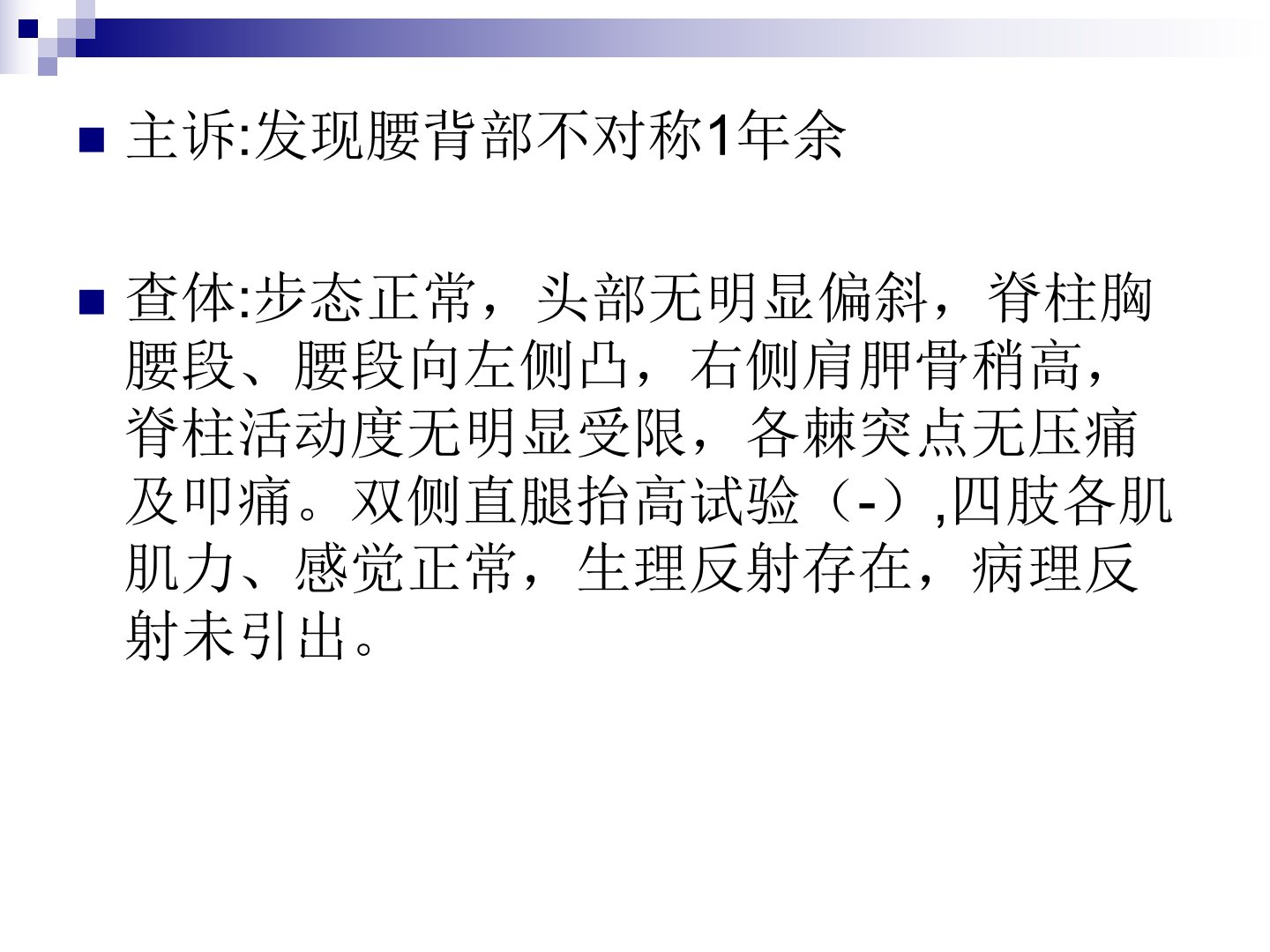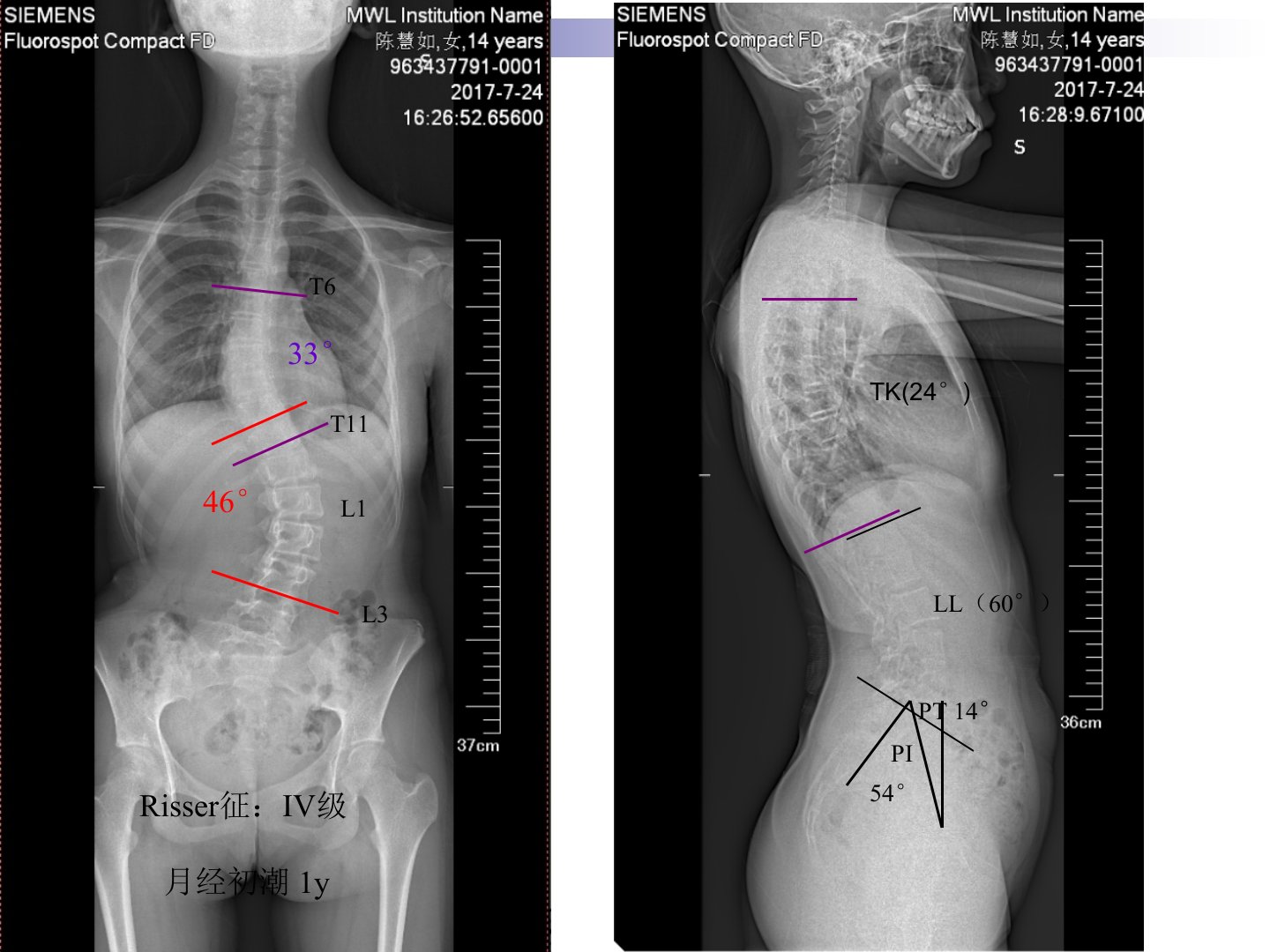 患者主诉腰背部不对称1年余来诊。查体显示其步态正常头部无明显偏斜脊柱胸腰段、腰段向左侧凸右侧肩胛骨稍高但脊柱活动度无明显受限各棘突点无压痛及叩痛。双侧直腿抬高试验正常四肢各肌肌力、感觉正常生理反射存在病理反射未引出。Risser征为IV级月经初潮1年。根据检查结果诊断为青少年特发性脊柱侧弯(Lenke5CN型)。针对此病症制定的手术策略为进行脊柱固定及融合手术其中固定及融合的近端节段为T11远端节段为L3以矫正脊柱侧弯恢复脊柱的正常形态和功能。
