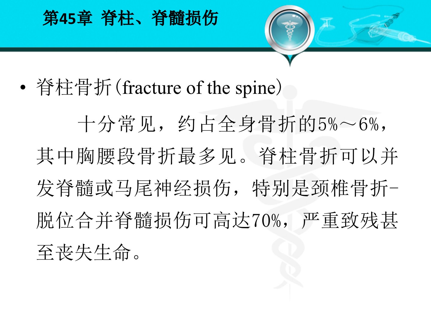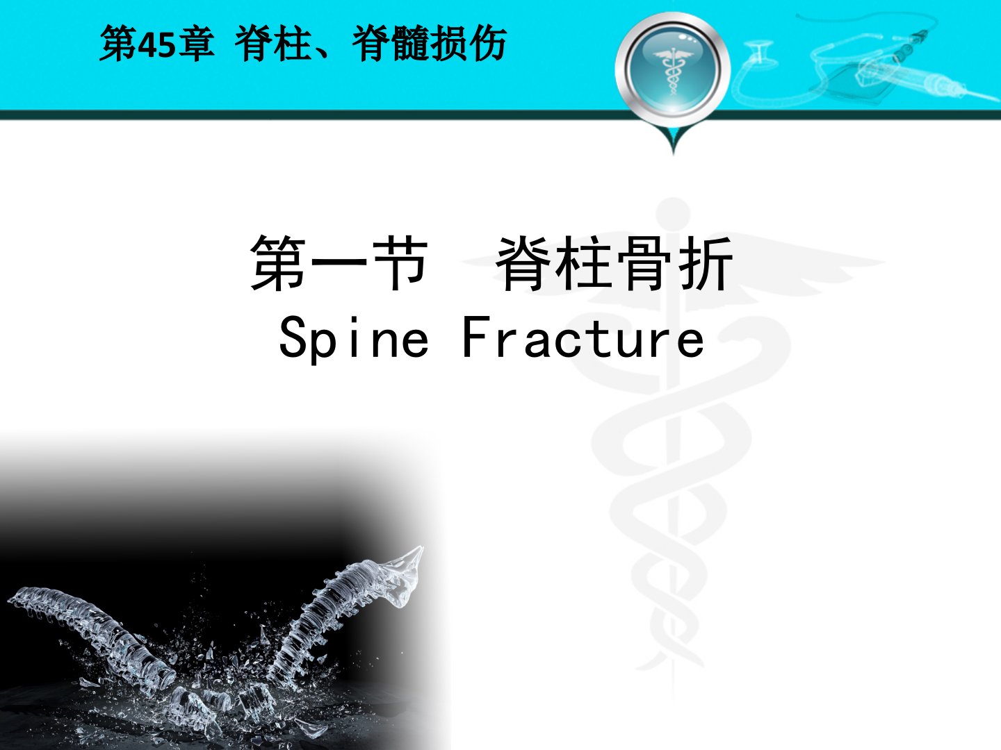 脊柱、脊髓损伤第一节脊柱骨折SpineFracture第45章脊柱、脊髓损伤脊柱骨折(fractureofthespine)十分常见,约占全身骨折的5%~6%,其中胸腰段骨折最多见。脊柱骨折可以并发脊髓或马尾神经损伤,特别是颈椎骨折-脱位合并脊髓损伤可高达70%,严重致残甚至丧失生命。第45章脊柱、脊髓损伤三柱学说(threecolumn)Louis(1977)Denis(1983)第45章脊柱、脊髓损伤脊柱骨折分类颈椎骨折分类胸腰椎骨折分类一二第45章脊柱、脊髓损伤1.屈曲型损伤(1)压缩型骨折:较为多见(2)骨折-脱位(一)颈椎骨折分类第45章脊柱、脊髓损伤2.垂直压缩型损伤(1)Jeff...