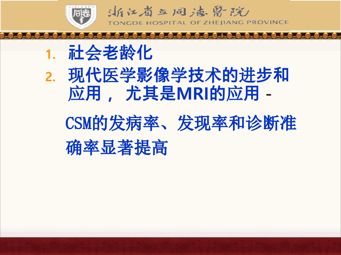 颈椎病是骨科常见病其中脊髓型颈椎病(CSM)危害最大。随着社会老龄化及医学影像学进步CSM诊断率显著提高。其诊断标准包括颈髓损害临床表现、影像学证实颈椎退变及骨赘压迫脊髓并排除其他类似疾病。CSM发病机理涉及骨赘压迫、血管受压及颈椎不稳等。治疗上目前尚无解除脊髓压迫的药物原则上确诊后应及时手术以颈前路手术为主颈后路手术仅适用于特定情况。手术方法包括颈前路减压植骨融合术、Cage植入术及植骨钢板系统内固定术其中后者结合钢板内固定系统具有减压彻底、稳定性好等优点。康复治疗目标为消除症状、恢复正常功能总原则是针对各型特点采用综合治疗非手术疗法为主症状明显或病情较重者考虑手术。常用康复方法包括颈椎牵引、卧床休息、物理治疗、传统治疗、运动疗法及颈部矫形器等。