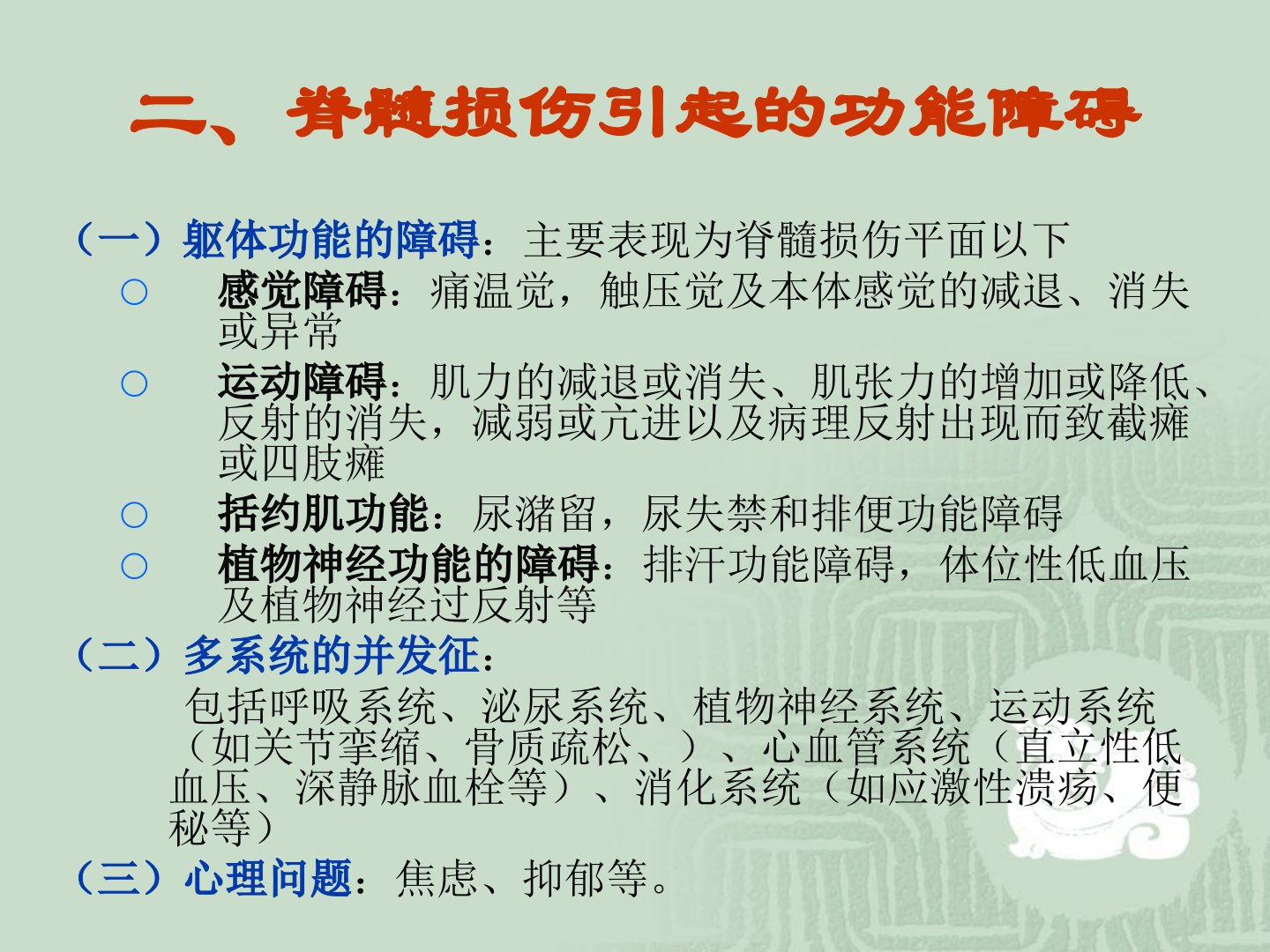 脊髓损伤骨科李倩摘要本文概述了脊髓损伤的定义、分类及其造成的功能障碍。脊髓损伤由多种致病因素导致可造成患者终生残疾给家庭和社会带来重大负担是康复医学主要病种之一。功能障碍包括:躯体功能(感觉、运动、括约肌及植物神经功能障碍)、多系统并发症(呼吸、泌尿、植物神经、运动、心血管、消化系统问题)及心理问题(焦虑、抑郁)。康复评定采用ASIA标准包括脊髓损伤水平、运动与感觉评分及损伤程度分类。康复目标制定注重重获日常生活活动能力、独立解决问题能力以及社会适应和就业能力的恢复。康复治疗分阶段进行早期包括急救、预防并发症及基础训练中后期强化肌力、平衡等体能性训练进行轮椅技巧、站立步行训练等。并发症防治方面呼吸功能障碍需及时清除气道内分泌物加强呼吸功能训练;泌尿系统并发症关键是低压膀胱并保持膀胱容量选择合理排尿方式;压疮处理关键是预防定时翻身;植物神经过反射需紧急处理避免严重后果。