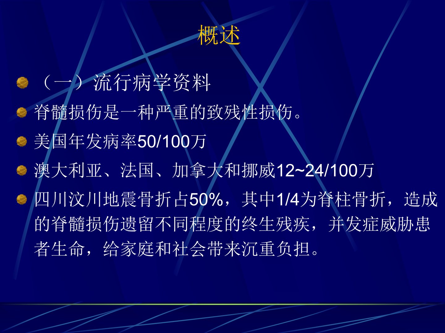脊髓损伤康复摘要本文四川中医药高等专科学校李秀坤围绕脊髓损伤康复展开涵盖多方面内容。1流行病学与解剖生理:脊髓损伤是严重致残性损伤多国及我国汶川地震有相关发病率数据。文中介绍了脊柱、脊髓的解剖结构包括椎体、脊髓节段分布脊髓神经、交感神经节、运动神经终板及脊髓血供特点等。2基本概念与病因:阐述了脊髓损伤定义、按损伤程度和平面的分类常见原因包括外伤性和非外伤性。3病理生理与临床表现:介绍了血管学说等病理生理理论临床表现有脊髓休克、运动感觉排便障碍等共同性表现以及脊髓横断面不同部位损伤的表现。4辅助检查与临床治疗:辅助检查有X线、CT、MRI、体感诱发电位等。临床治疗原则为早期救治等方法包括急诊处理、牵引、药物、手术、高压氧及康复治疗等。5康复评定与治疗:评定包括损伤、运动、感觉功能及ADL评定。康复治疗分急性期和恢复期急性期尽早开始训练防并发症恢复期进行物理、肌力等多方面训练。6康复预后和预防:脊髓休克、正确治疗、损伤平面影响预后。预防分三级一级预防残损二级预防残疾三级预防残障。