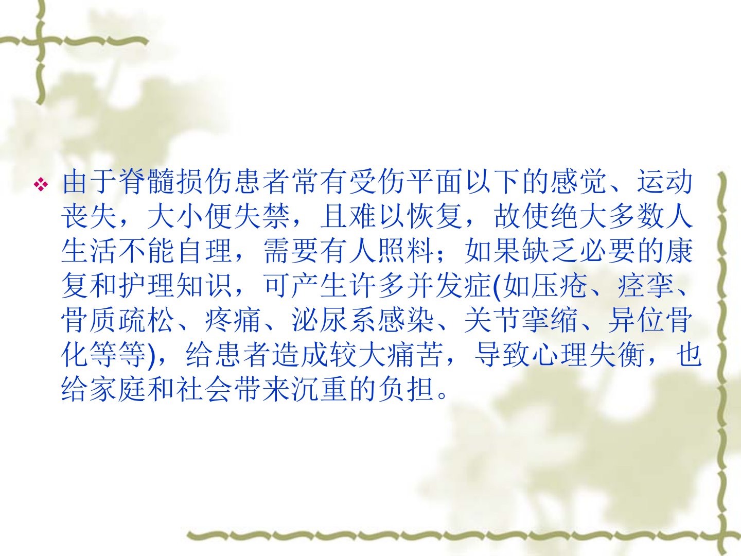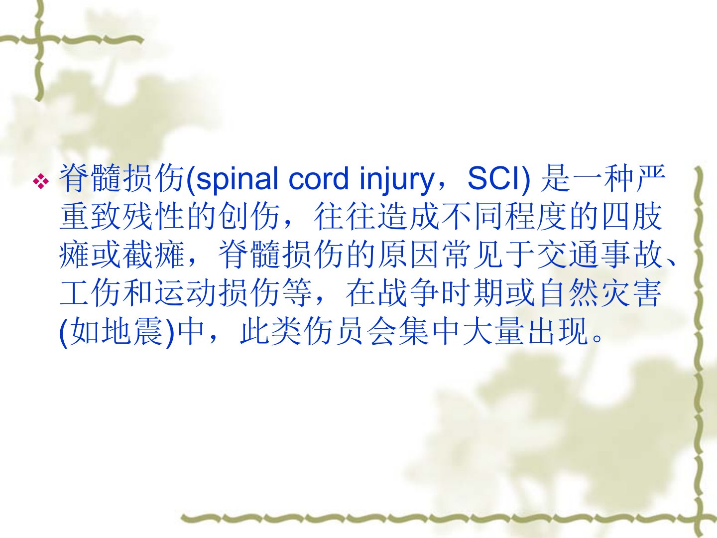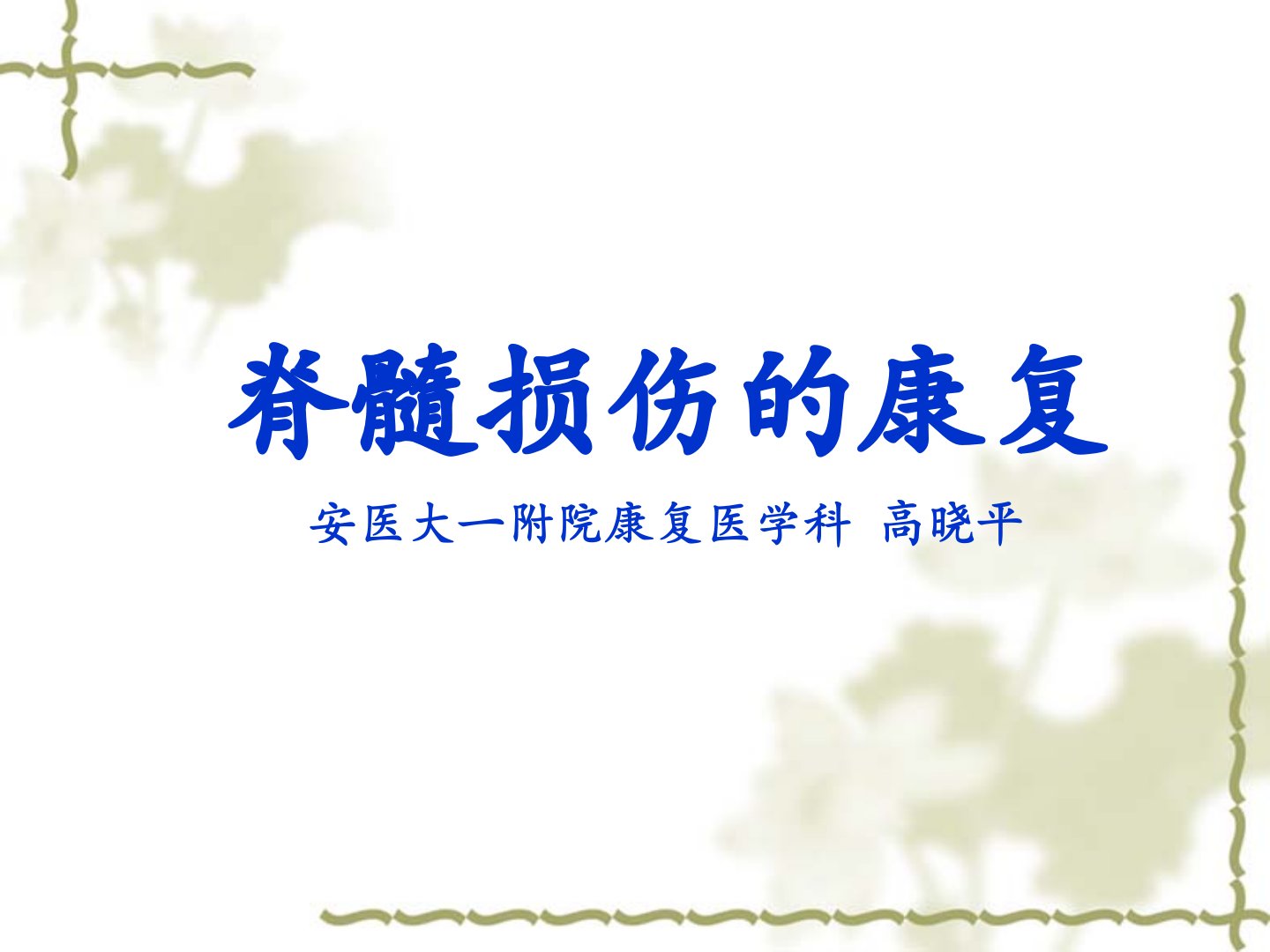 安医大一附院康复医学科高晓平指出脊髓损伤患者常面临感觉、运动丧失及大小便失禁等问题生活难以自理且易产生多种并发症给患者、家庭和社会带来沉重负担。脊髓损伤病因包括获得性和发育性病因以及外伤。康复评定包括损伤水平、程度、平面与功能预后的评定其中损伤程度评定以最低骶节S45有无残留功能为准同时介绍了美国脊髓损伤学会ASIA的损伤分级。评定结果对指导康复治疗非常重要如C4患者高度依赖L35患者基本自理。介绍了治疗性步行、功能性步行等几种步行概念。康复治疗包括早期急救处理、早期康复的概念与分期、早期和中后期康复训练。另外脊髓损伤常伴大小便障碍排便排尿均需特殊训练和管理。脊髓损伤还易引发运动系统、呼吸系统、心血管系统并发症及压疮需通过康复治疗和护理进行预防。