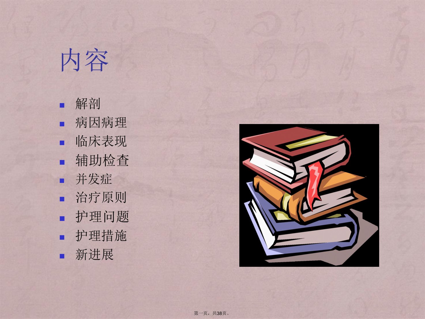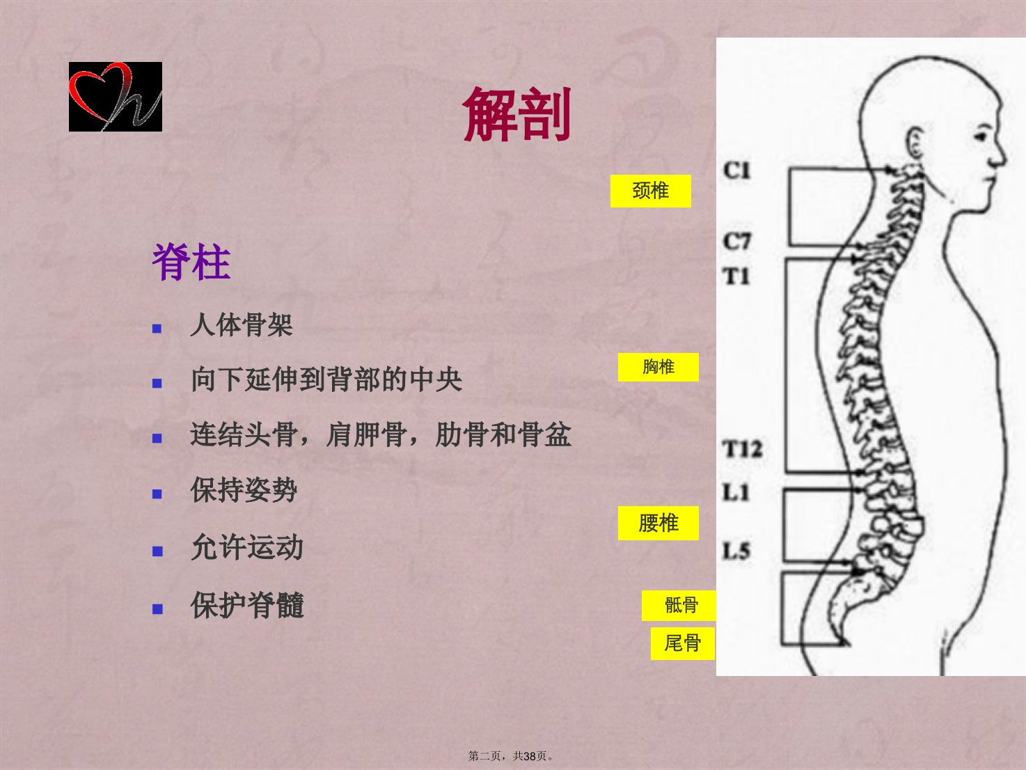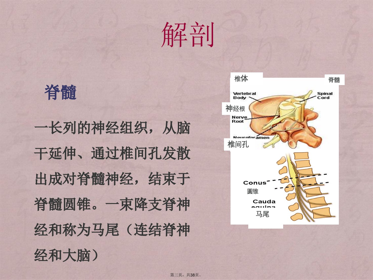 脊髓损伤摘要解剖与病因脊柱由颈椎、胸椎、腰椎、骶骨和尾骨构成保护脊髓并允许运动。脊髓损伤多由外力导致脊柱骨折脱位引发运动、感觉和括约肌功能障碍。常见原因包括交通意外(4050)、体育运动和斗殴(各1025)、跌倒(20)。病理与分类脊髓损伤分为原发性和继发性。原发性由外力直接或间接造成;继发性则由脊髓水肿、血肿、骨折或椎间盘组织压迫脊髓导致进一步损害。临床表现与并发症脊髓损伤表现为脊髓震荡、脊髓挫伤、脊髓受压、脊髓断裂和马尾神经损伤等。常见并发症包括瘫痪、呼吸道并发症、泌尿系感染和结石、皮肤压疮、体温异常、腹胀和便秘等。治疗原则与护理治疗包括固定、解除脊髓受压、减轻脊髓水肿、高压氧治疗和应用激素等。初期处理需开放气道、保证呼吸和血液循环功能。护理方面需关注压疮预防、定时翻身按摩、保持皮肤干爽清洁;对高位颈髓损伤患者要特别注意呼吸功能维护。新进展干细胞移植治疗脊髓损伤、清洁导尿摆脱长期留置尿管痛苦、VSD伤口负压引流促进伤口生长等为脊髓损伤治疗提供了新方向。